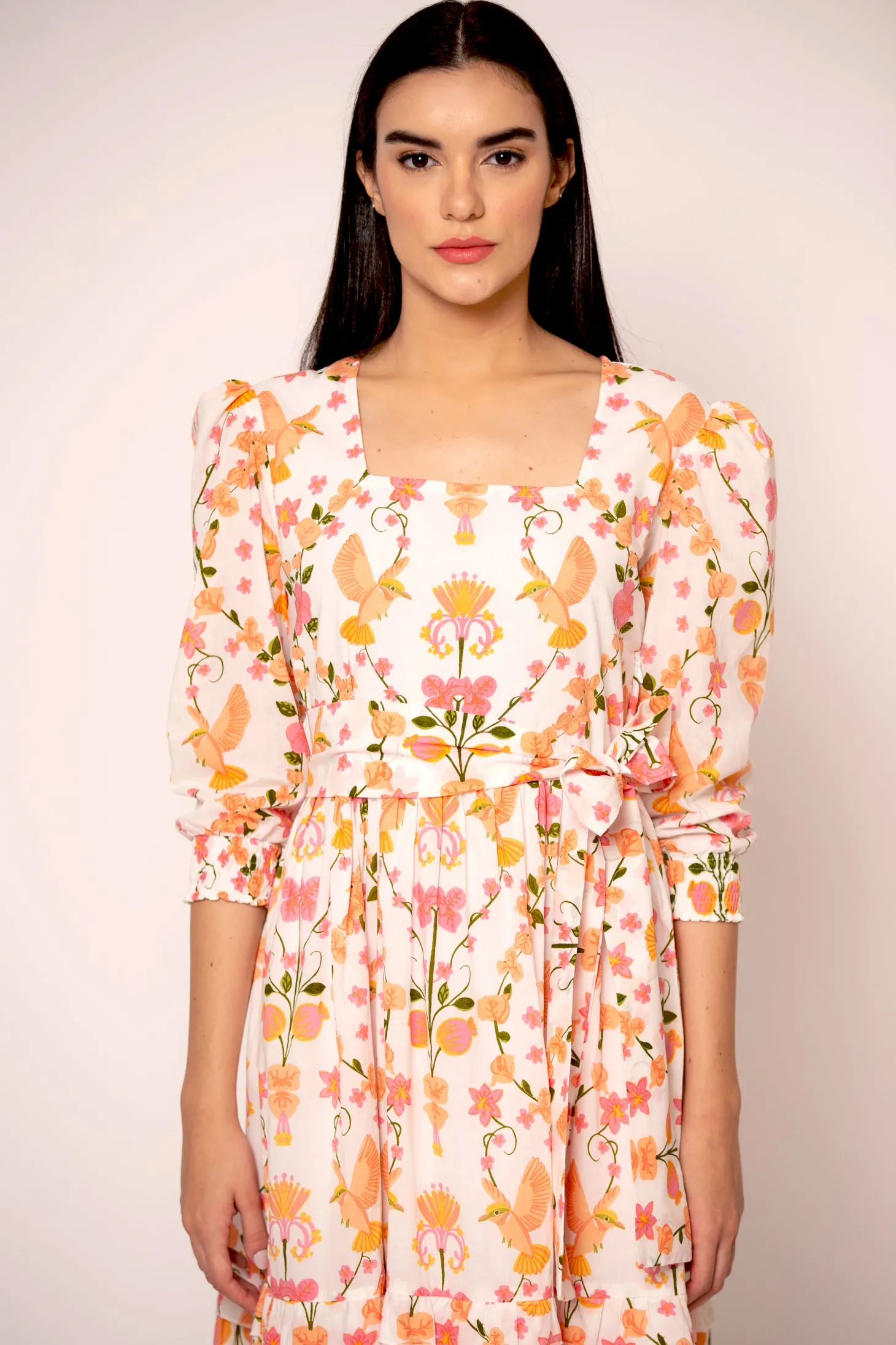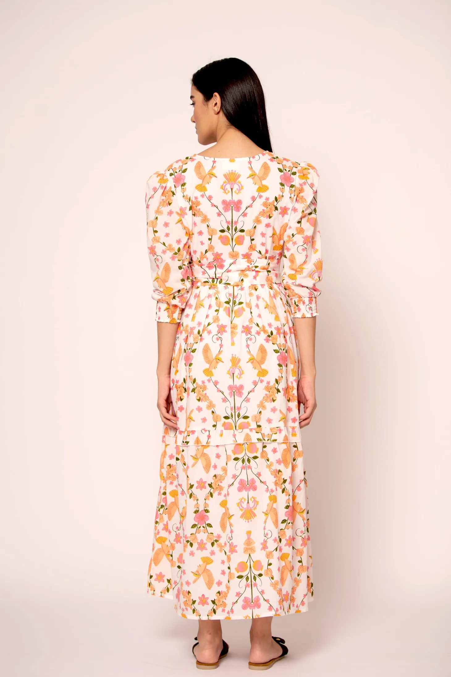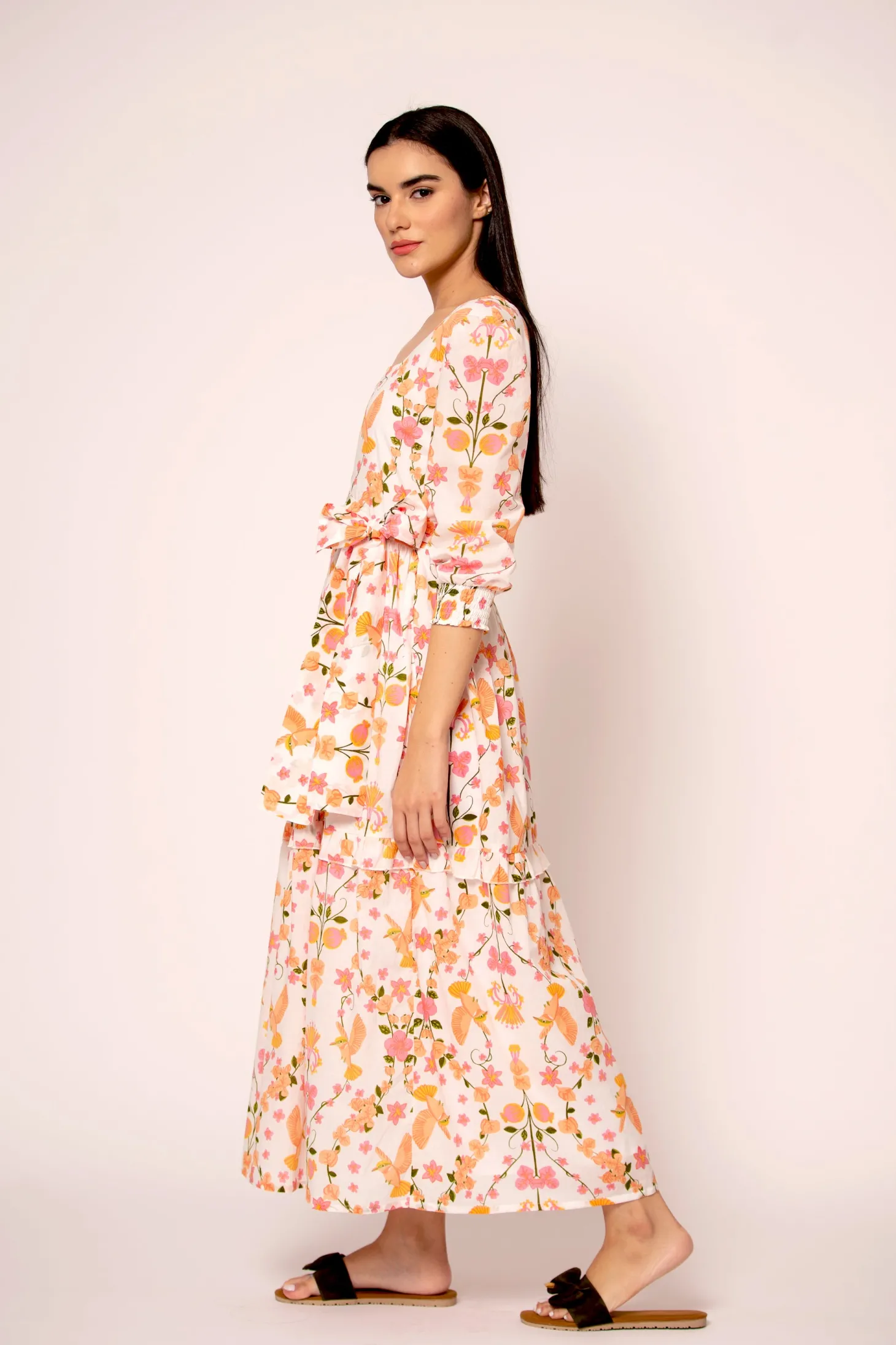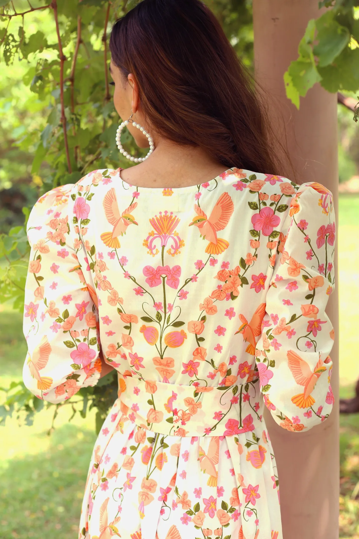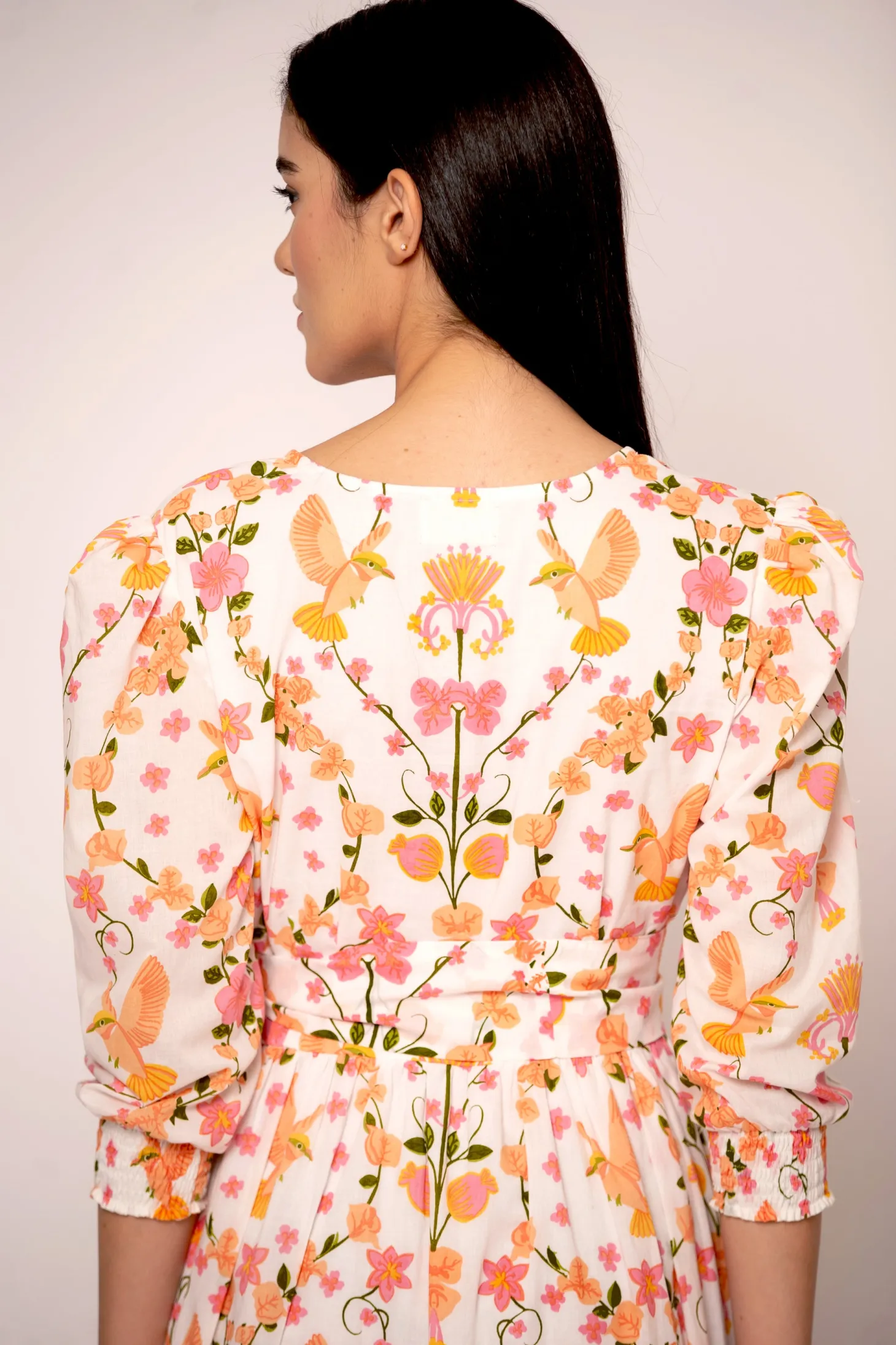 Poppy is a lovely choice for a festive day outing. It features slightly puffed sleeves with smocked cuffs, a flattering neckline, fitted top and A-line skirt. Poppy is made from a soft, breathable cotton cambric fabric that will keep you cool on a hot summer day. The vibrant artwork is inspired by the romantic nostalgia of Pondicherry’s French mansions with patios covered in pink and peach bougainvilleas.