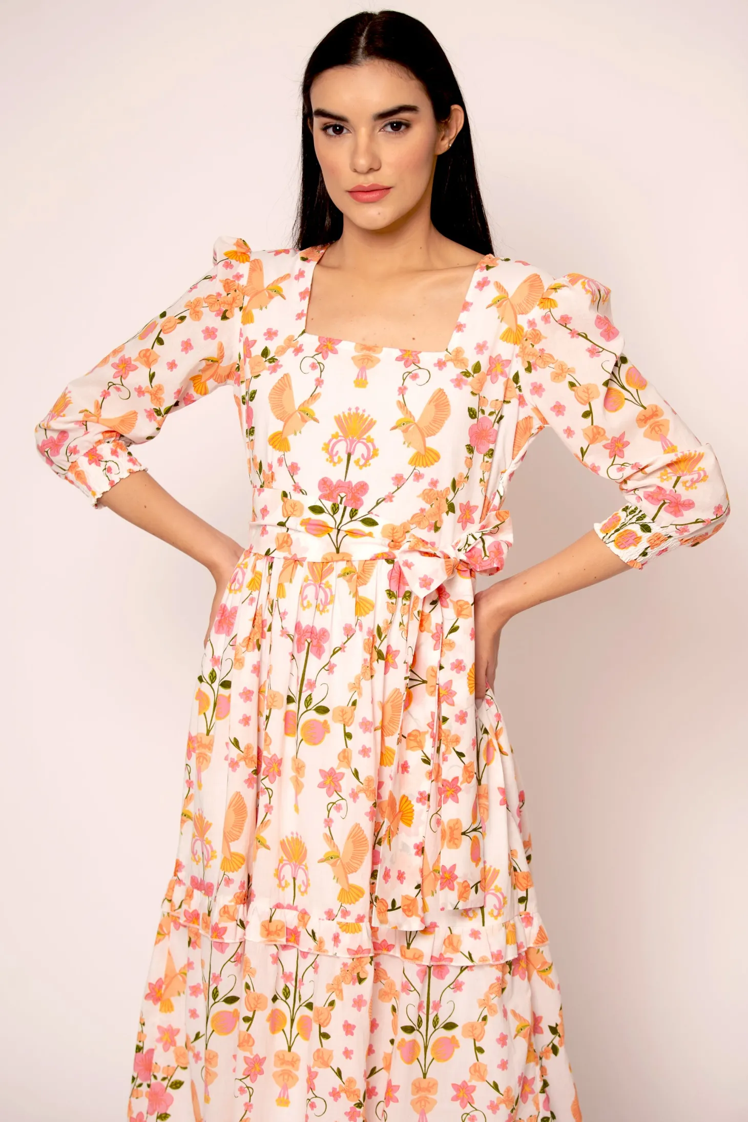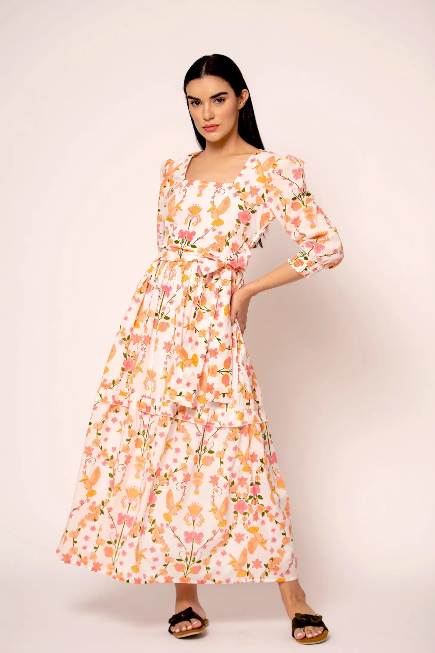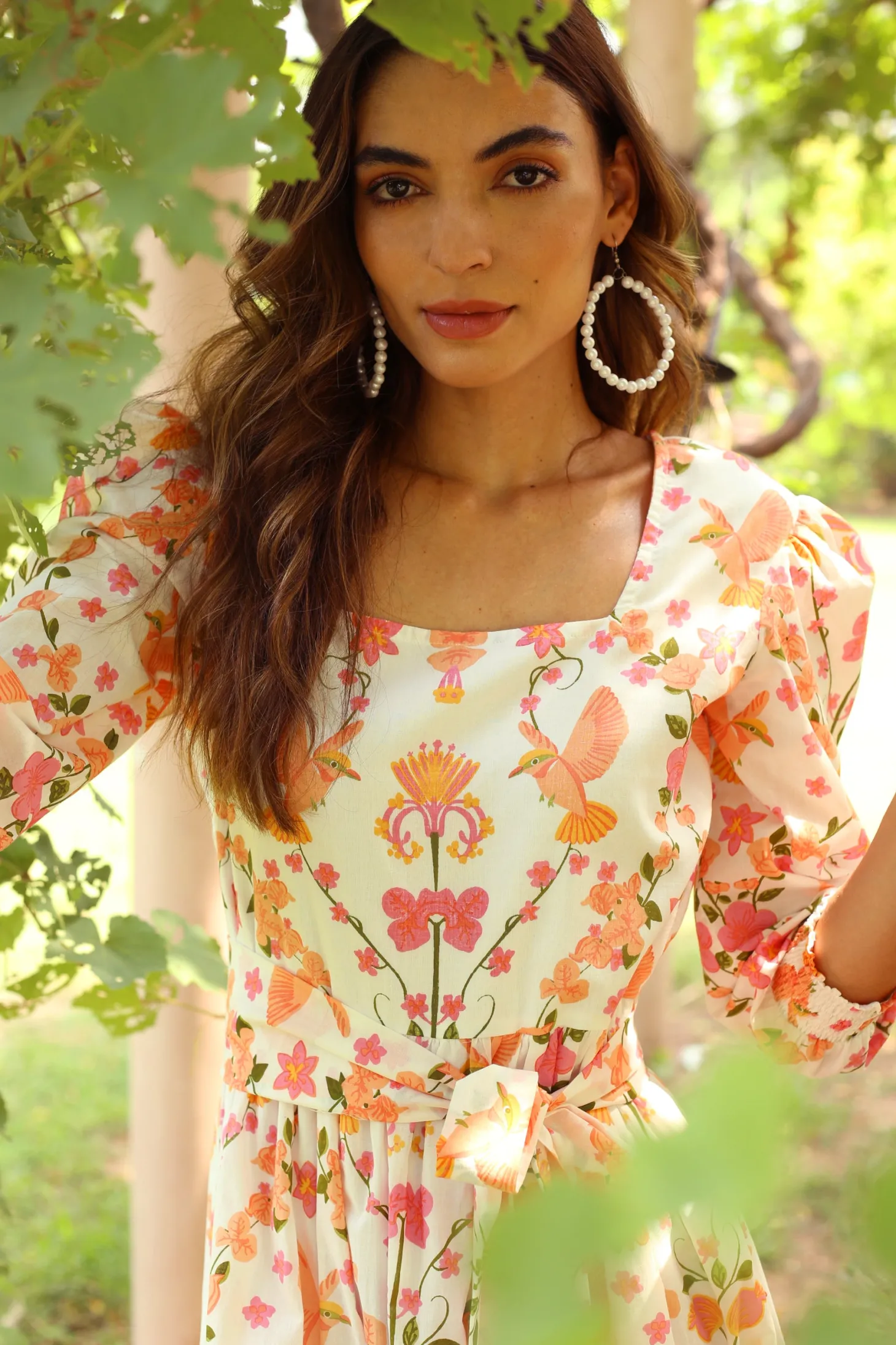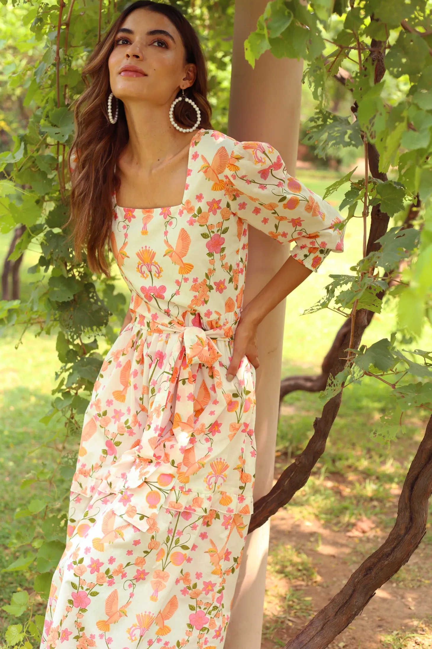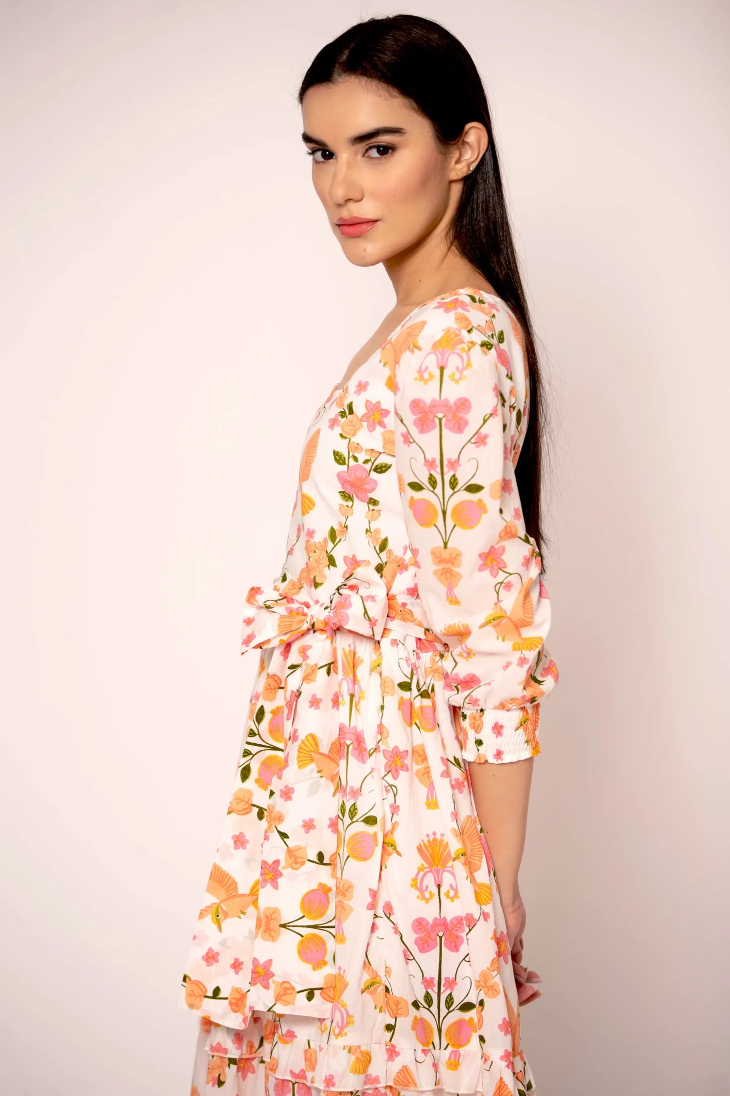 Poppy is a lovely choice for a festive day outing. It features slightly puffed sleeves with smocked cuffs, a flattering neckline, fitted top and A-line skirt. Poppy is made from a soft, breathable cotton cambric fabric that will keep you cool on a hot summer day. The vibrant artwork is inspired by the romantic nostalgia of Pondicherry’s French mansions with patios covered in pink and peach bougainvilleas.