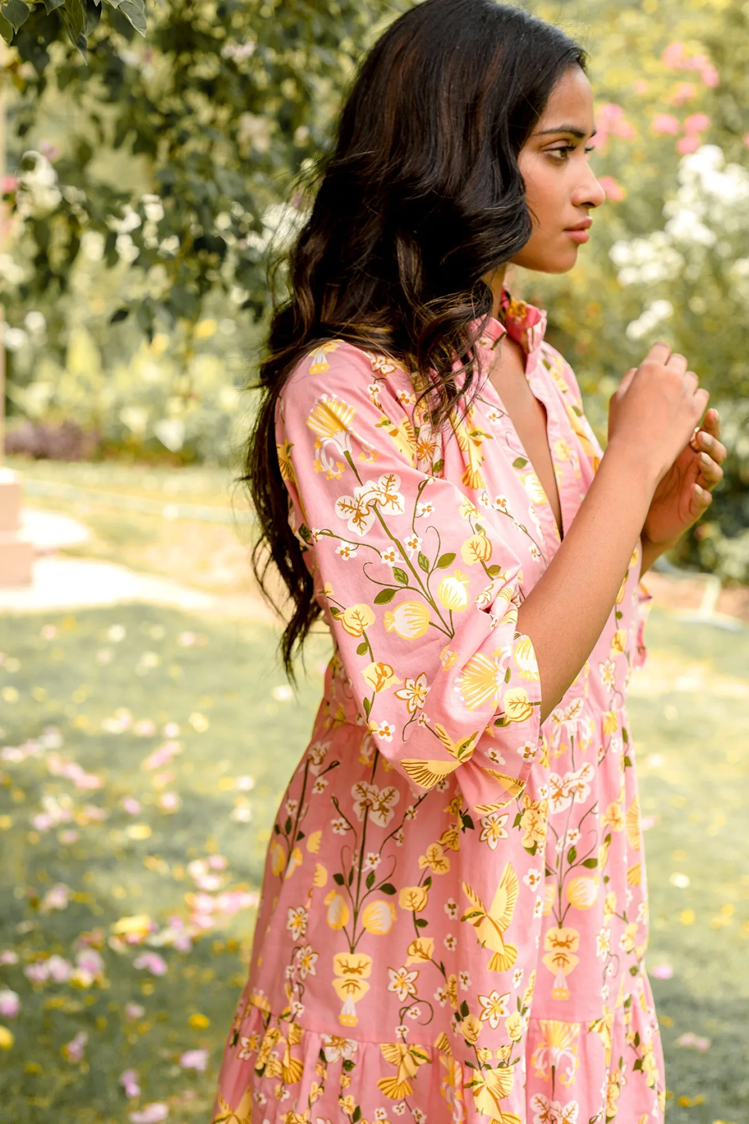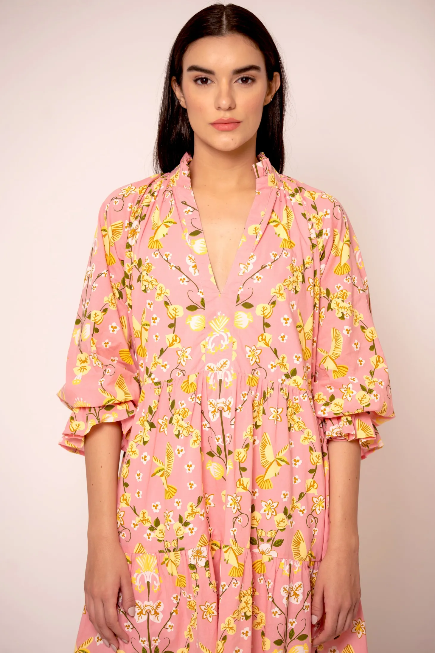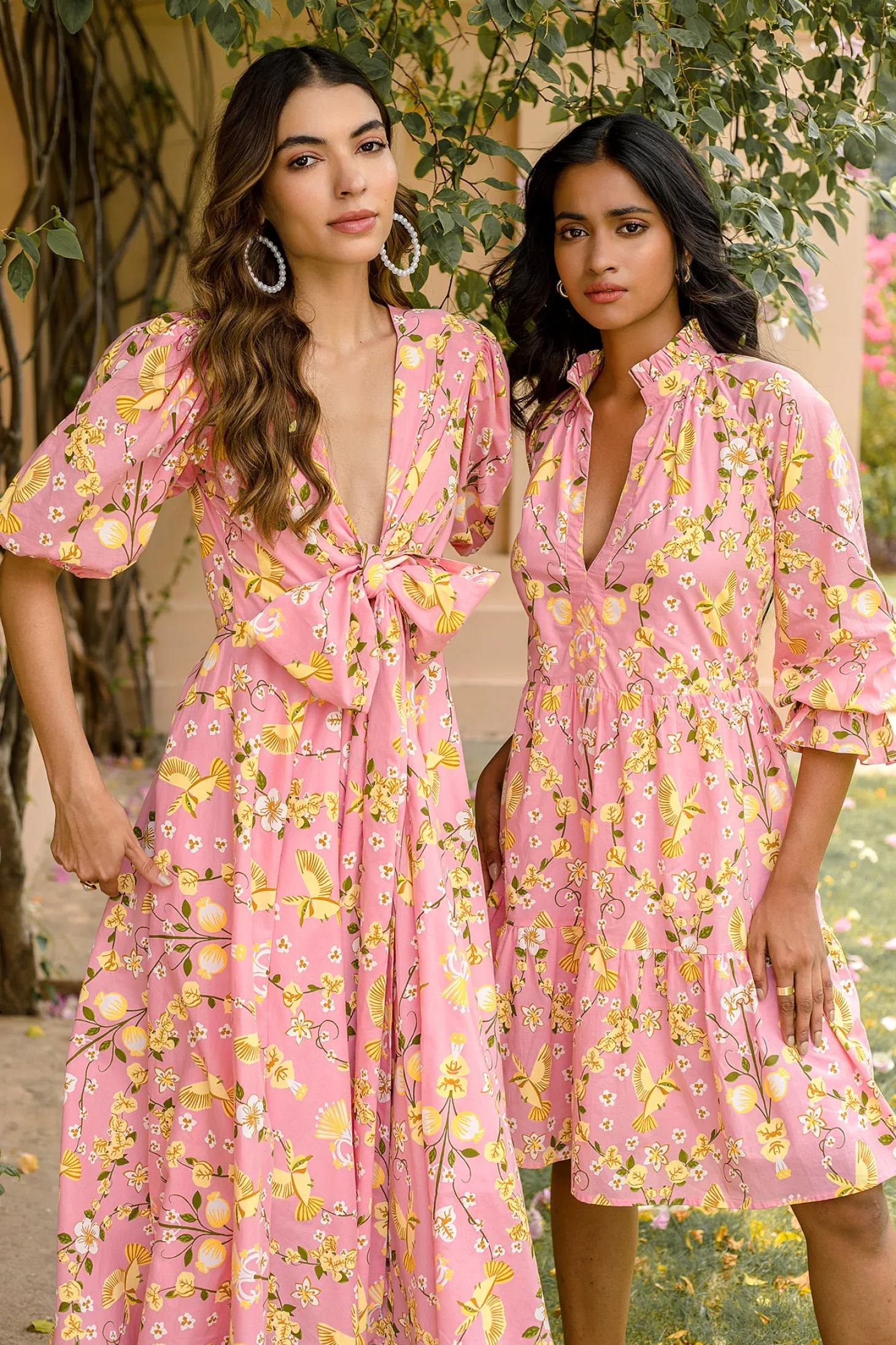 The Juliet is a flirty and effortless silhouette featuring a V-neckline and billowing sleeves. The pleats at the neck and tiered bottom give it an elegant touch. Juliet is made from a soft, breathable cotton cambric fabric that will keep you cool on a hot summer day. The vibrant artwork is inspired by the romantic nostalgia of Pondicherry’s French mansions with patios covered inpink and peach bougainvilleas.