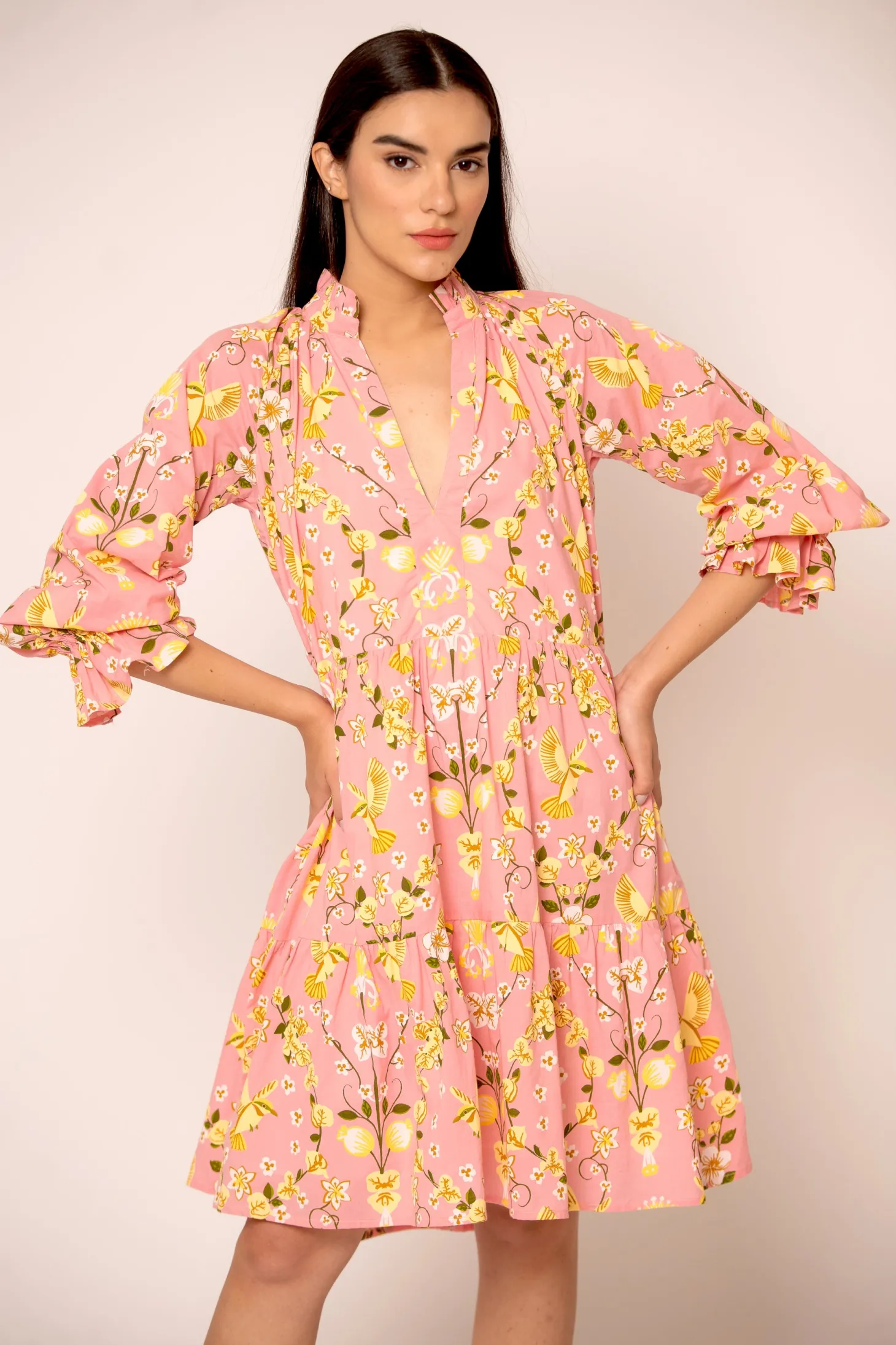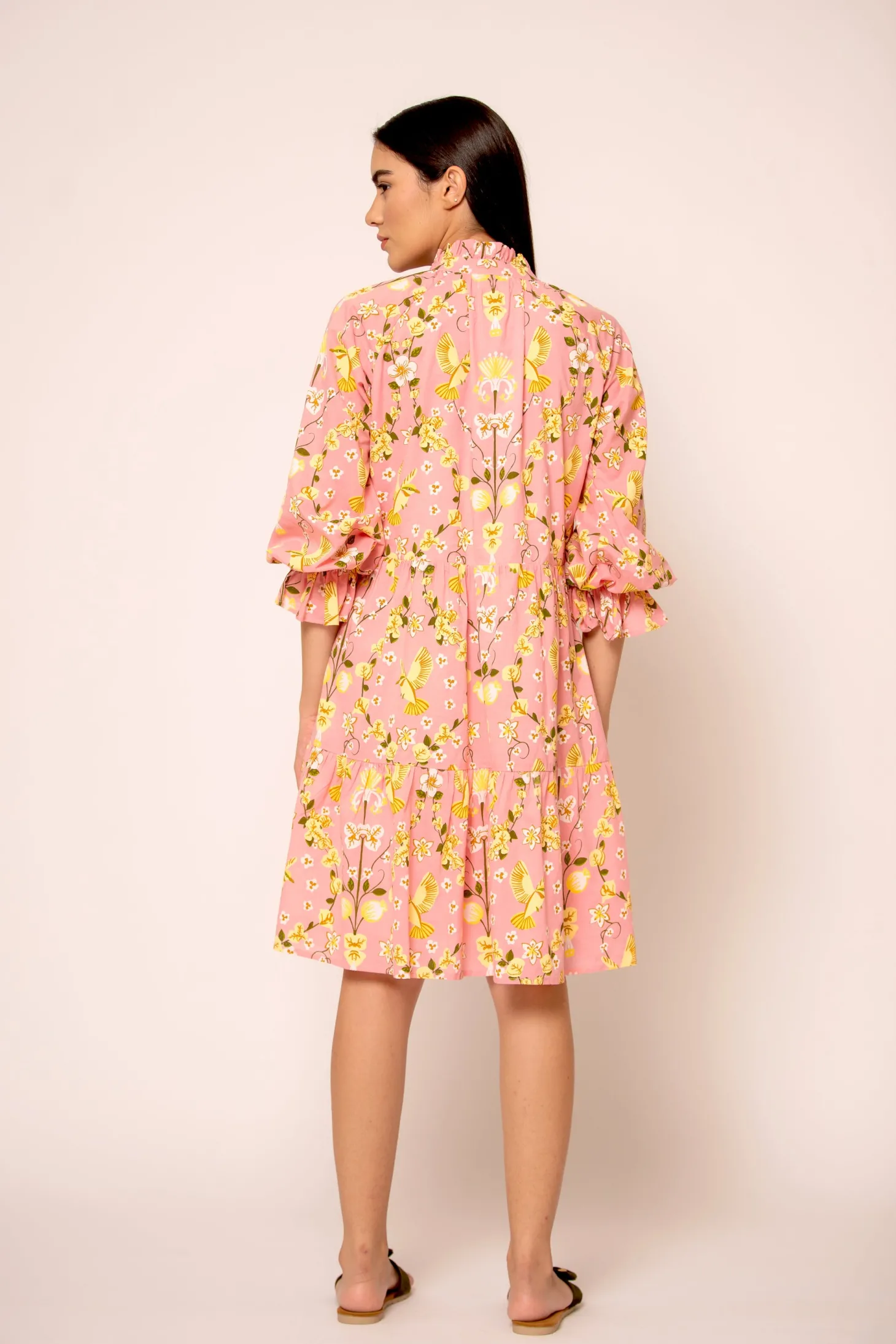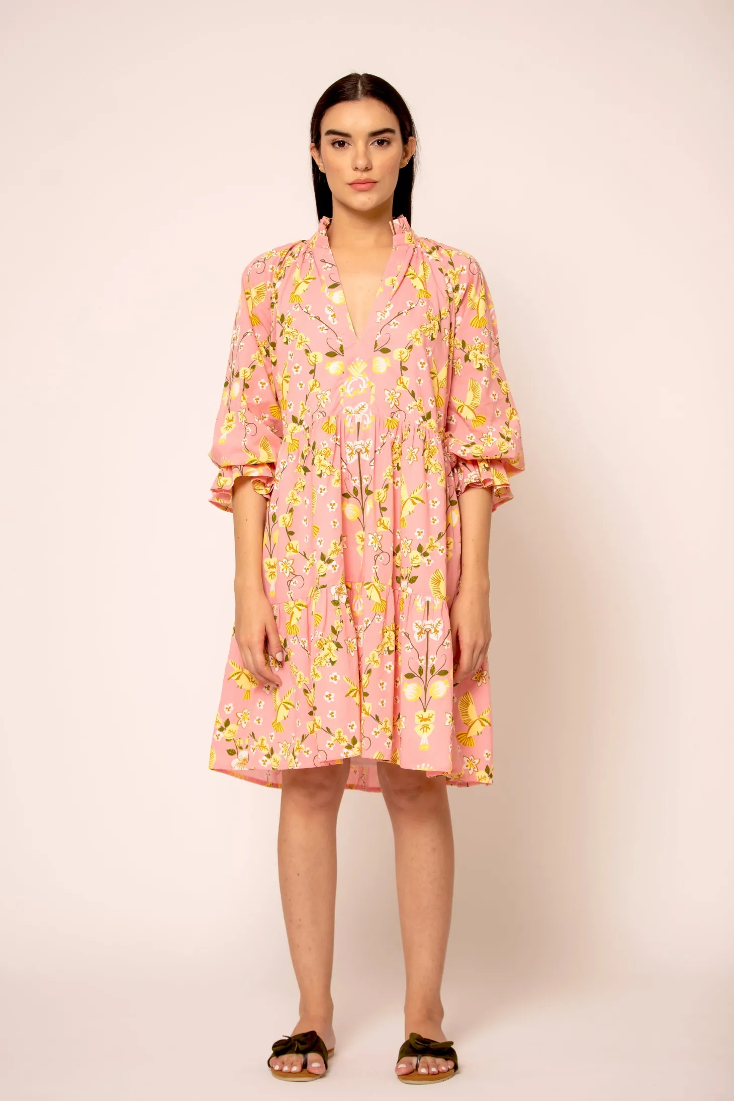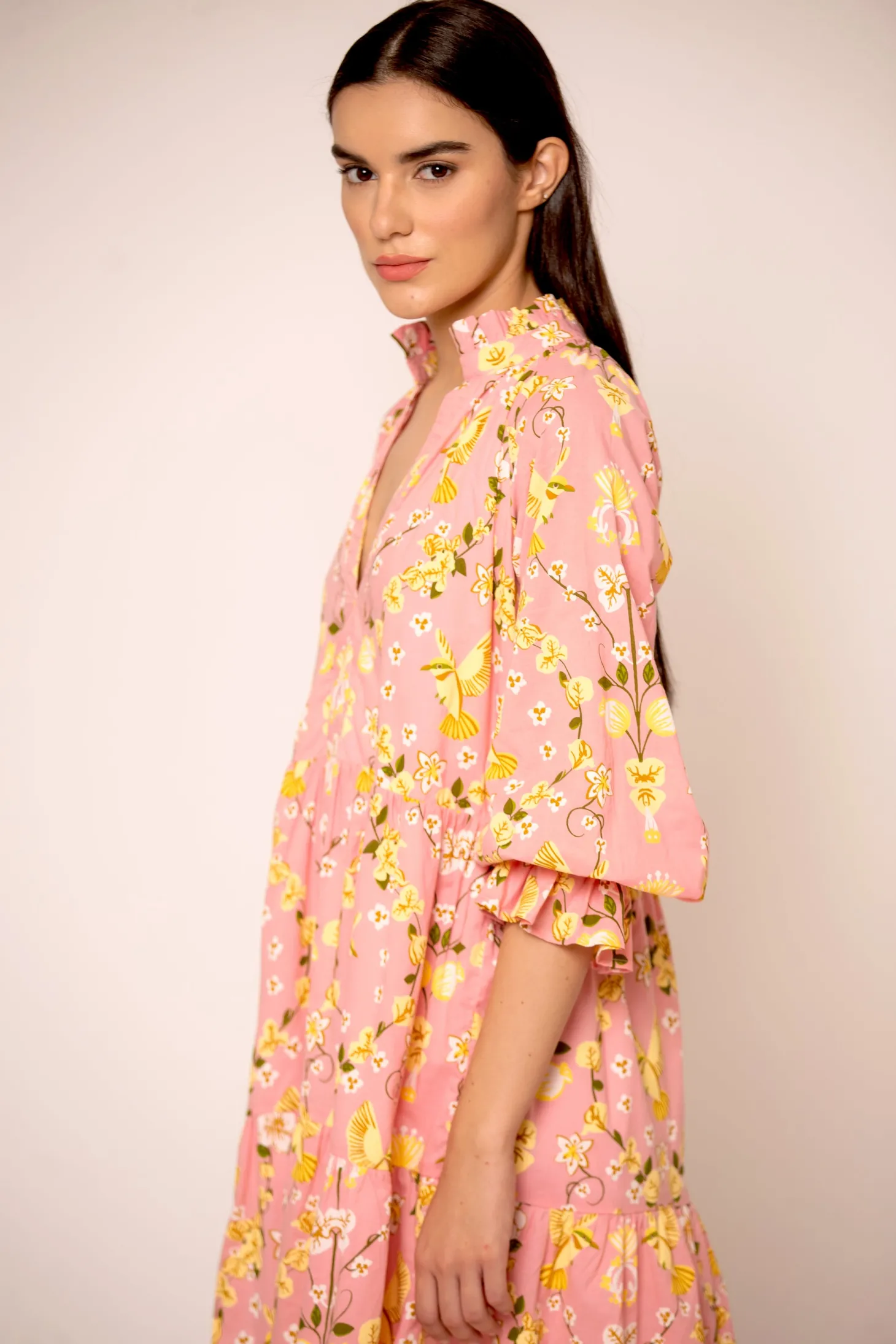 The Juliet is a flirty and effortless silhouette featuring a V-neckline and billowing sleeves. The pleats at the neck and tiered bottom give it an elegant touch. Juliet is made from a soft, breathable cotton cambric fabric that will keep you cool on a hot summer day. The vibrant artwork is inspired by the romantic nostalgia of Pondicherry’s French mansions with patios covered inpink and peach bougainvilleas.