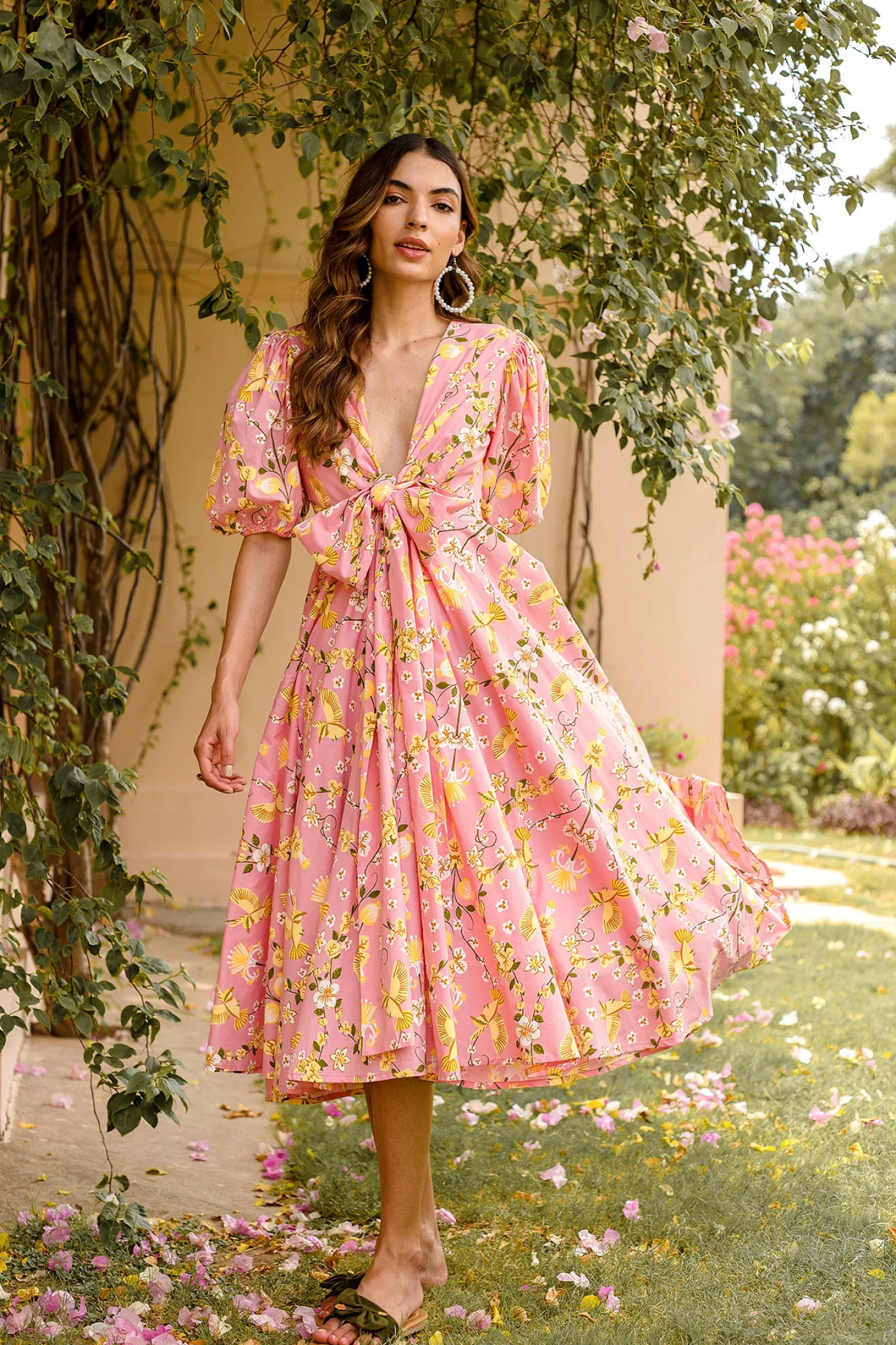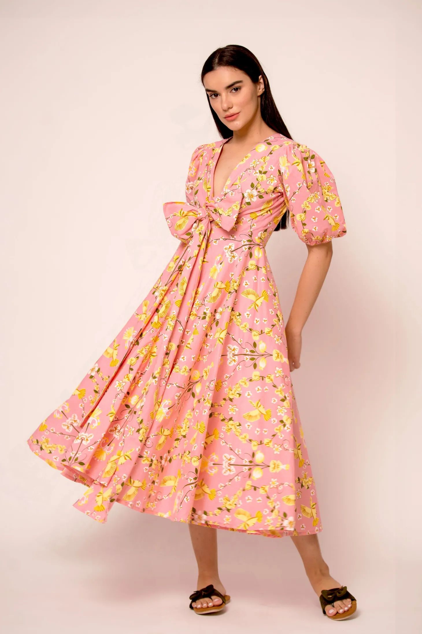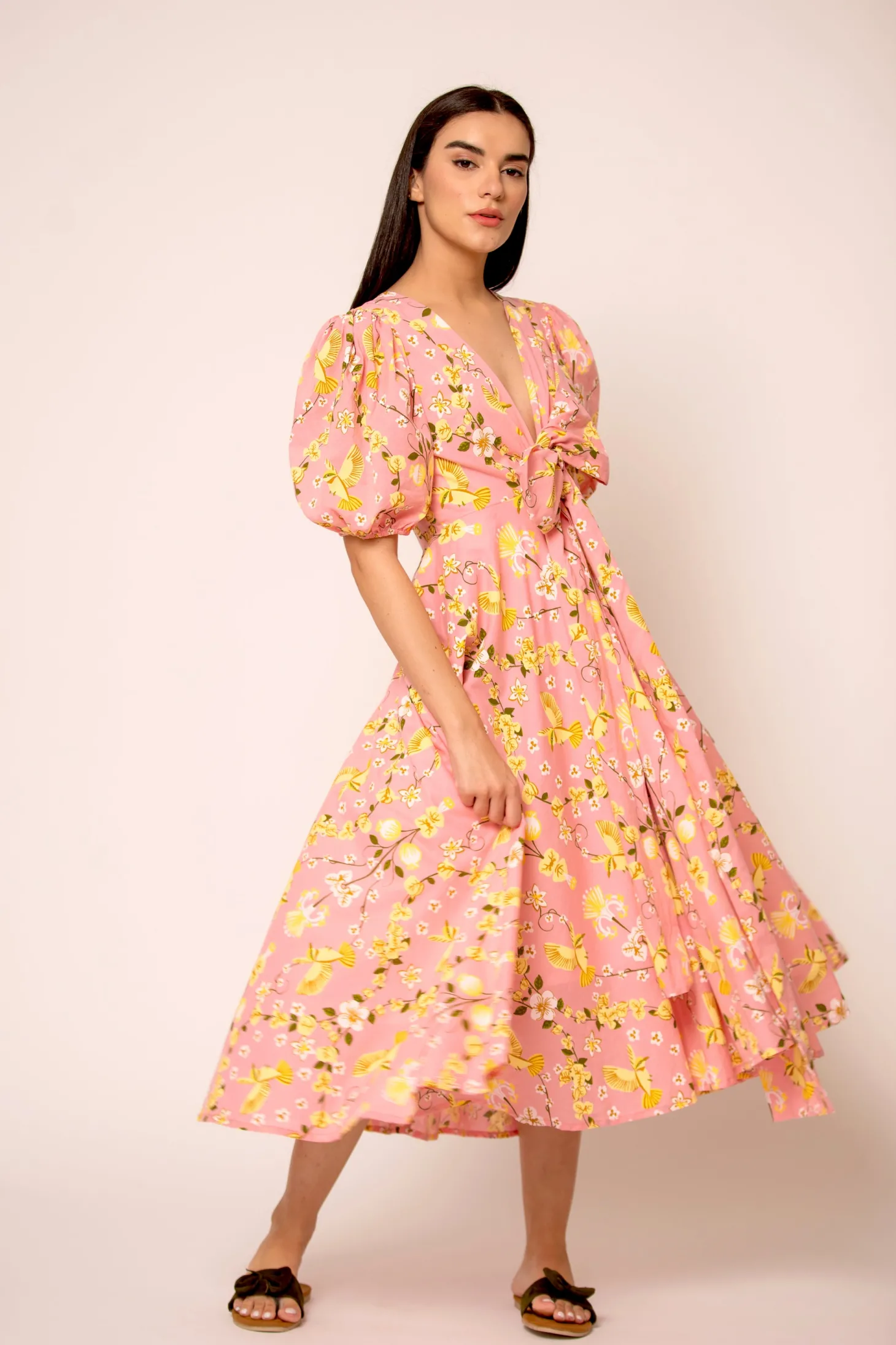 Our signature style and all-time favorite Lola dress is so easy-to-wear and versatile. The Lola can be wrapped with an oversized bow in the front or with a simple knot in the back or on the side. Lola is made from a soft, breathable cotton cambric fabric that will keep you cool on a hot summer day. The vibrant artwork is inspired by the romantic nostalgia of Pondicherry’s French mansions with patios covered in pinkand peach bougainvilleas.