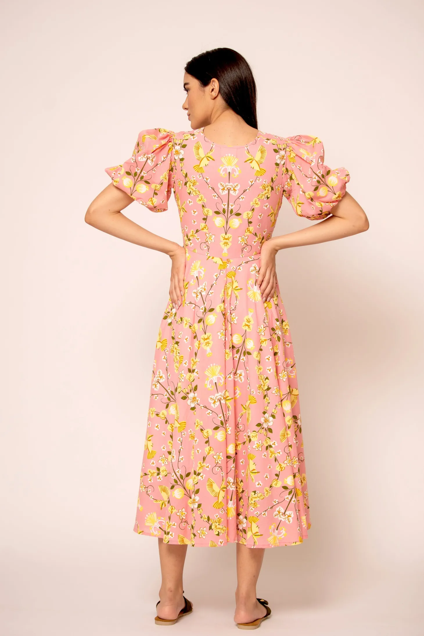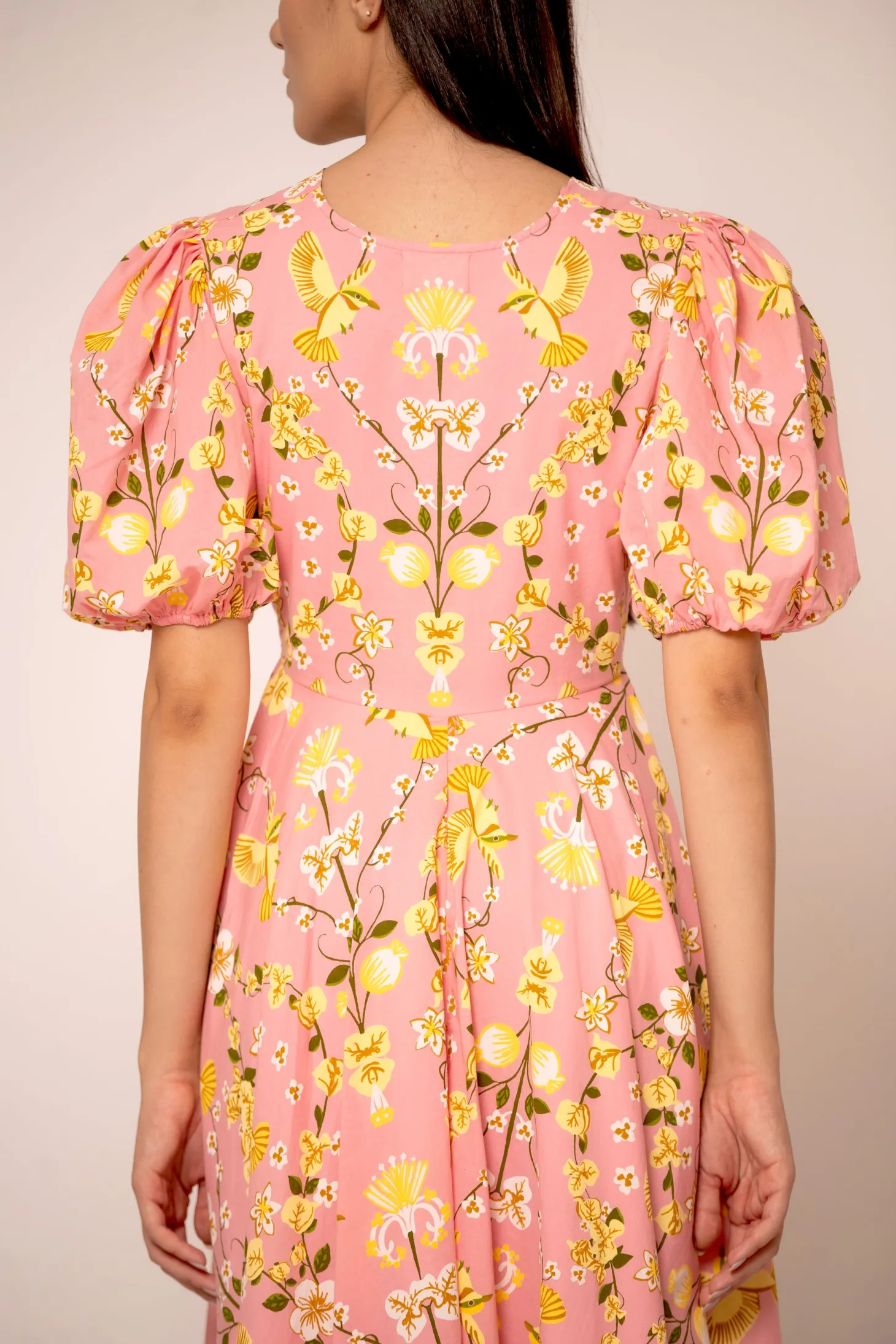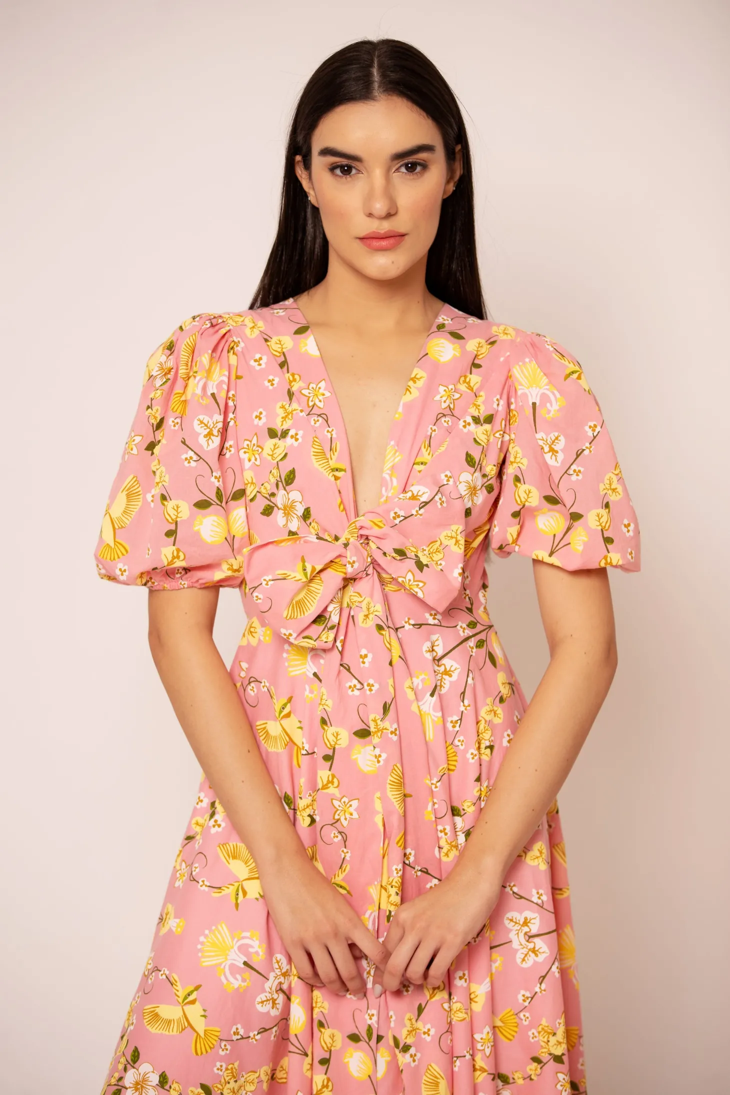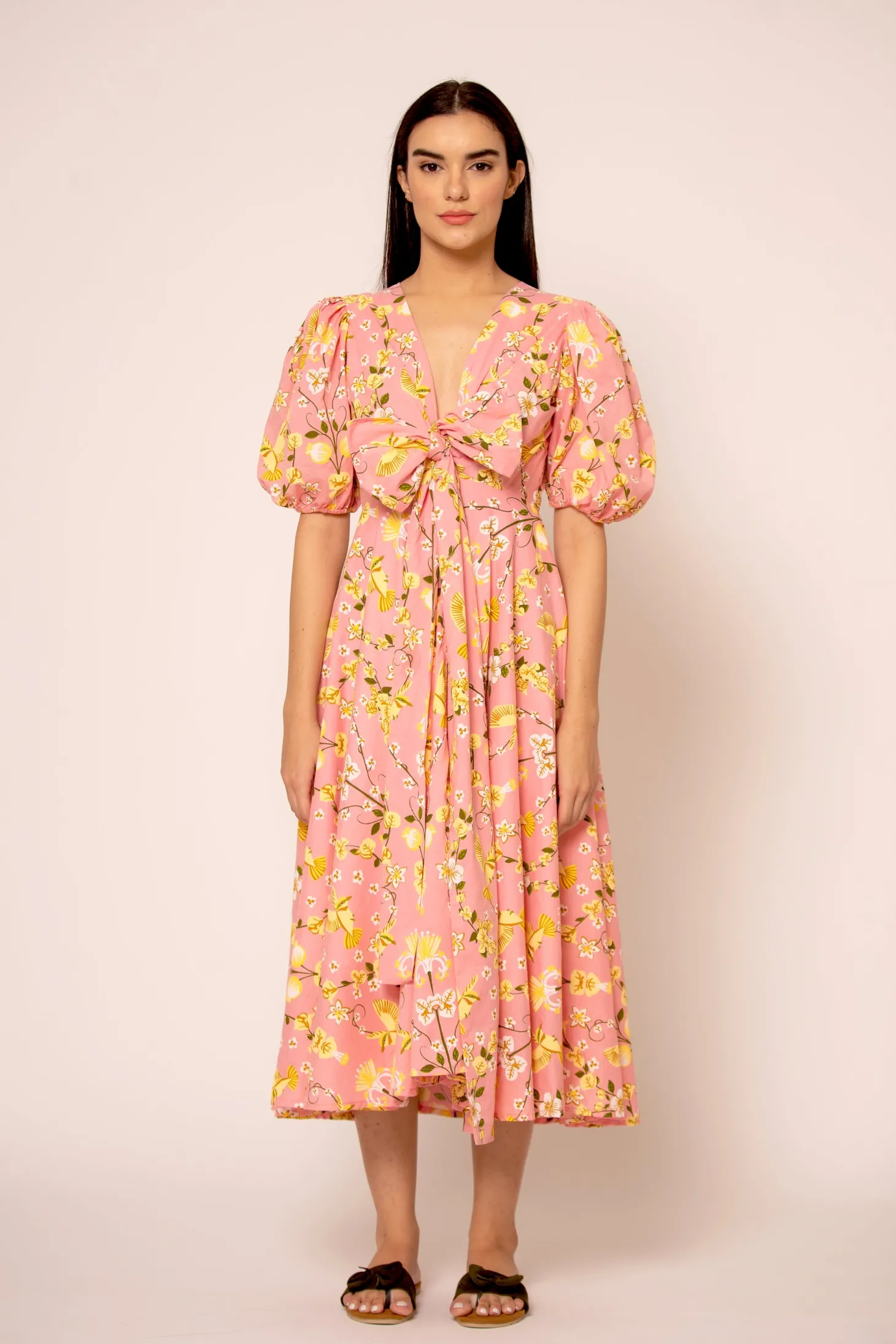 Our signature style and all-time favorite Lola dress is so easy-to-wear and versatile. The Lola can be wrapped with an oversized bow in the front or with a simple knot in the back or on the side. Lola is made from a soft, breathable cotton cambric fabric that will keep you cool on a hot summer day. The vibrant artwork is inspired by the romantic nostalgia of Pondicherry’s French mansions with patios covered in pinkand peach bougainvilleas.