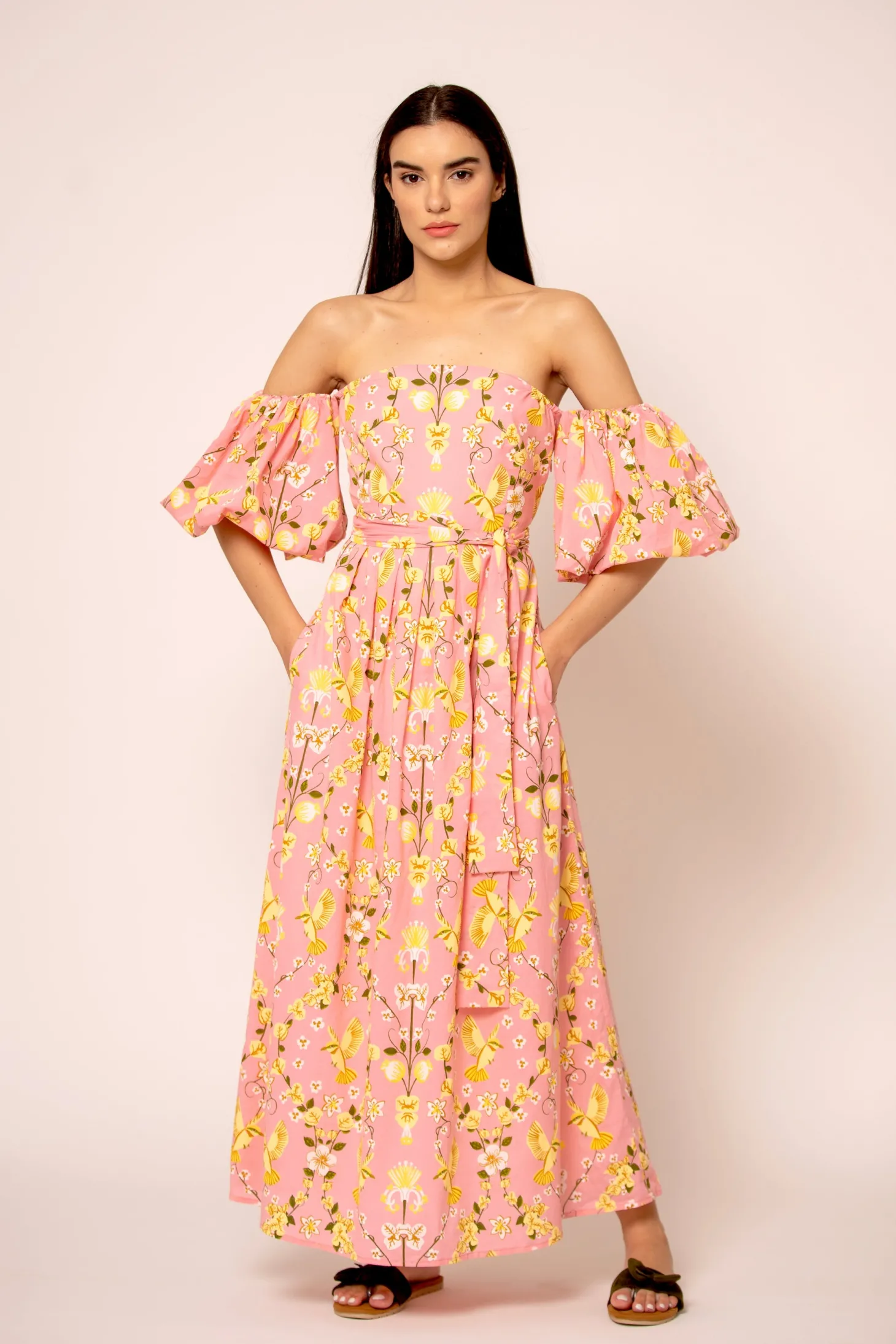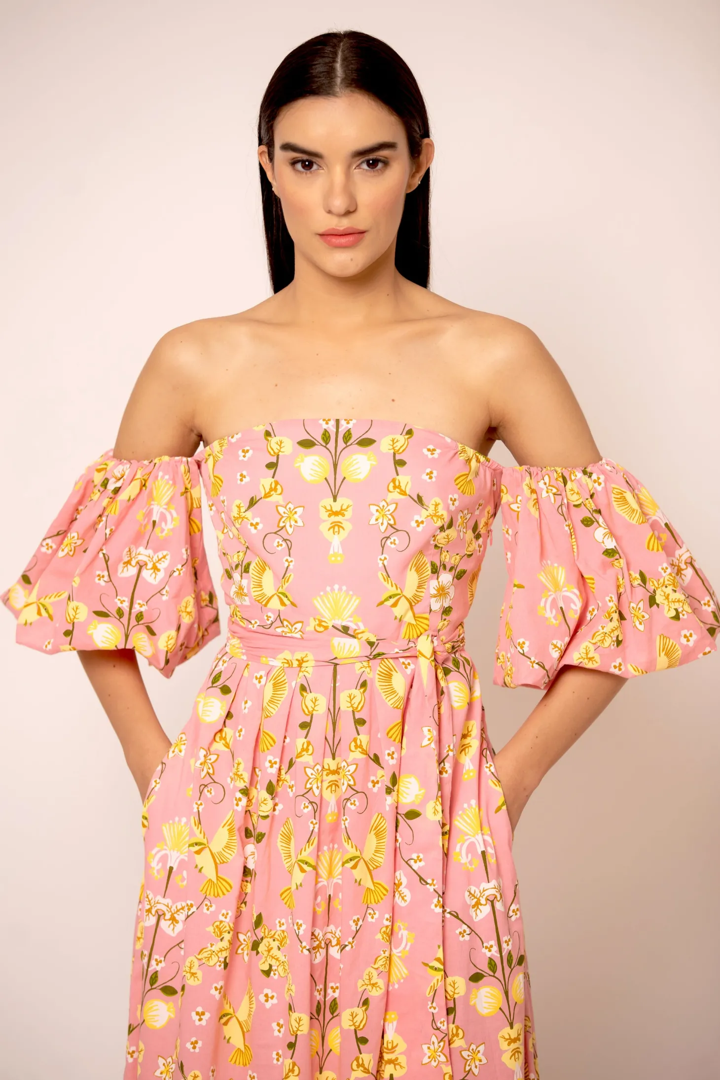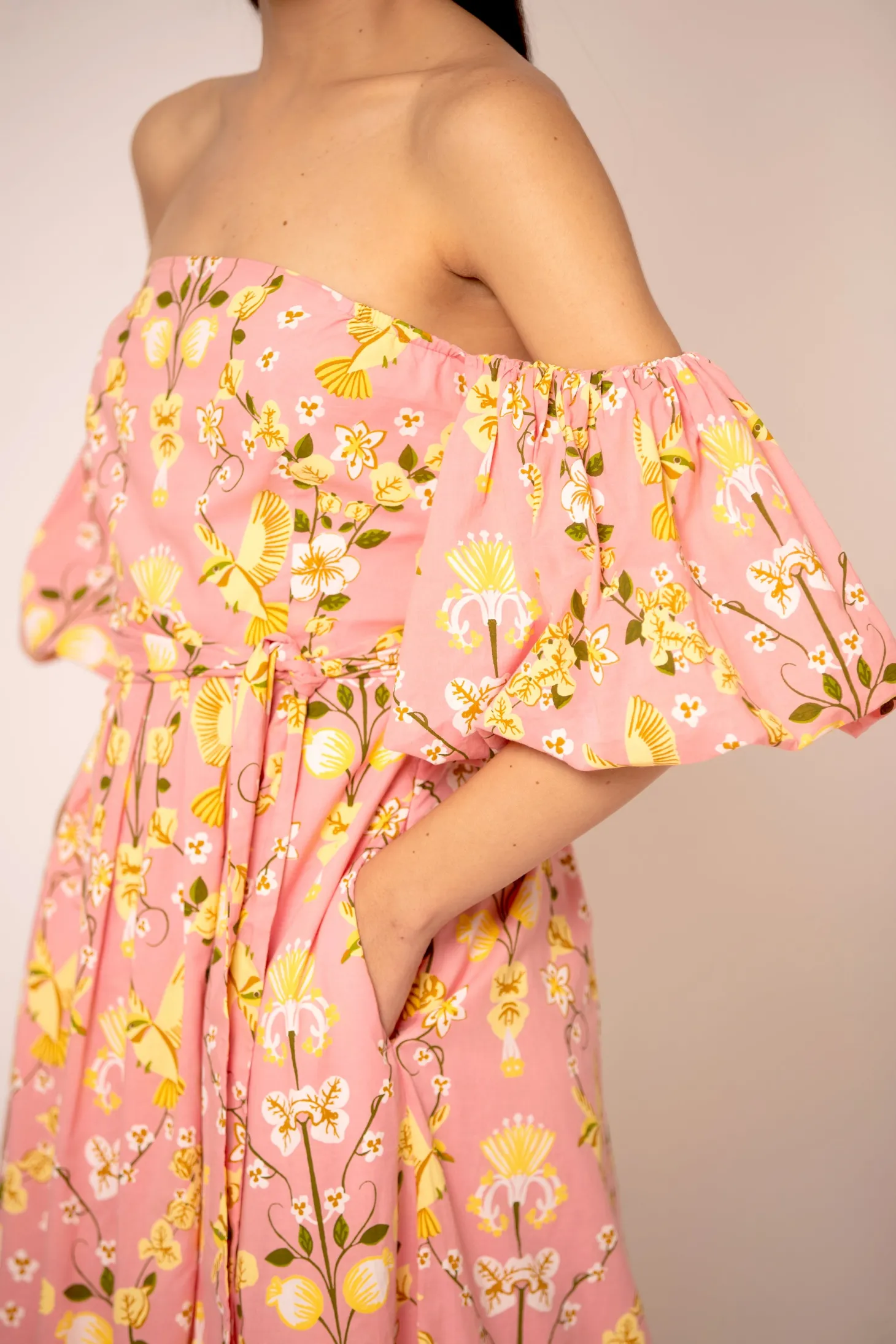 The flirty and glamourous Leah dress features romantic off the shoulder bubble sleeves, a fitted waist and a flattering A-line skirt. Leah is made from a soft, breathable cotton cambric fabric that will keep you cool on a hot summer day. The vibrant artwork is inspired by the romantic nostalgia of Pondicherry’s French mansions with patios covered in pink and peach bougainvilleas.