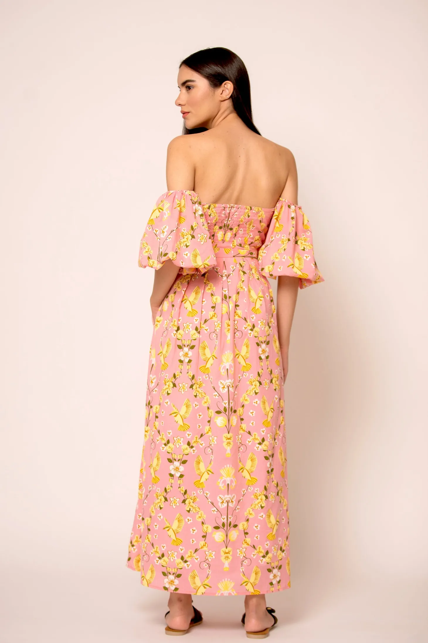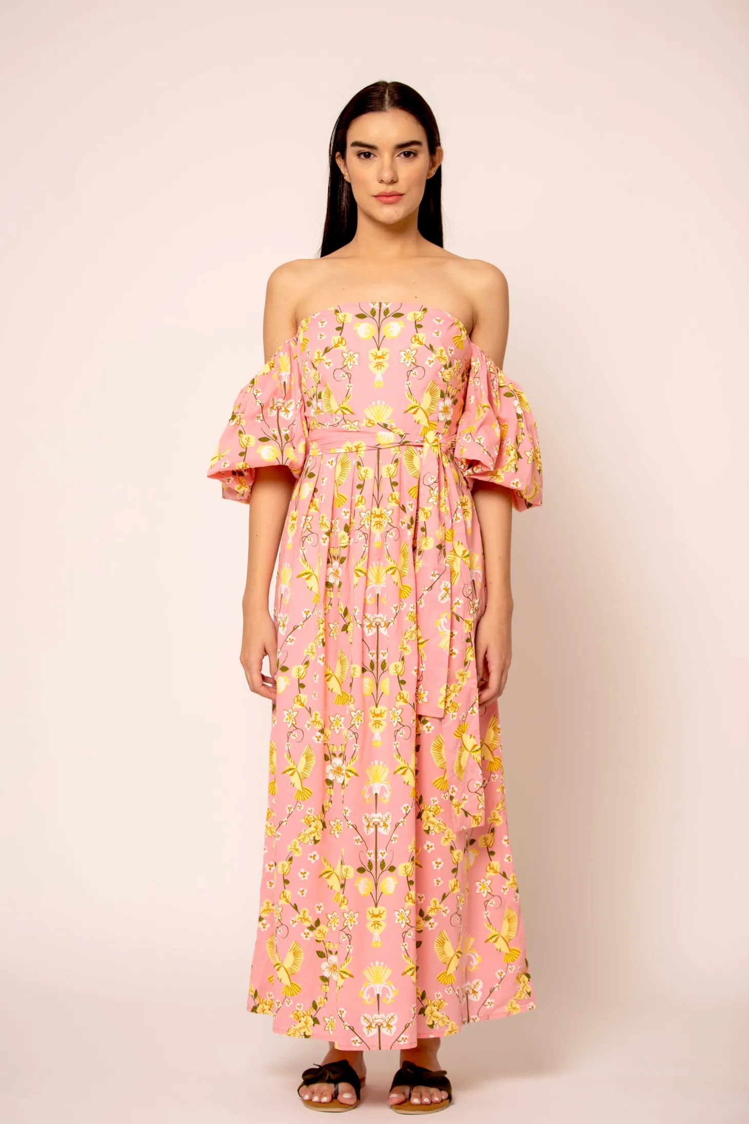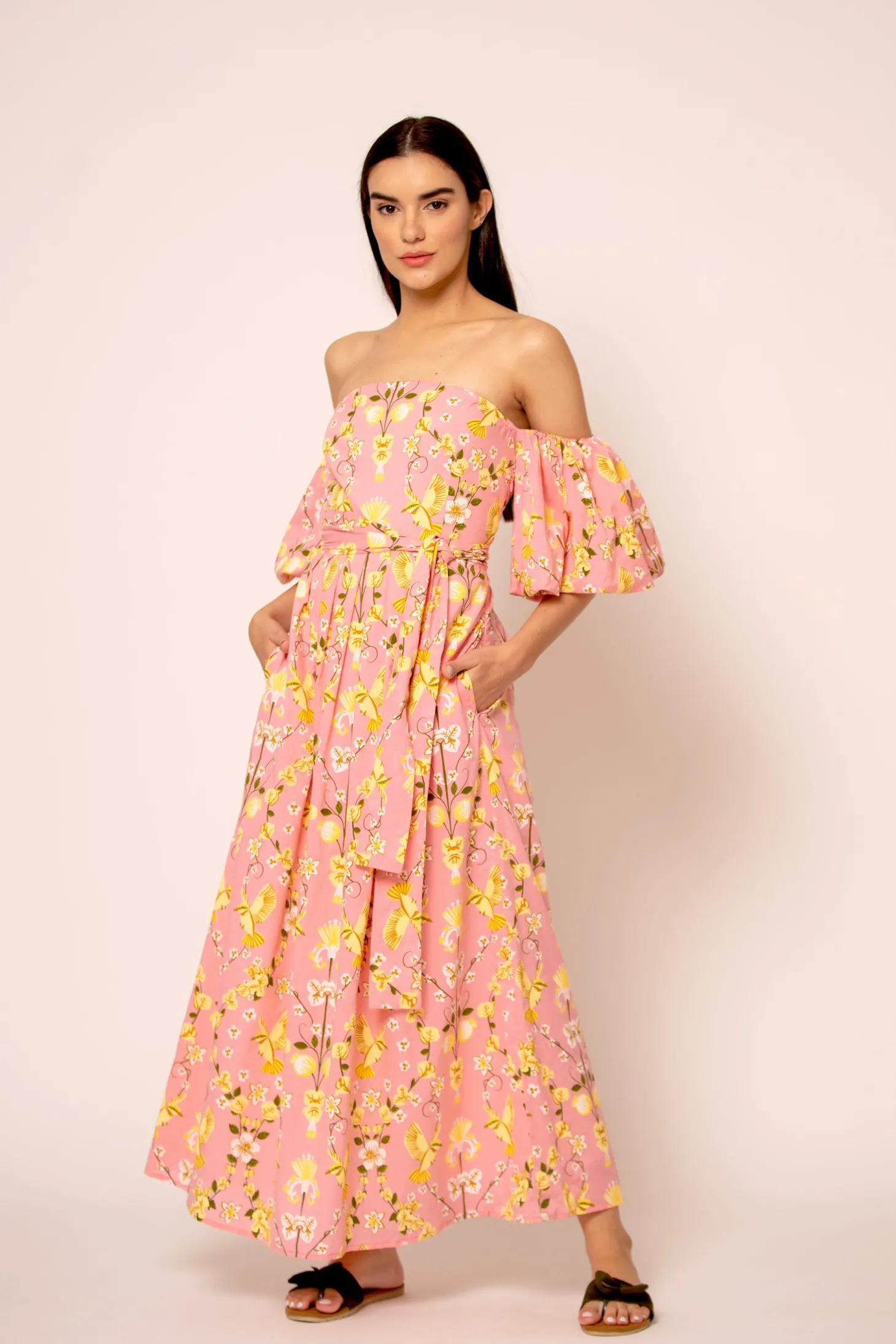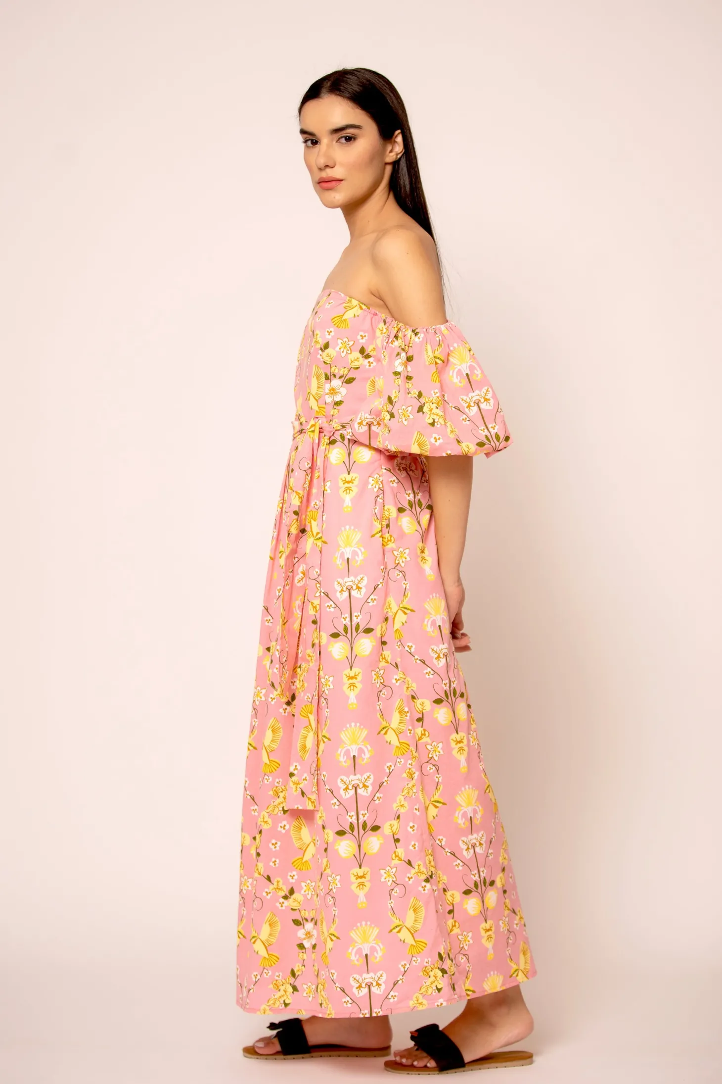 The flirty and glamourous Leah dress features romantic off the shoulder bubble sleeves, a fitted waist and a flattering A-line skirt. Leah is made from a soft, breathable cotton cambric fabric that will keep you cool on a hot summer day. The vibrant artwork is inspired by the romantic nostalgia of Pondicherry’s French mansions with patios covered in pink and peach bougainvilleas.
