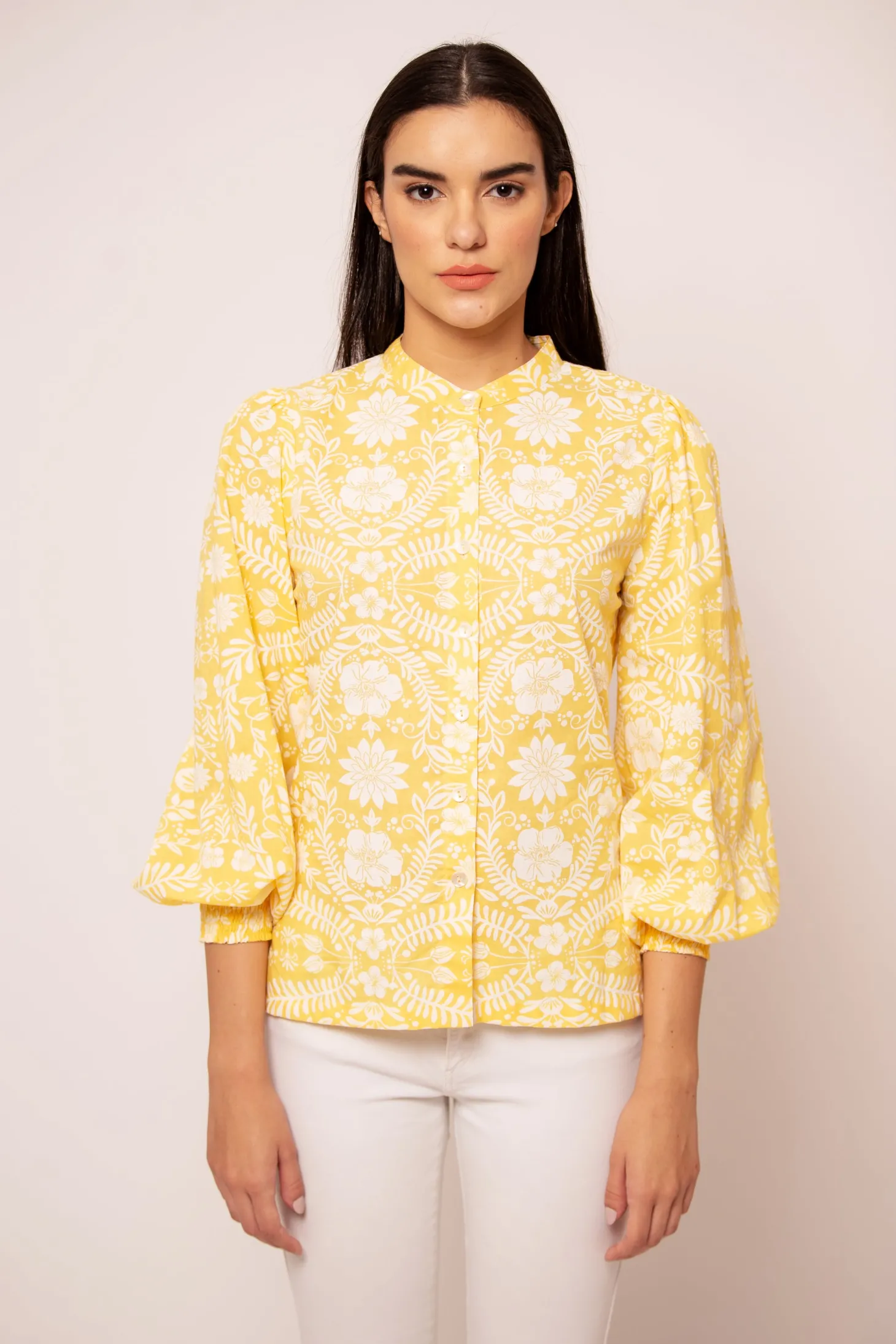 The Chiara channels casual glamour. The buttoned-down top features billowing 3/4 sleeves and is cut to hit at the hip for easy tucking or tie-at-the-waist styling. Chiara is made from a soft, breathable cotton cambric fabric that will keep you cool on a hot summer day. “Paradiso” is inspired by the serenity and lush nature of Pondicherry’s backwaters that are lined with dense palm trees.