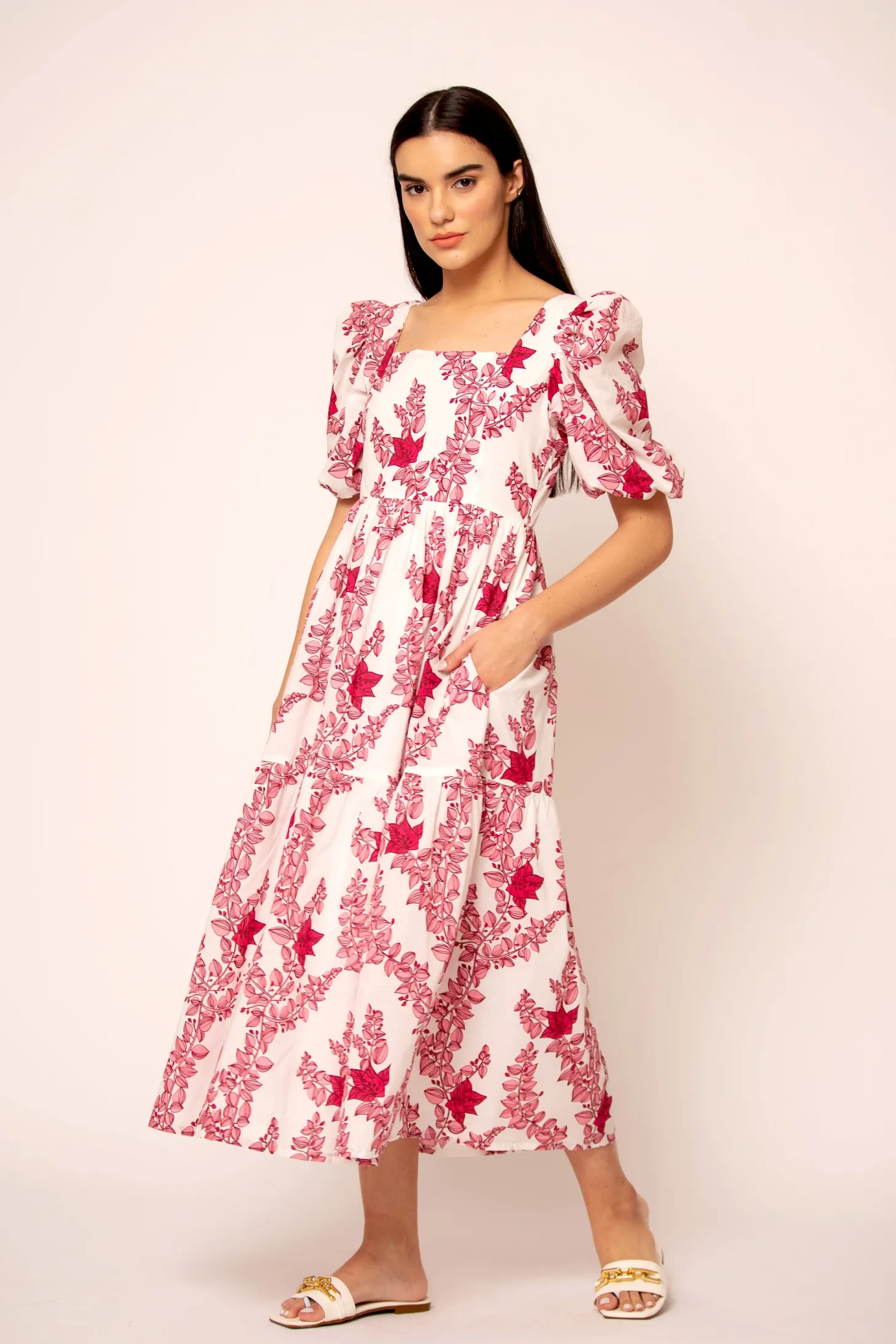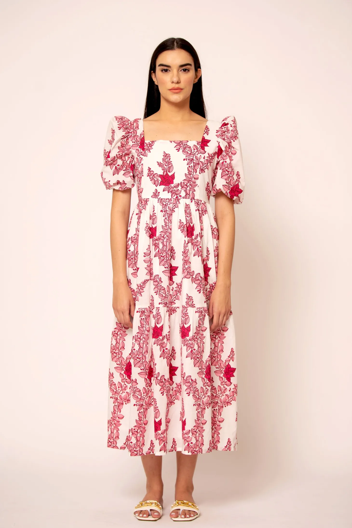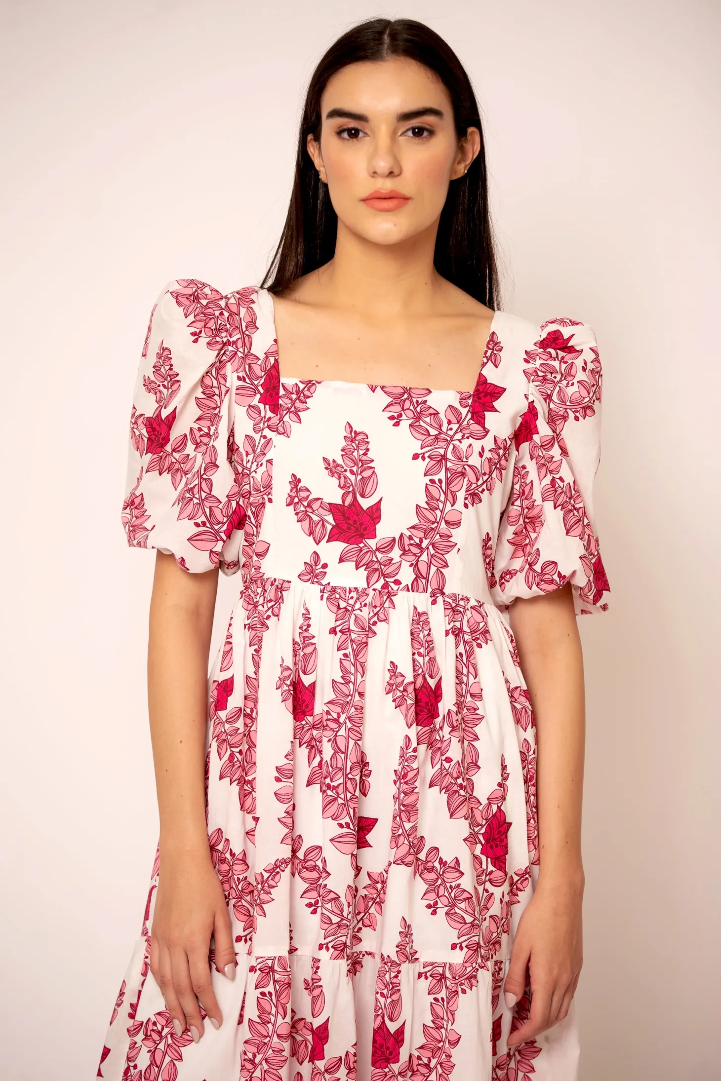 The romantic Estella dress is timeless yet flirty, with a flattering fit and a silhouette that is both elegant and functional. Estella features subtle puff sleeves, smocked details at the back and a chic square neckline. Estella is made from a soft, breathable cotton cambric fabric that will keep you cool on a hot summer day. The floral artwork is inspired by the bright-hued Bougainvilleas lining almost every street in Pondicherry’s French Quarter.