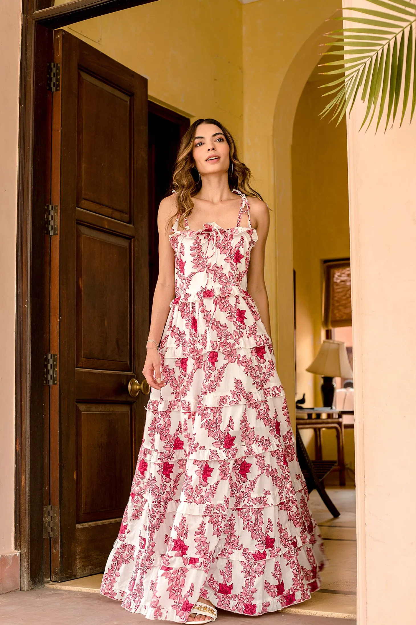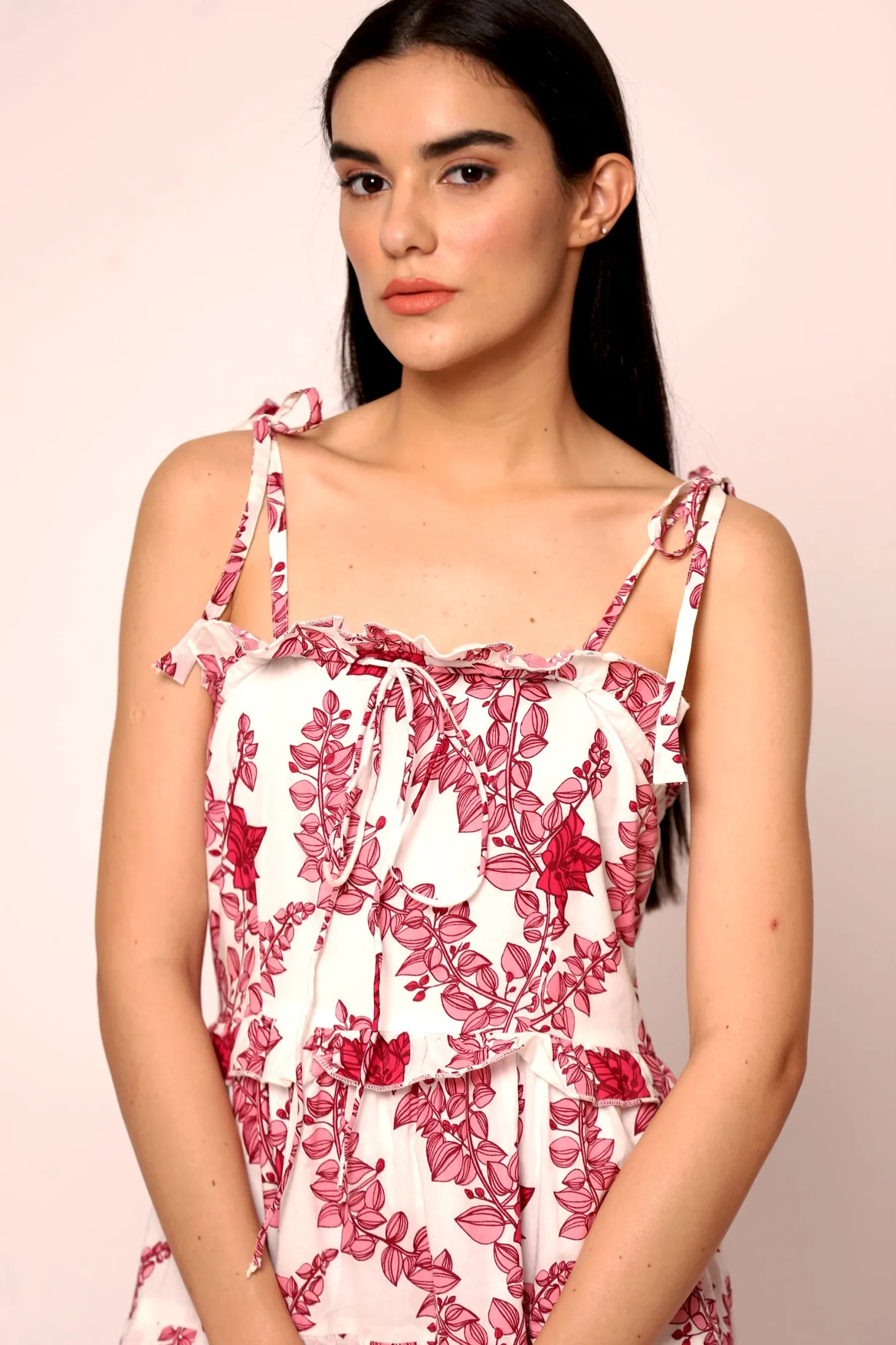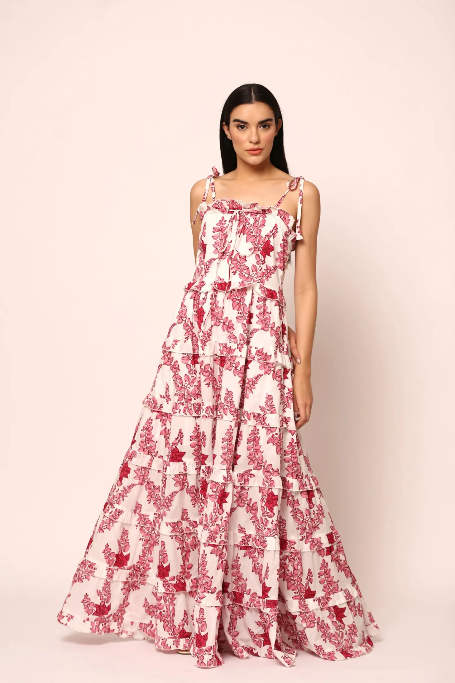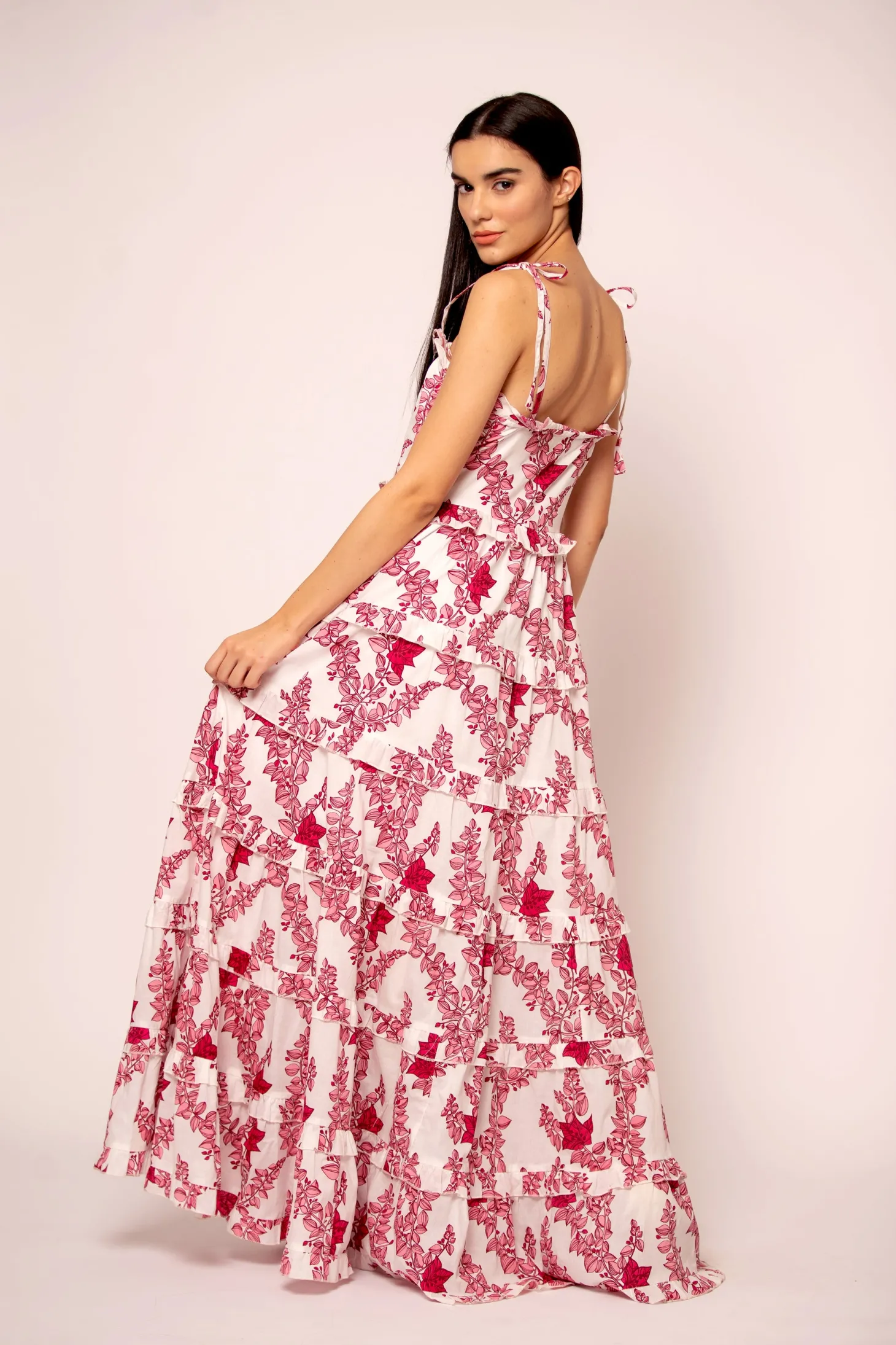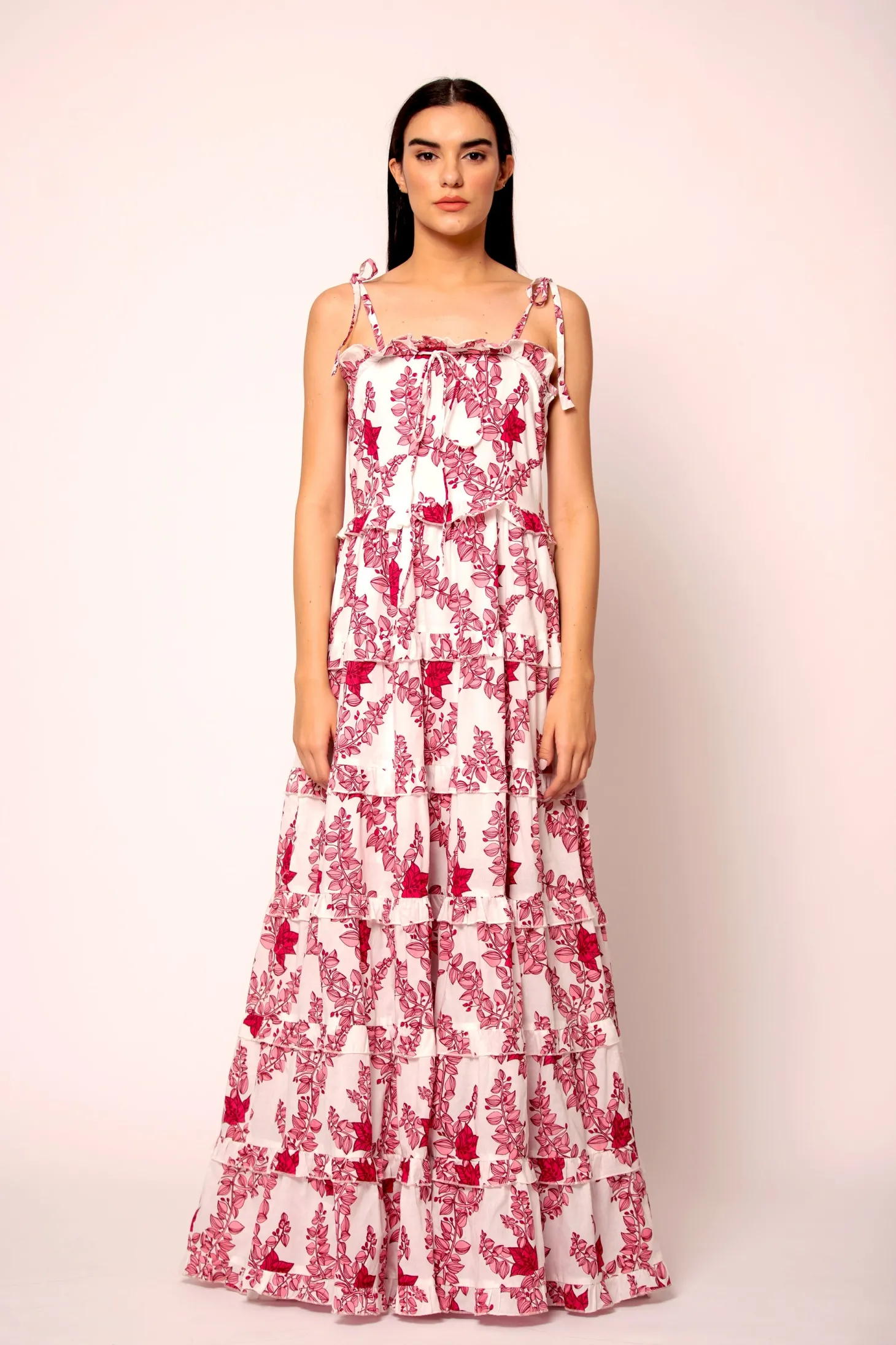 The Sadie, with its multiple layers of hand-sewn ruffles, self-tie straps and wide A-line will make you feel like a modern day princess. Sadie is made from a soft, breathable cotton cambric fabric that will keep you cool on a hot summer day. The floral artwork is inspired by the bright-hued bougainvilleas lining almost every street in Pondicherry’s French Quarter.