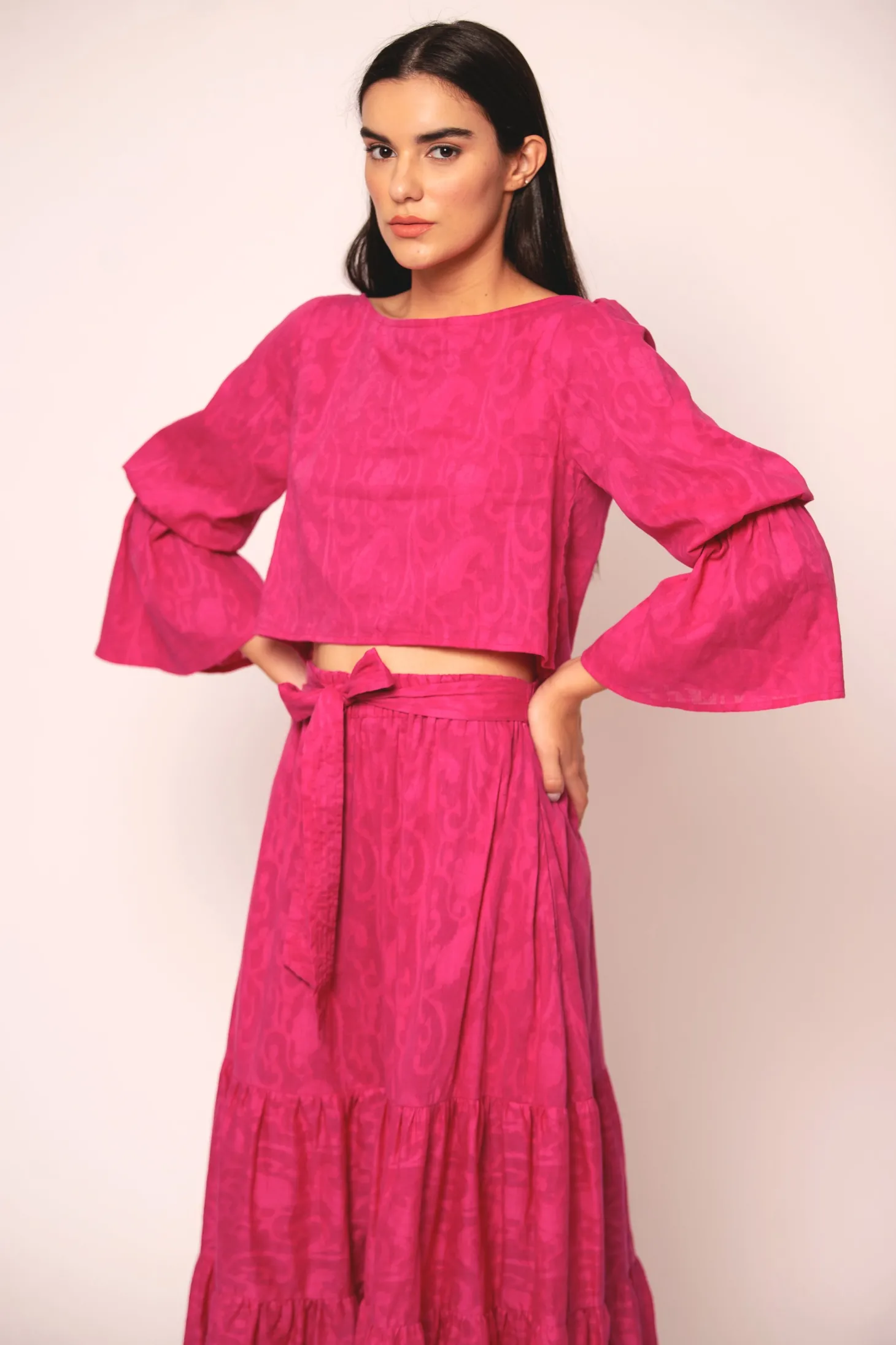 The chic Blair features a classy boatneck, high-low A-line bodice and stunning bell sleeves. Complete the look with our fabulous Gia skirt. Blair is crafted from luxurious, lightweight cotton jacquard fabric showcasing an intricate floral pattern. The Jacquard weave references the antique French décor of Pondicherry’s historic mansions.