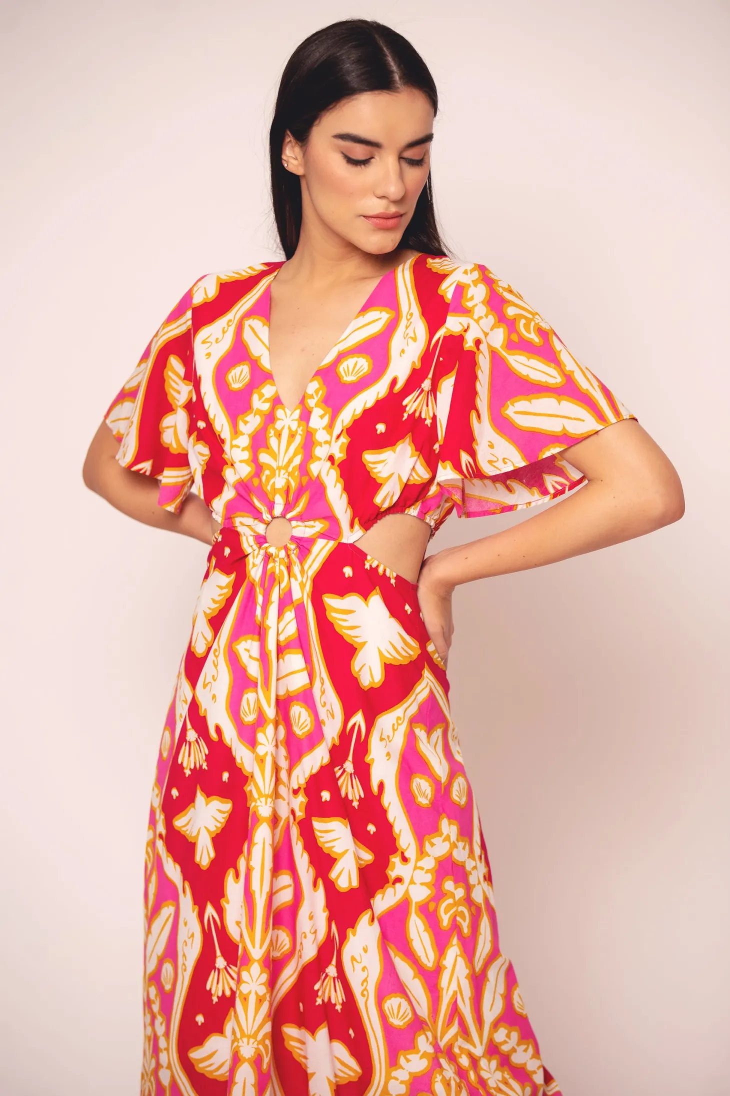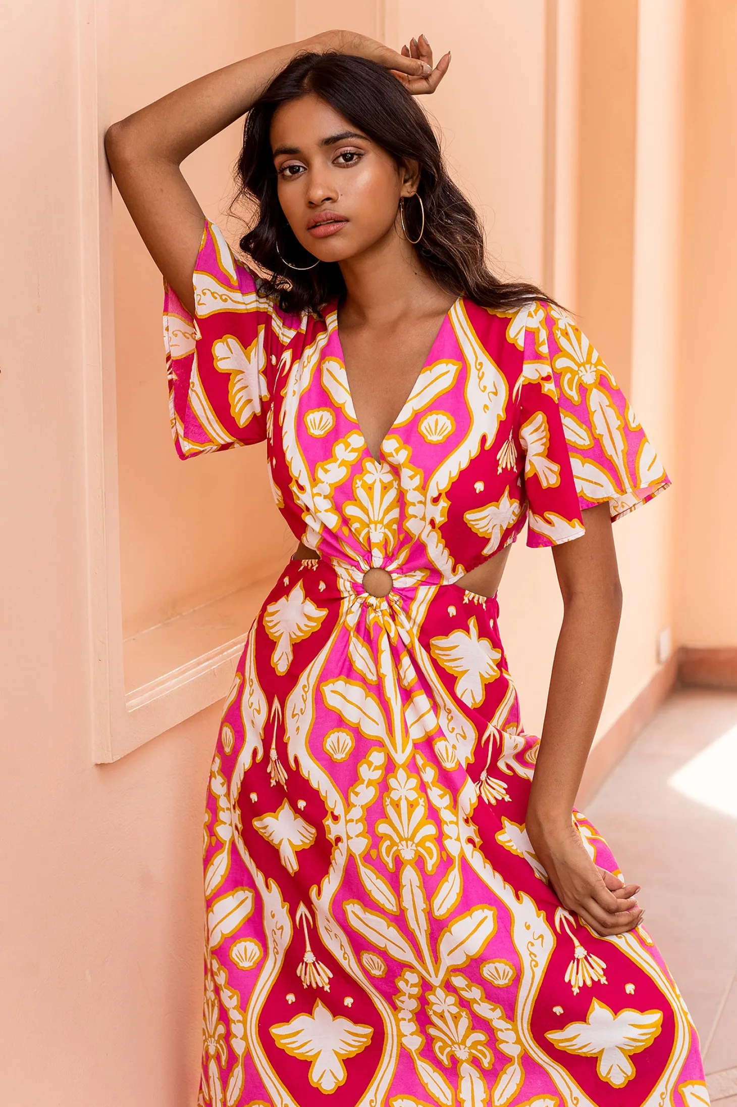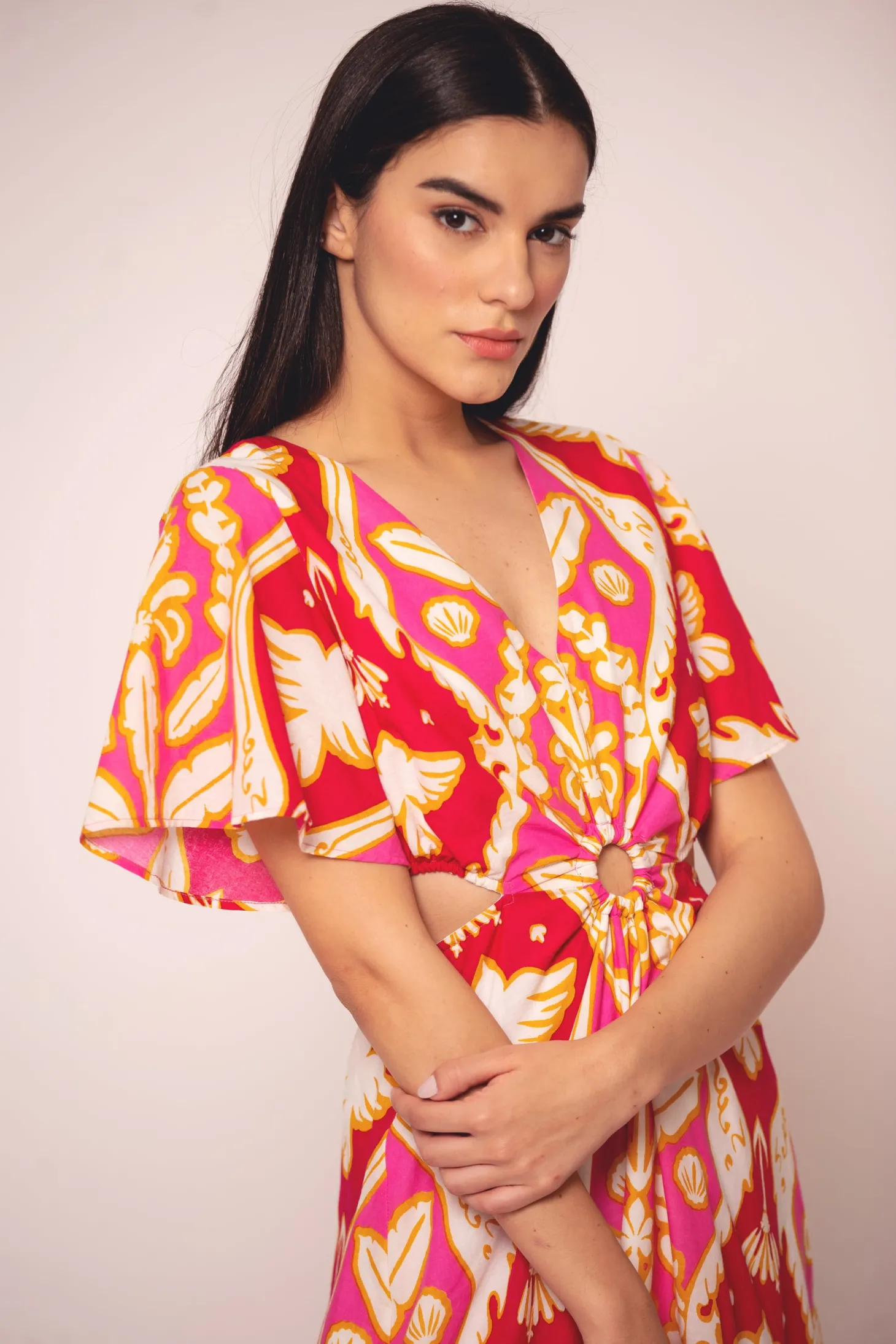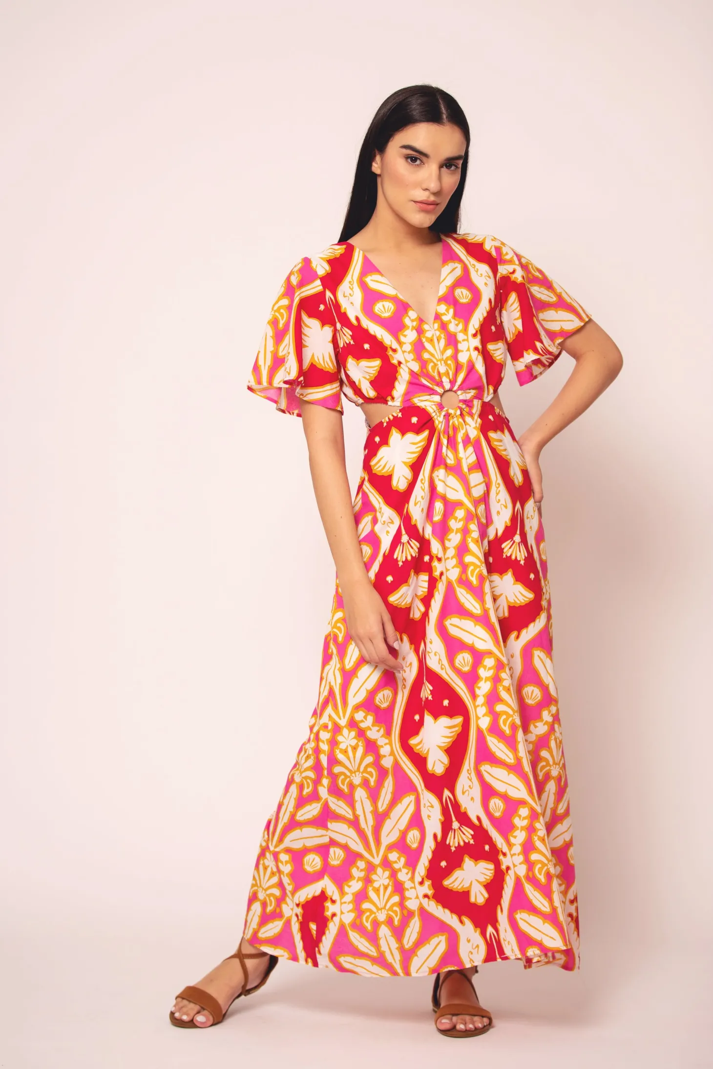 Giselle, with its flattering cutouts at the waist, its enticing V-neck, butterfly sleeves and narrow A-line is the dress you wear to feel fabulous. Giselle is flattering, glamou- rous and very feminine. GIselle is made from a soft, breathable cotton cambric fabric that will keep you cool on a hot summer day. The print echoes Pondicherry’s wildlife with motives of elephant trunks, shells, banana leaves and birds.