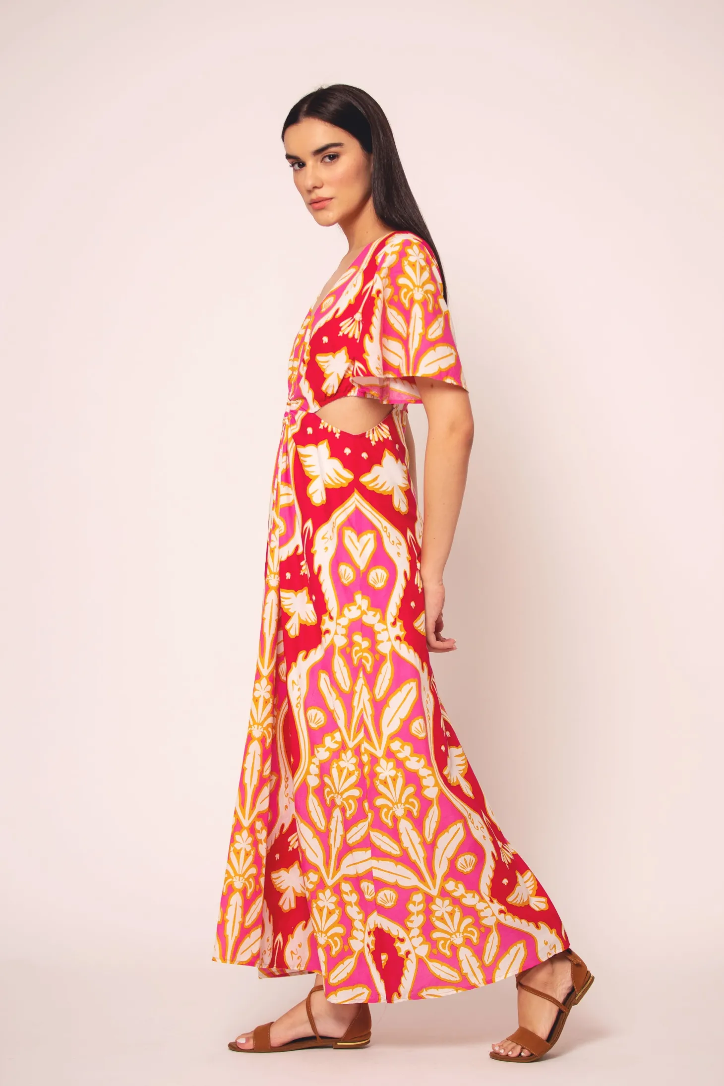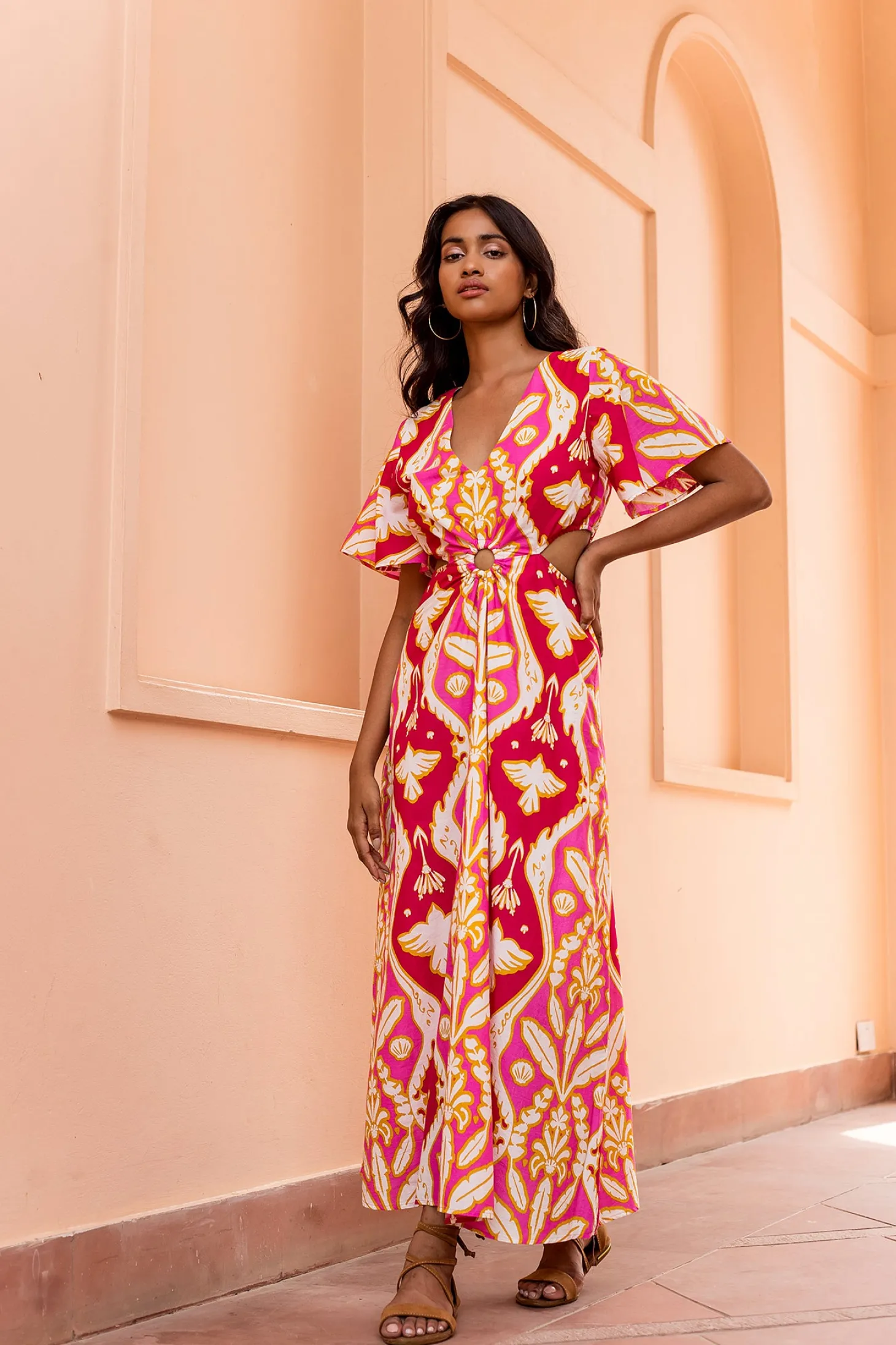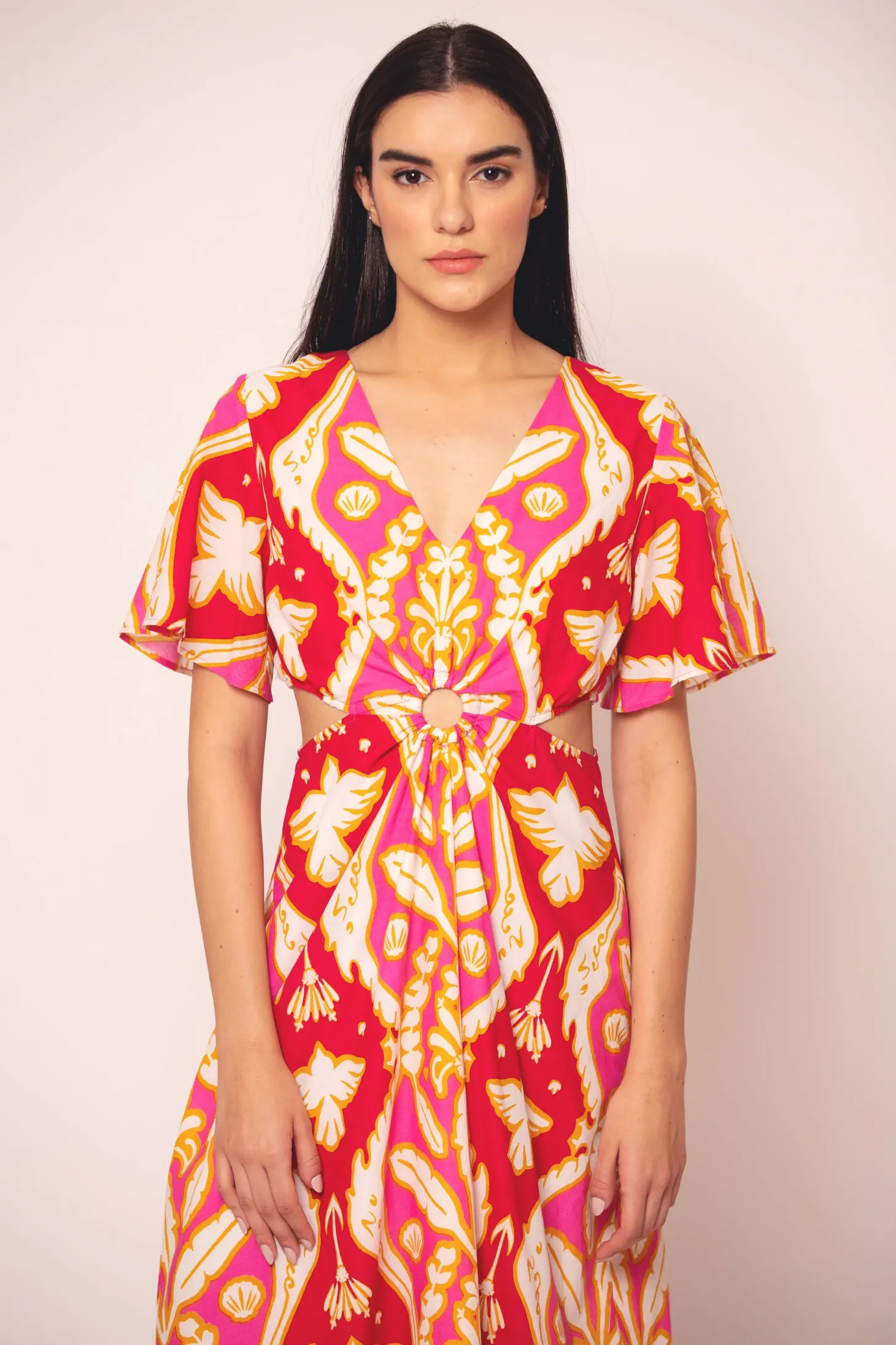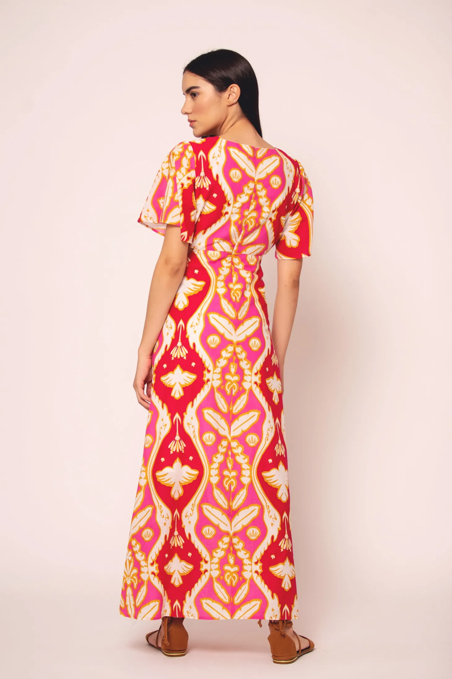 Giselle, with its flattering cutouts at the waist, its enticing V-neck, butterfly sleeves and narrow A-line is the dress you wear to feel fabulous. Giselle is flattering, glamou- rous and very feminine. GIselle is made from a soft, breathable cotton cambric fabric that will keep you cool on a hot summer day. The print echoes Pondicherry’s wildlife with motives of elephant trunks, shells, banana leaves and birds.