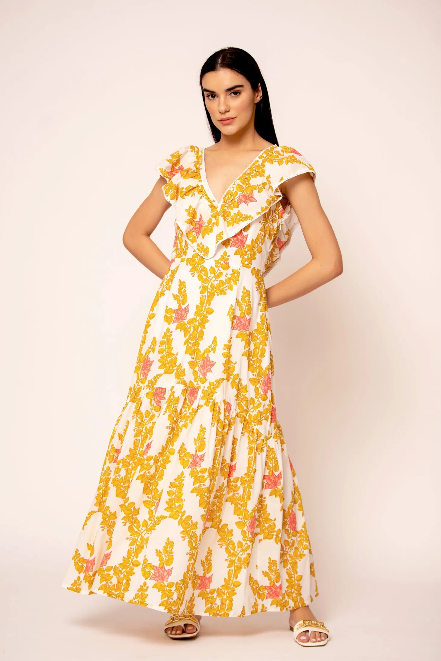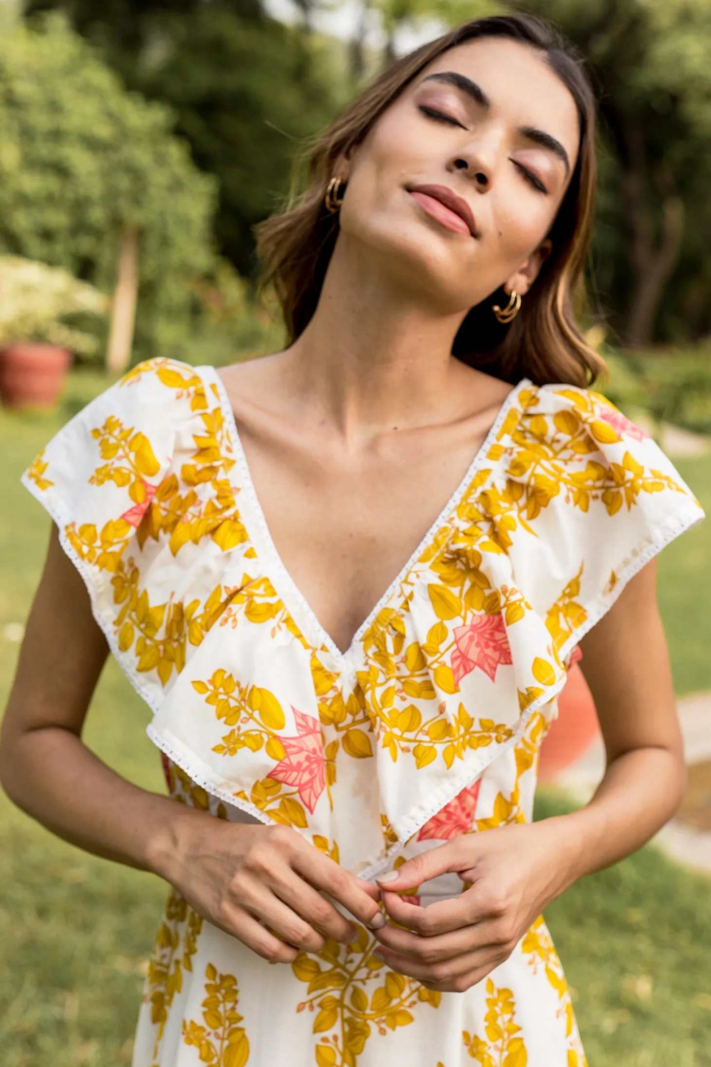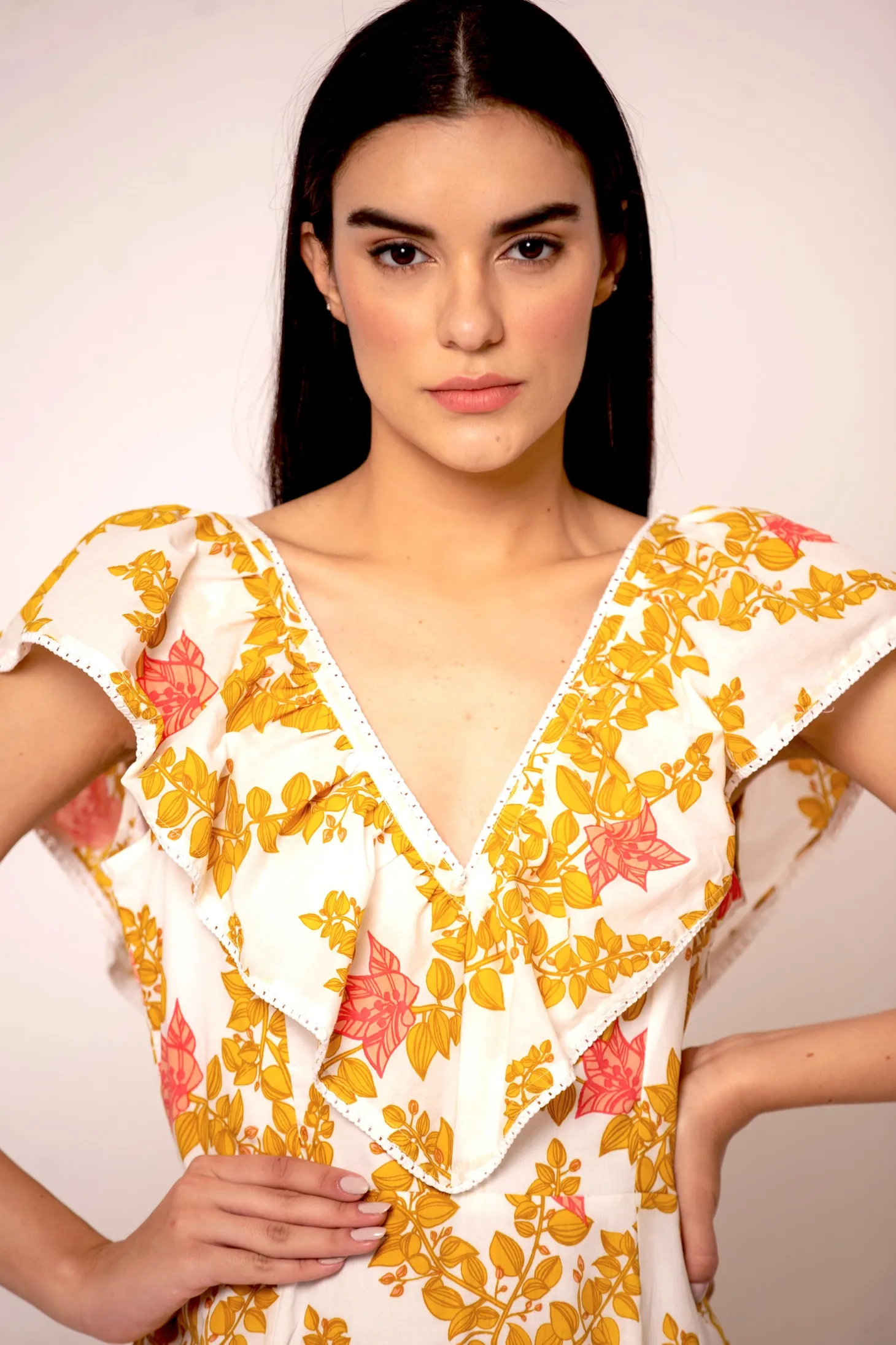 The Ella features a feminine silhouette with an exaggerated flutter V-neck and a fitted waist. The intriguing ruffle placements on the skirt bottom give the look a contemporary edge. Ella is made from a soft, breath- able cotton cambric fabric that will keep you cool on a hot summer day. The floral artwork is inspired by the bright-hued bougainvilleas lining almost every street in Pondicherry’s French Quarter.