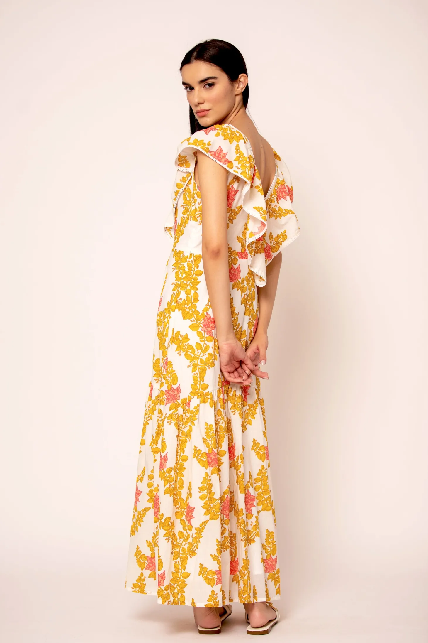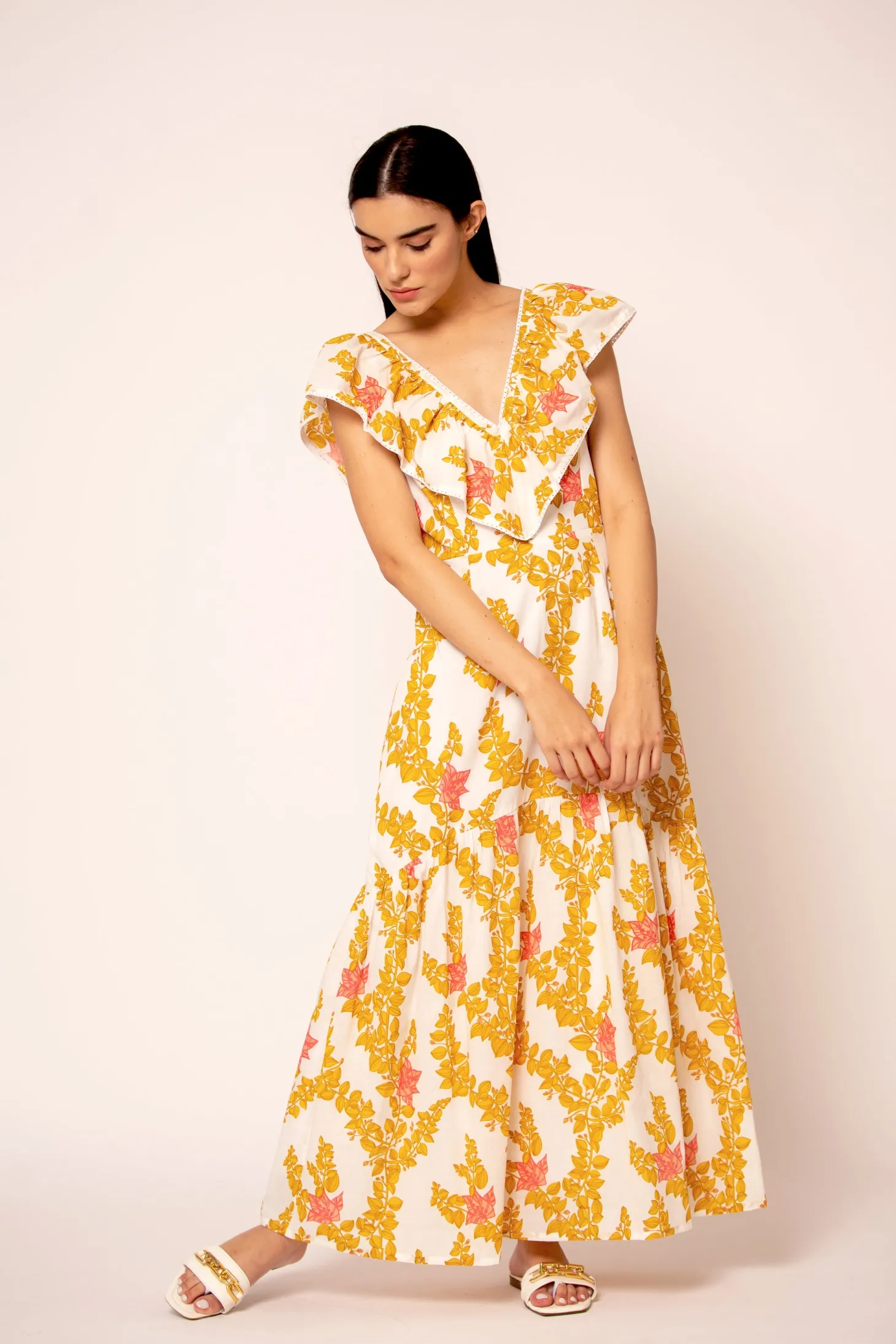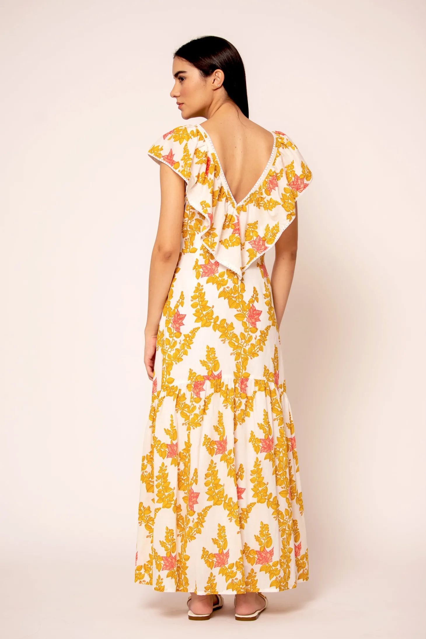 The Ella features a feminine silhouette with an exaggerated flutter V-neck and a fitted waist. The intriguing ruffle placements on the skirt bottom give the look a contemporary edge. Ella is made from a soft, breath- able cotton cambric fabric that will keep you cool on a hot summer day. The floral artwork is inspired by the bright-hued bougainvilleas lining almost every street in Pondicherry’s French Quarter.
