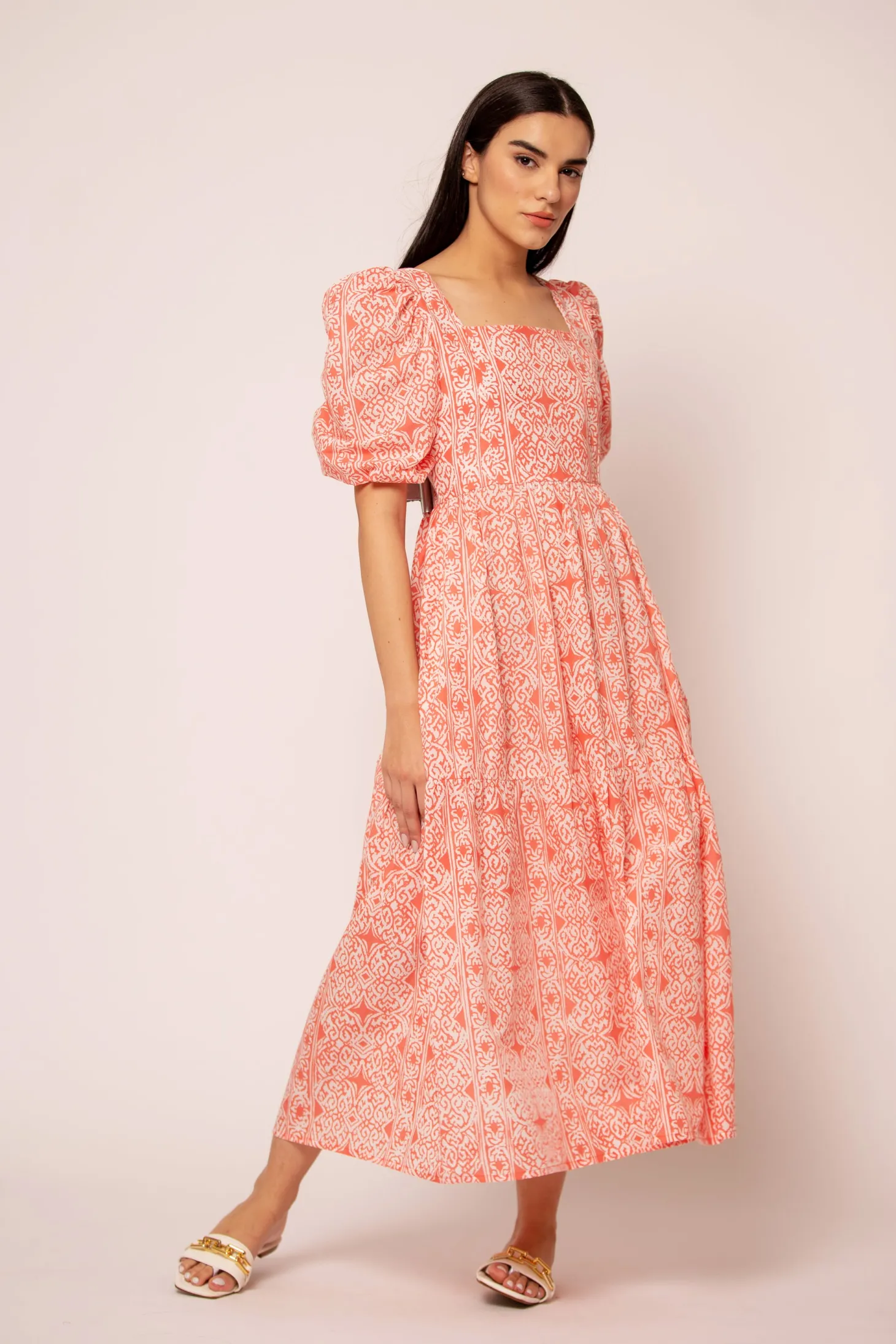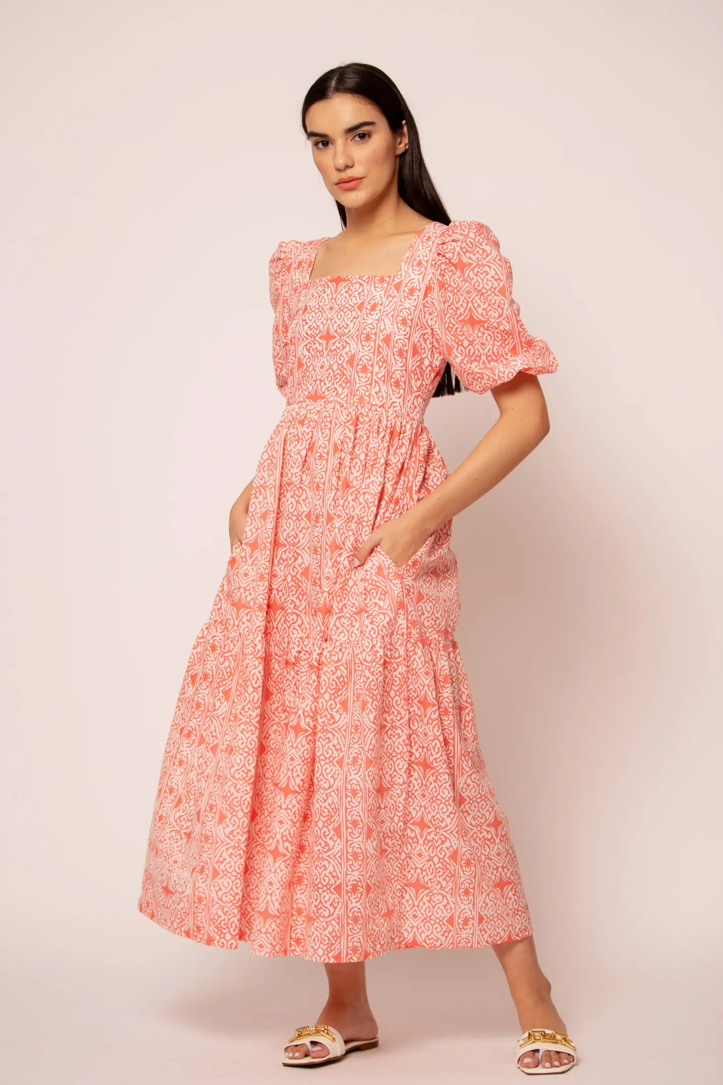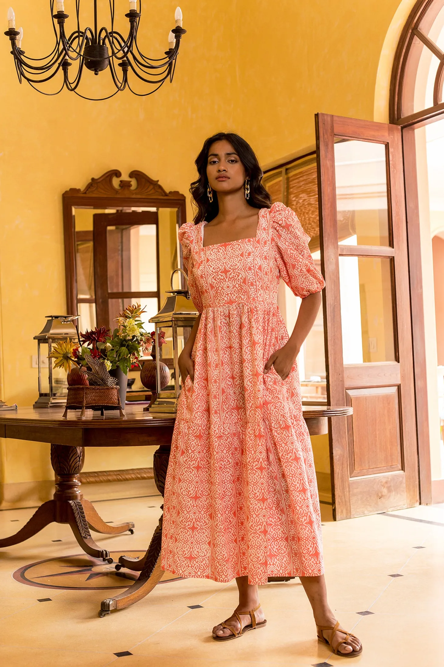 The romantic Estella dress is timeless yet flirty, with a flattering fit and a silhouette that is both elegant and functional. Estella features subtle puff sleeves, smocked details at the back and a chic square neckline. Estella is made from a soft, breathable cotton cambric fabric that will keep you cool on a hot summer day. The geometric artwork references the vaulted arches, stained glass works and ornamental details of Pondicherry’s ancient Basilica.