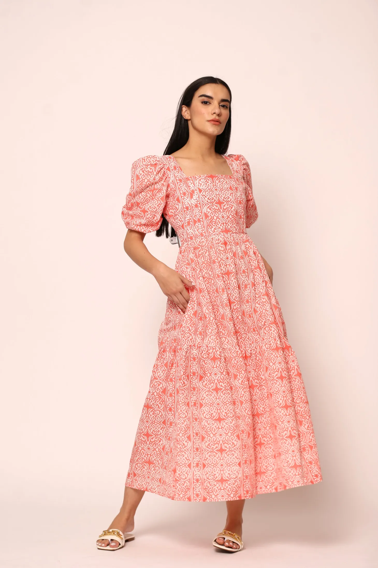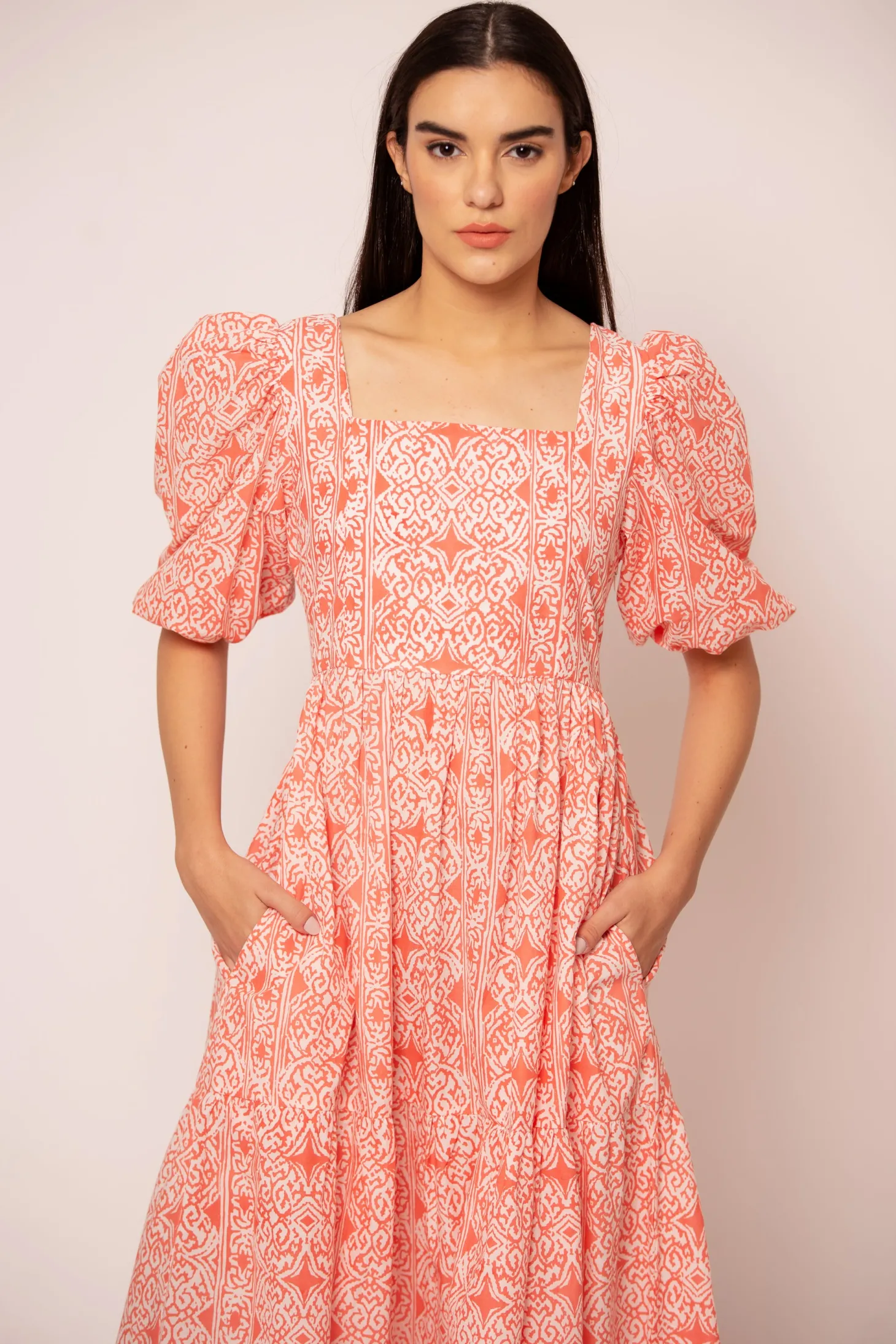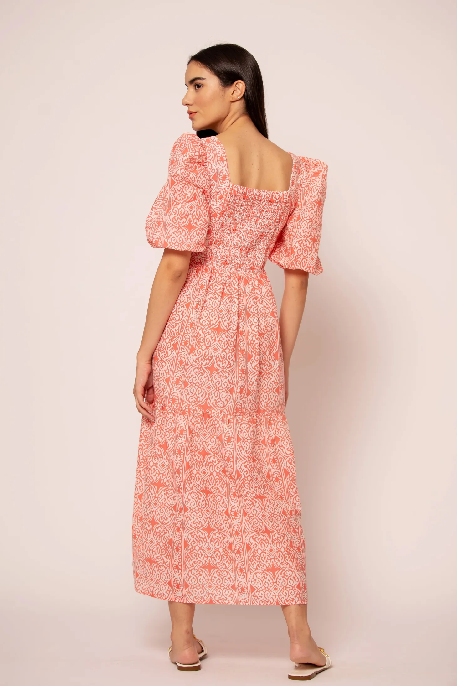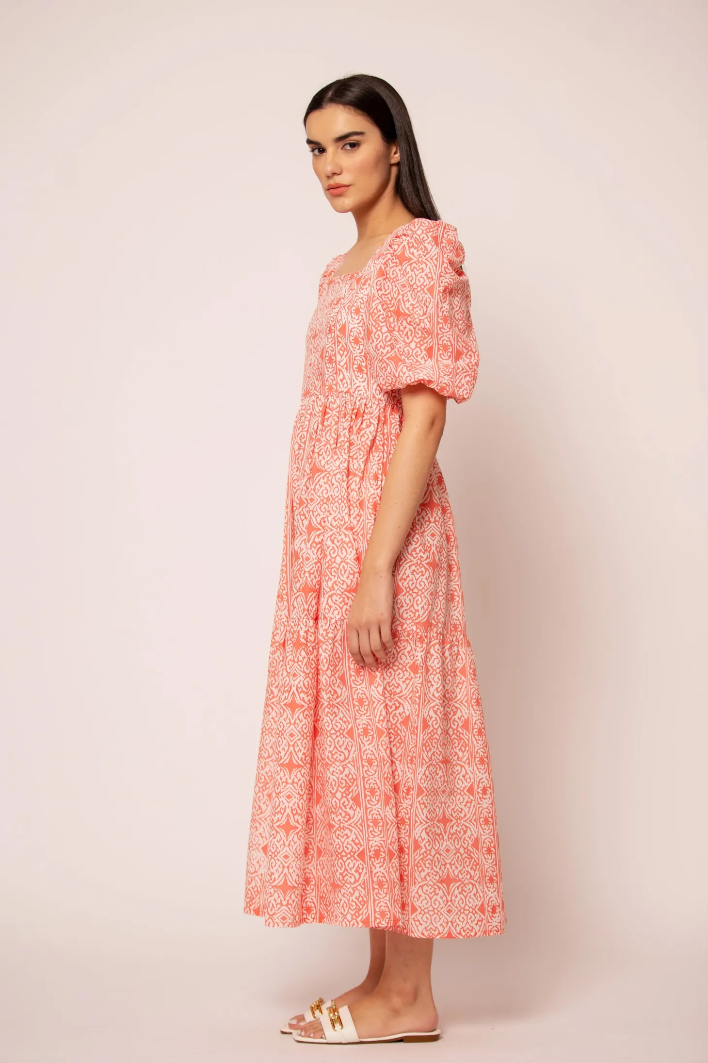 The romantic Estella dress is timeless yet flirty, with a flattering fit and a silhouette that is both elegant and functional. Estella features subtle puff sleeves, smocked details at the back and a chic square neckline. Estella is made from a soft, breathable cotton cambric fabric that will keep you cool on a hot summer day. The geometric artwork references the vaulted arches, stained glass works and ornamental details of Pondicherry’s ancient Basilica.