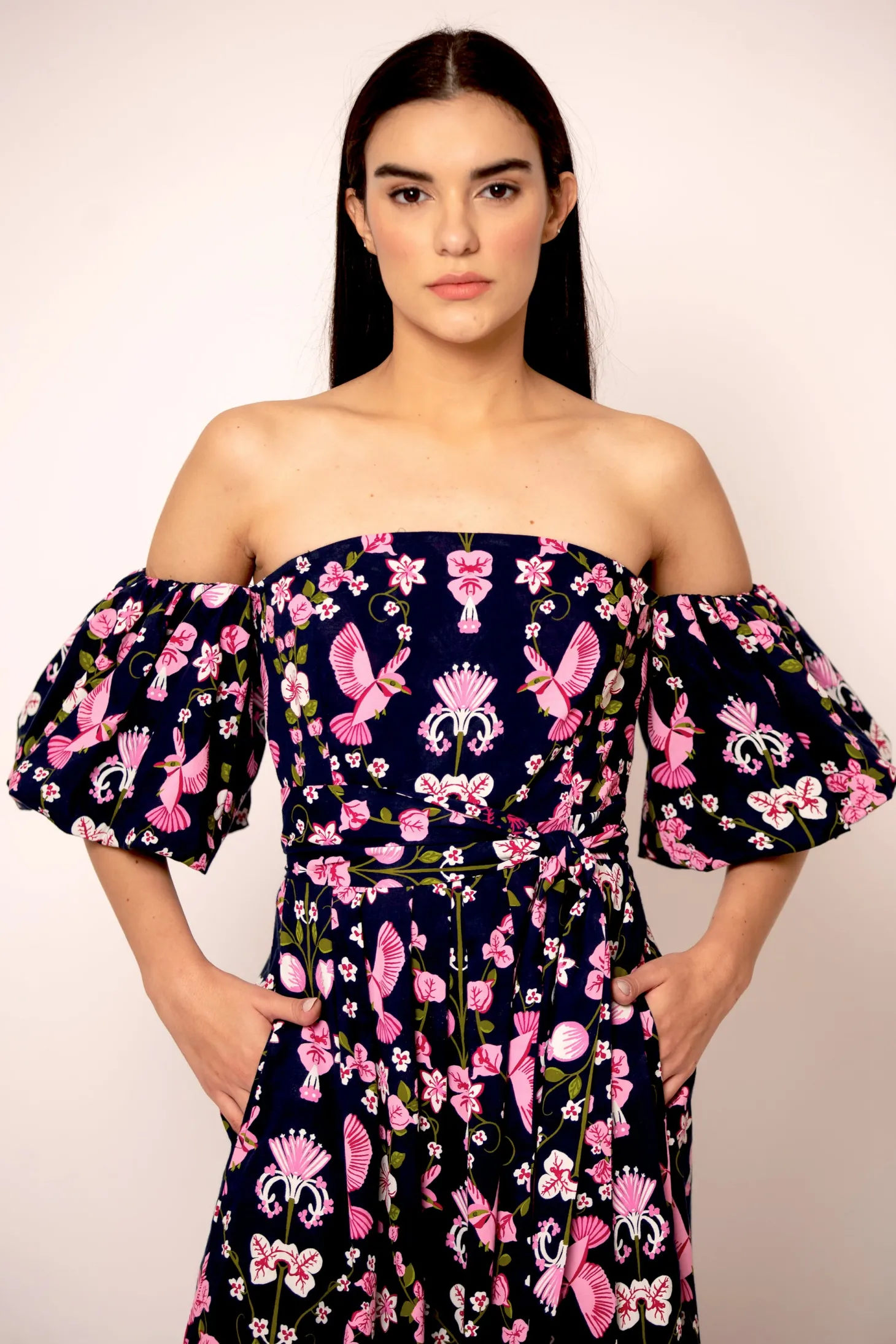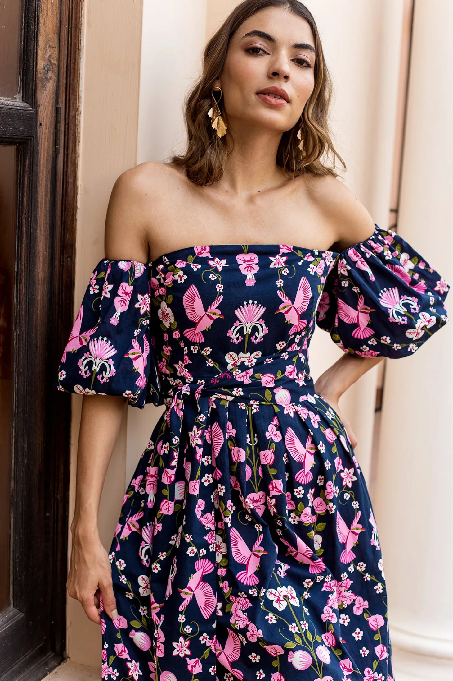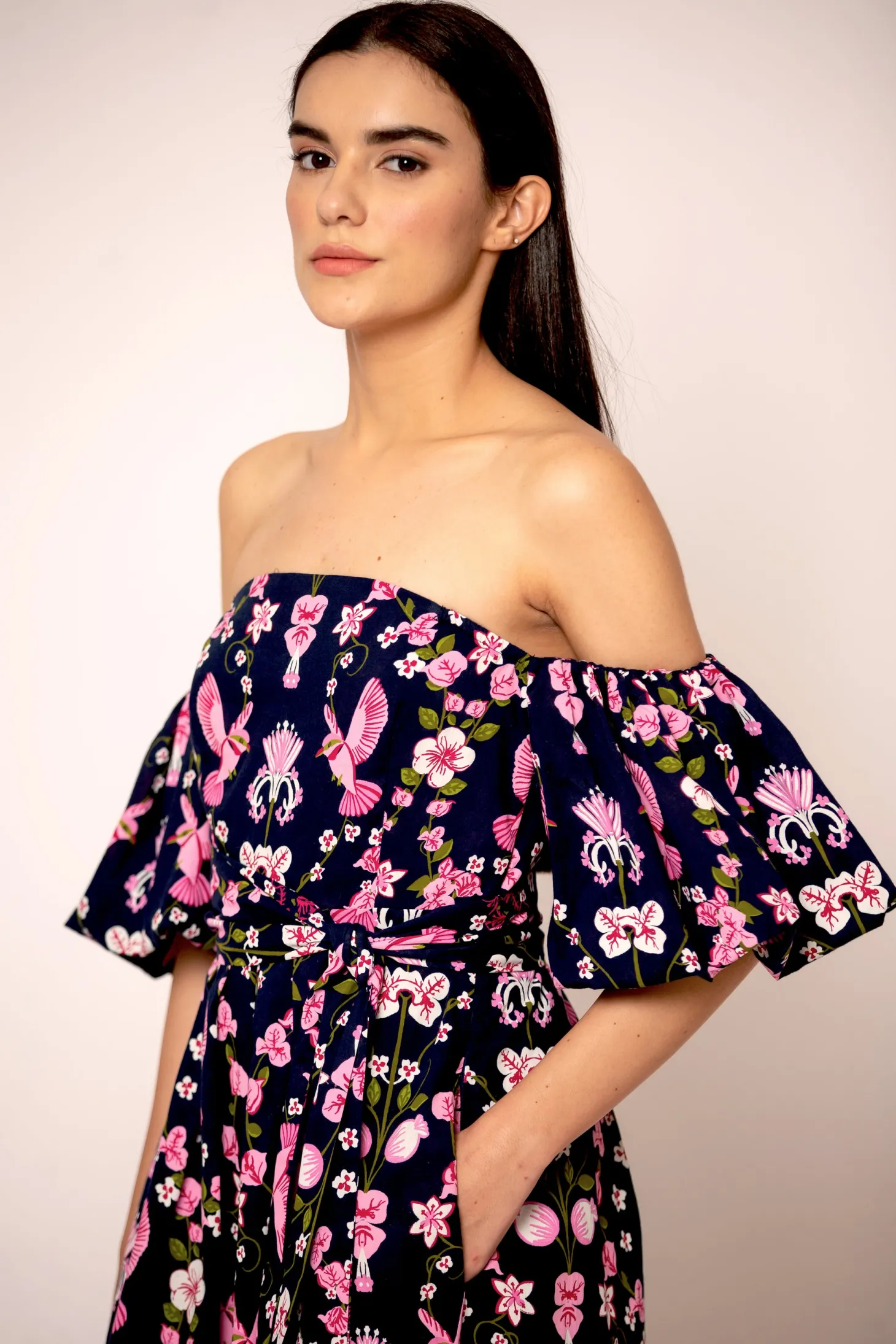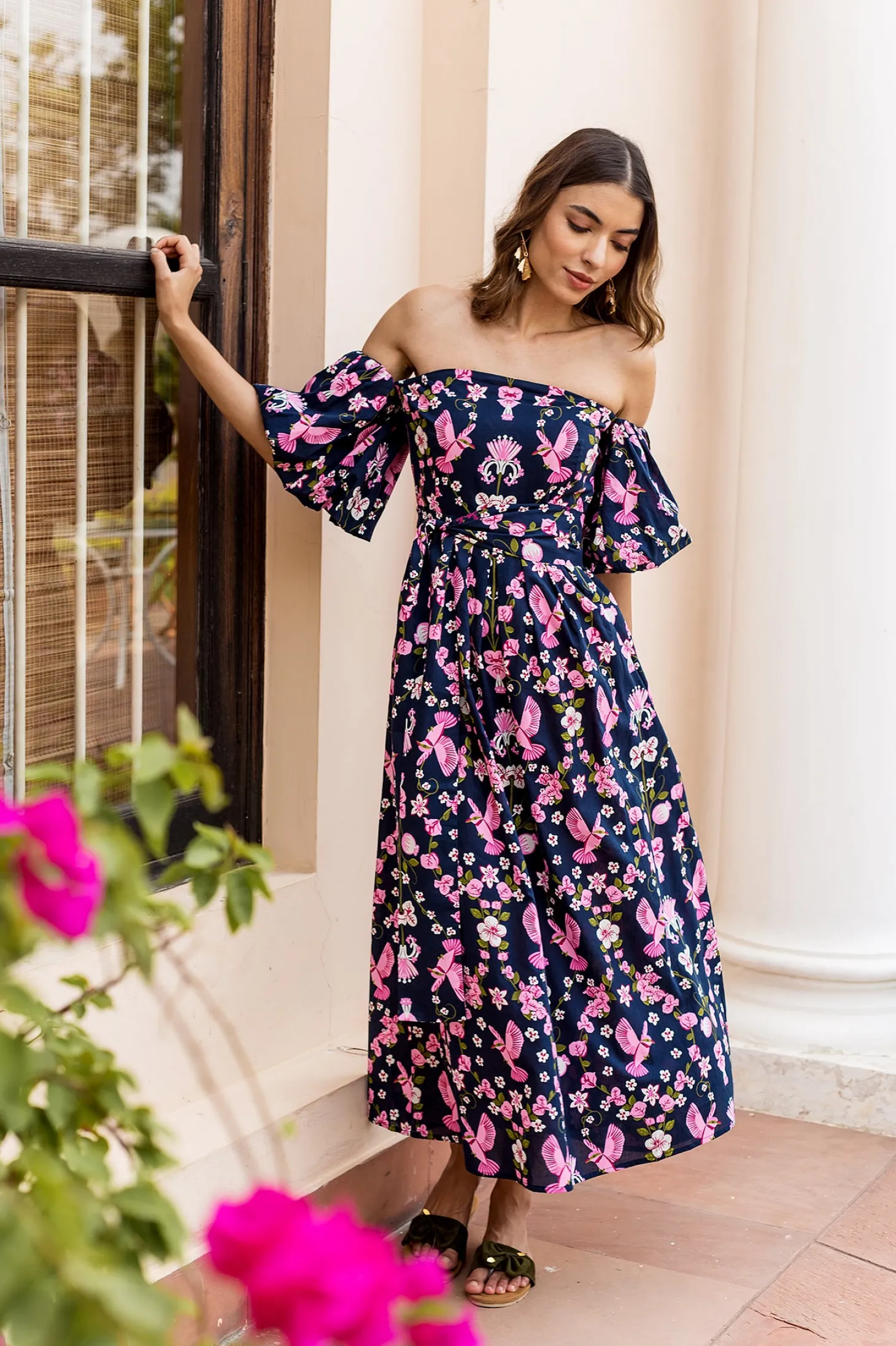 The flirty and glamourous Leah dress features romantic off the shoulder bubble sleeves, a fitted waist and a flattering A-line skirt. Leah is made from a soft, breathable cotton cambric fabric that will keep you cool on a hot summer day. The vibrant artwork is inspired by the romantic nostalgia of Pondicherry’s French mansions with patios covered in pink and peach bougainvilleas.