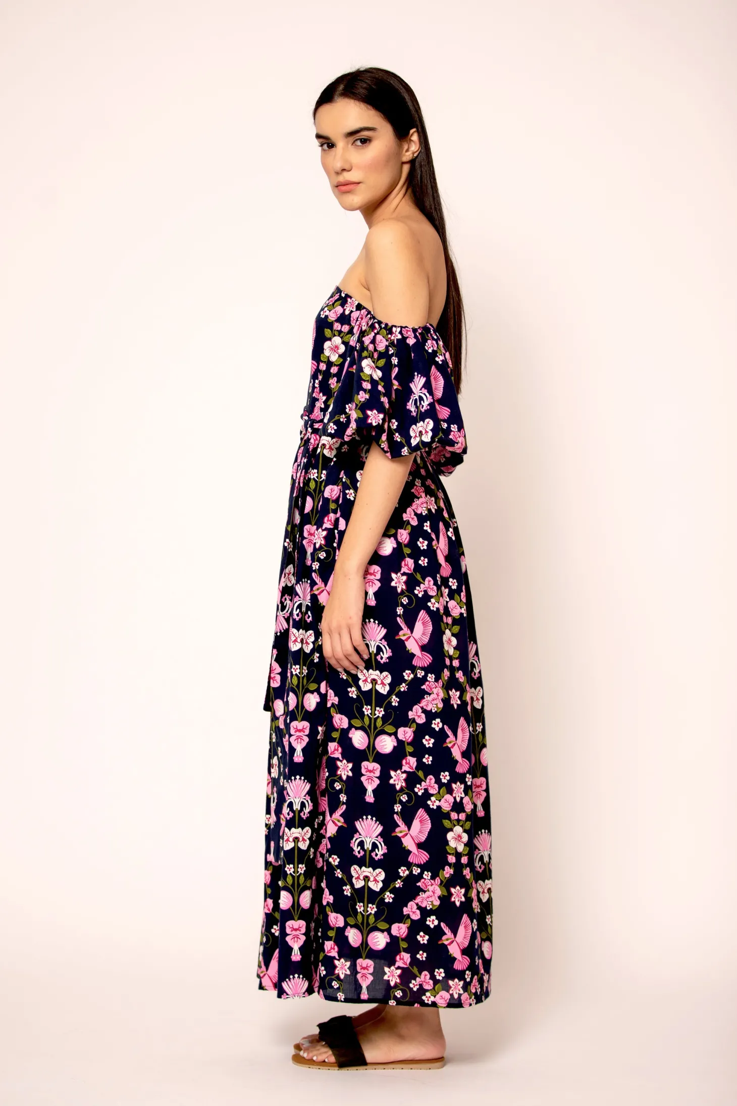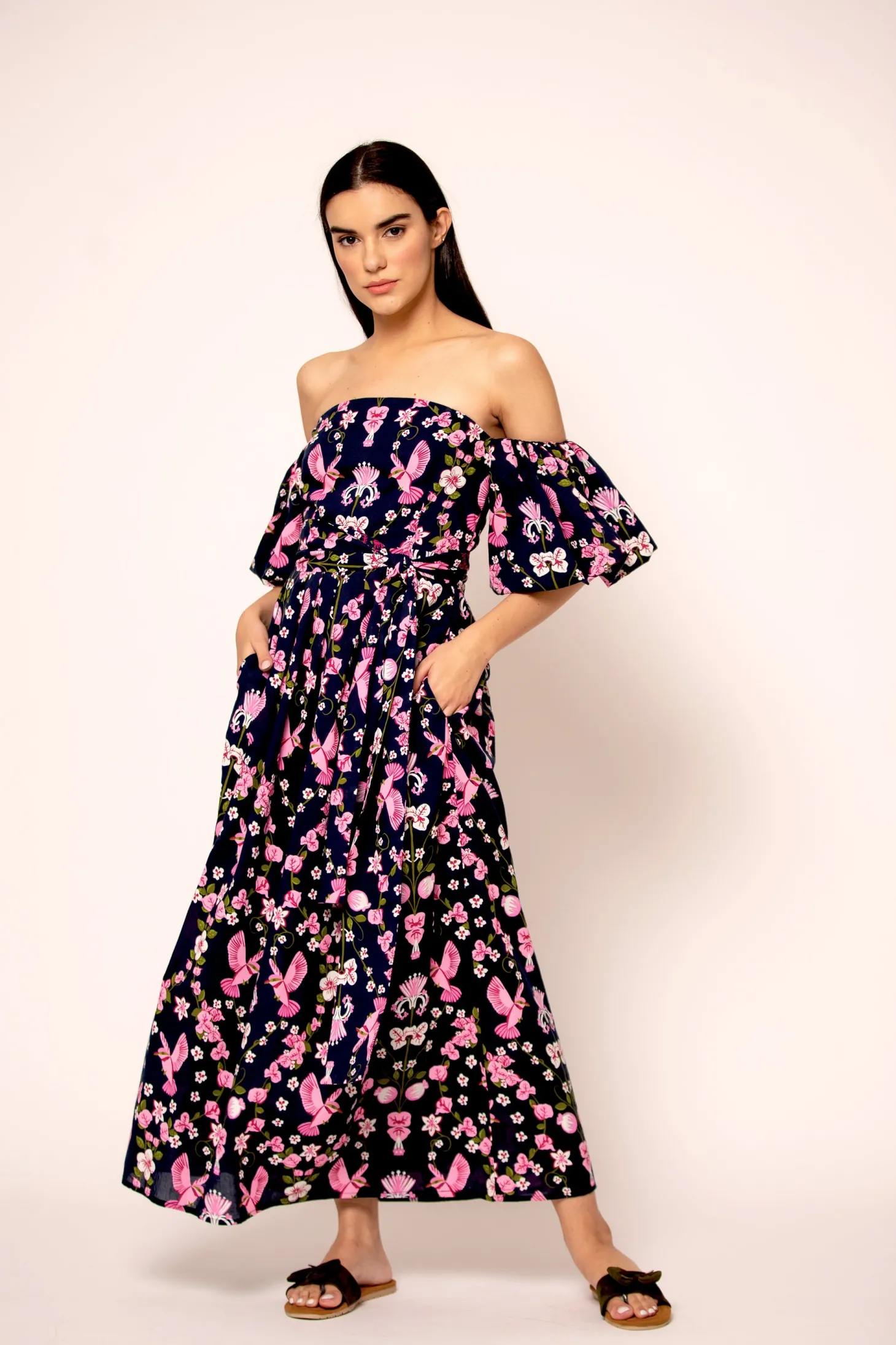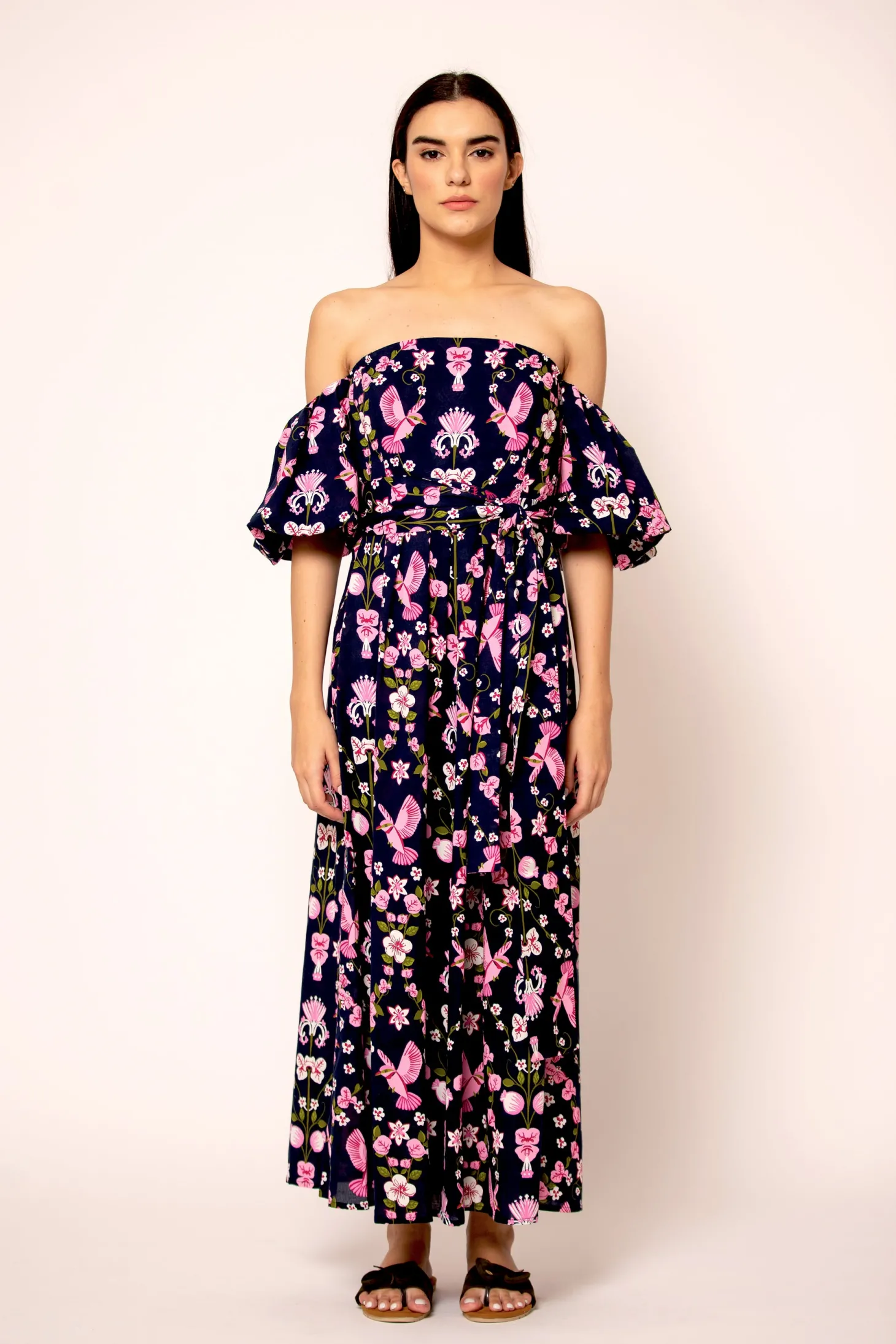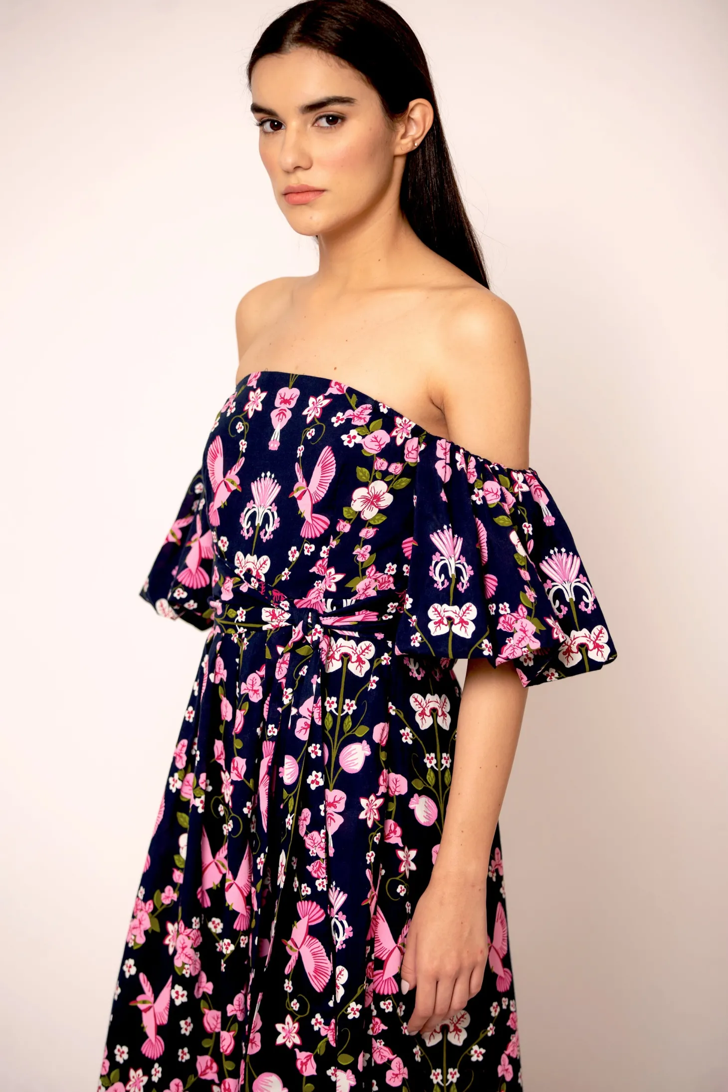 The flirty and glamourous Leah dress features romantic off the shoulder bubble sleeves, a fitted waist and a flattering A-line skirt. Leah is made from a soft, breathable cotton cambric fabric that will keep you cool on a hot summer day. The vibrant artwork is inspired by the romantic nostalgia of Pondicherry’s French mansions with patios covered in pink and peach bougainvilleas.