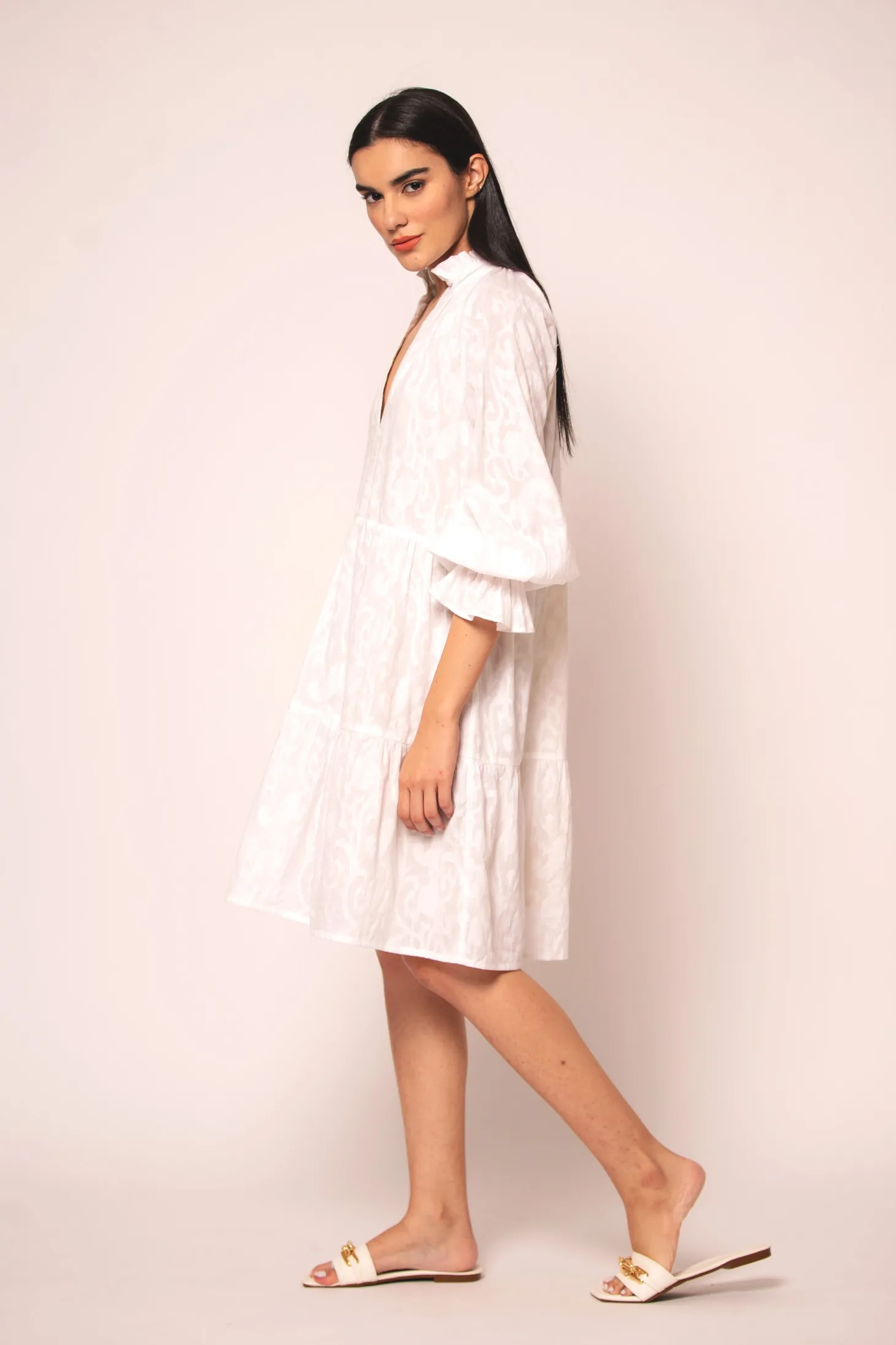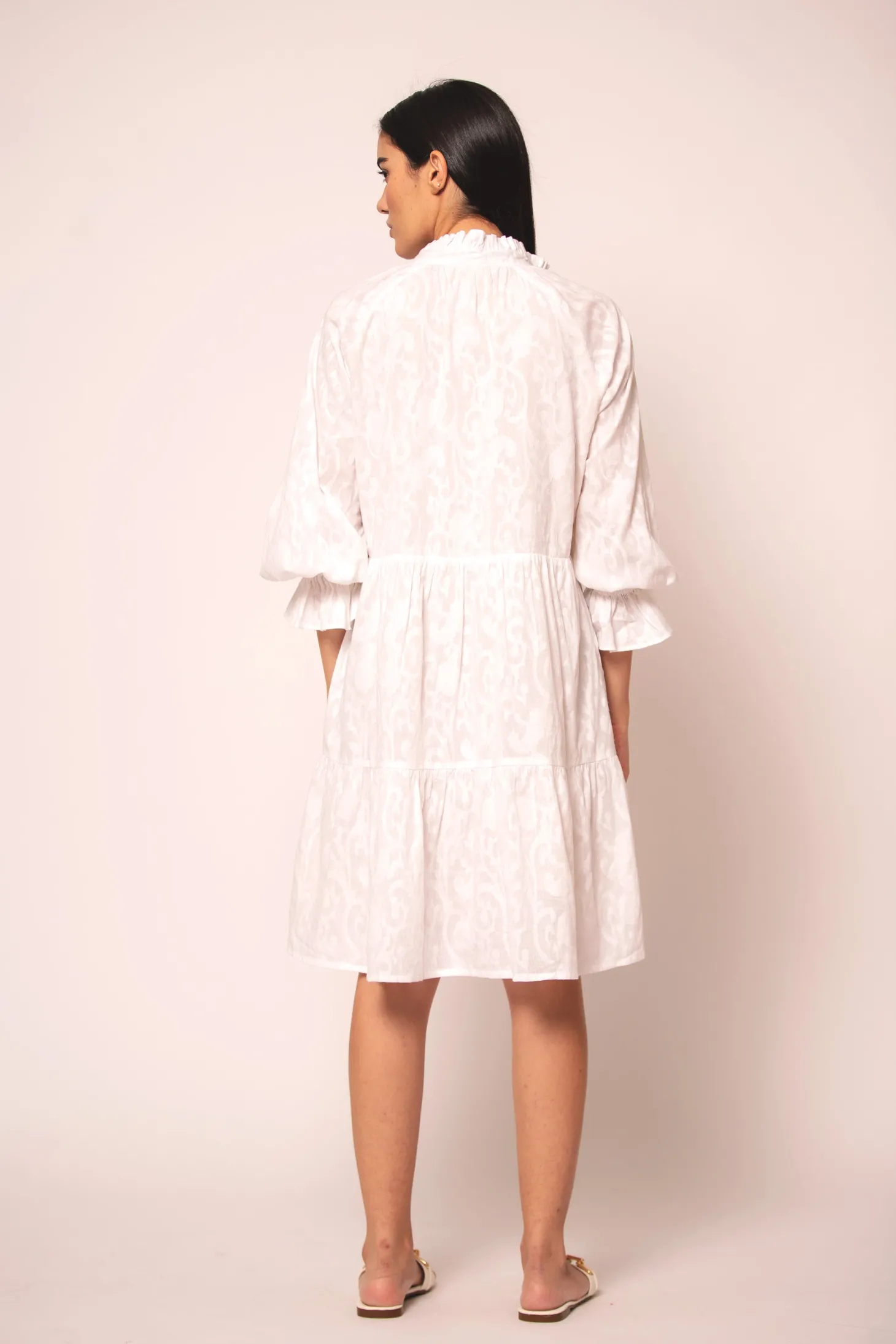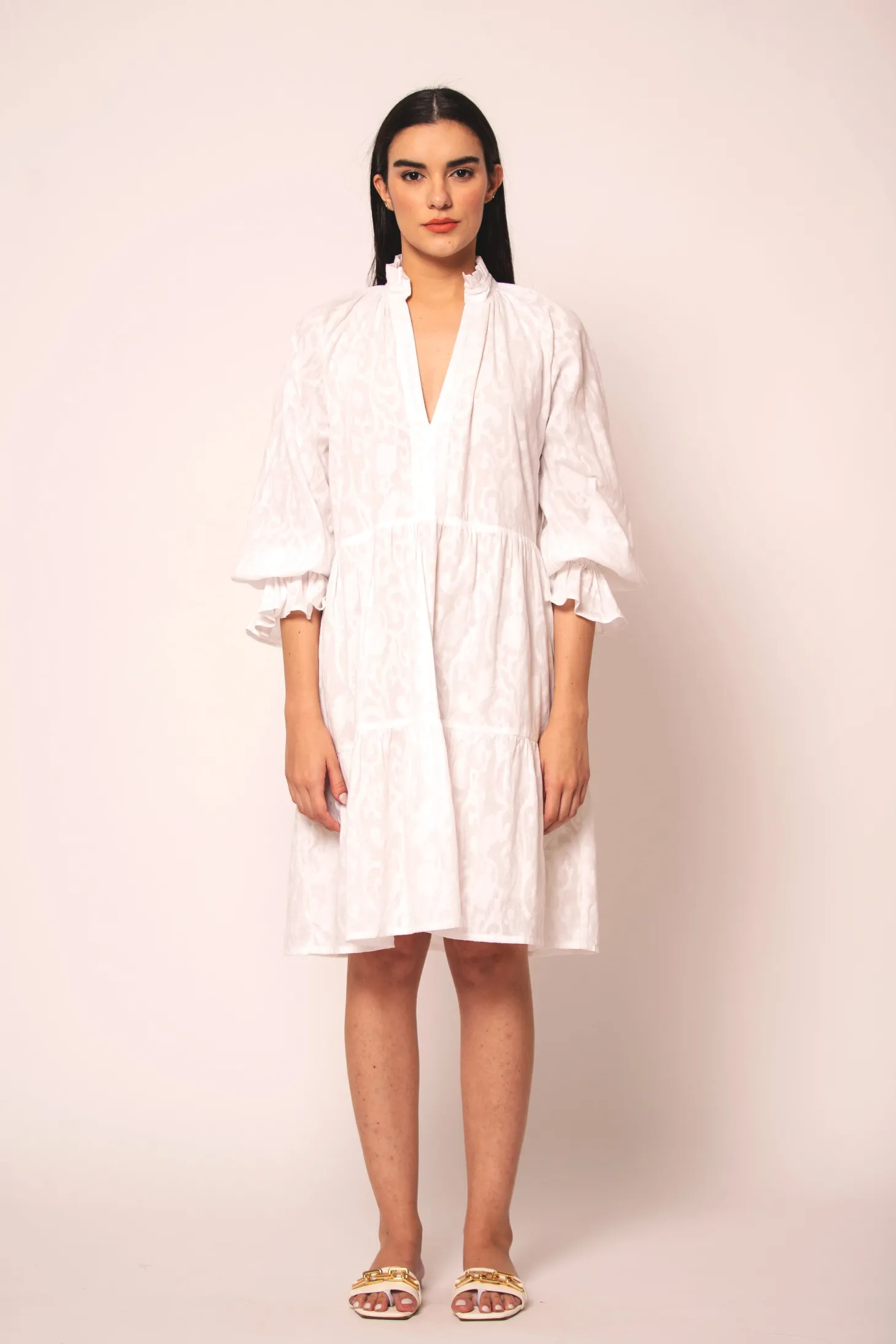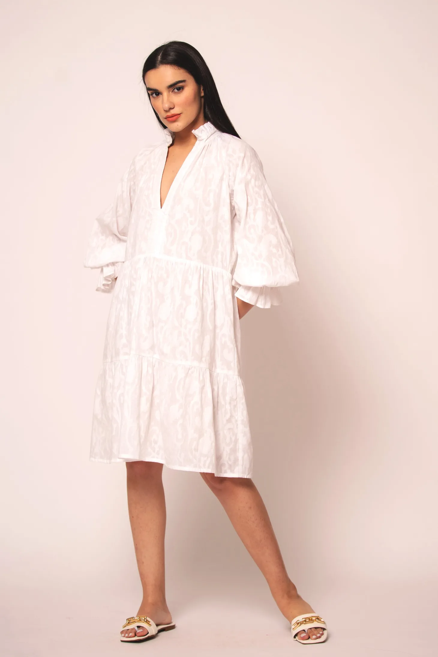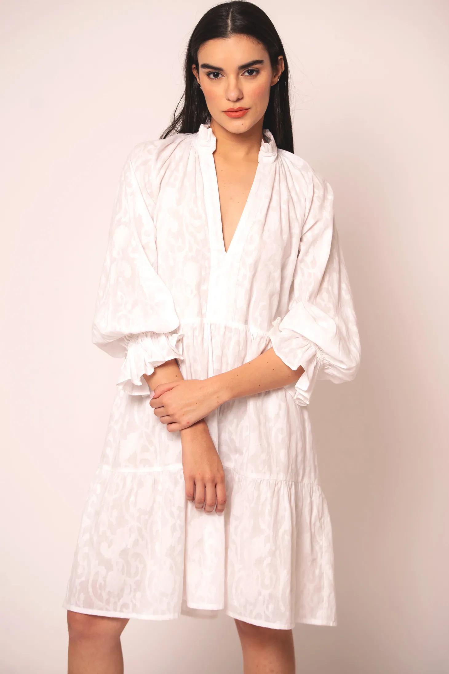 The Juliet is a flirty and effortless silhouette featuring a V-neckline and billowing sleeves. The pleats at the neck and tiered bottom give it an elegant touch. Juliet is crafted from luxurious, lightweight cotton jacquard fabric showcasing an intricate floral pattern. The Jacquard weave references the antique French décor of Pondicherry’s historic mansions.