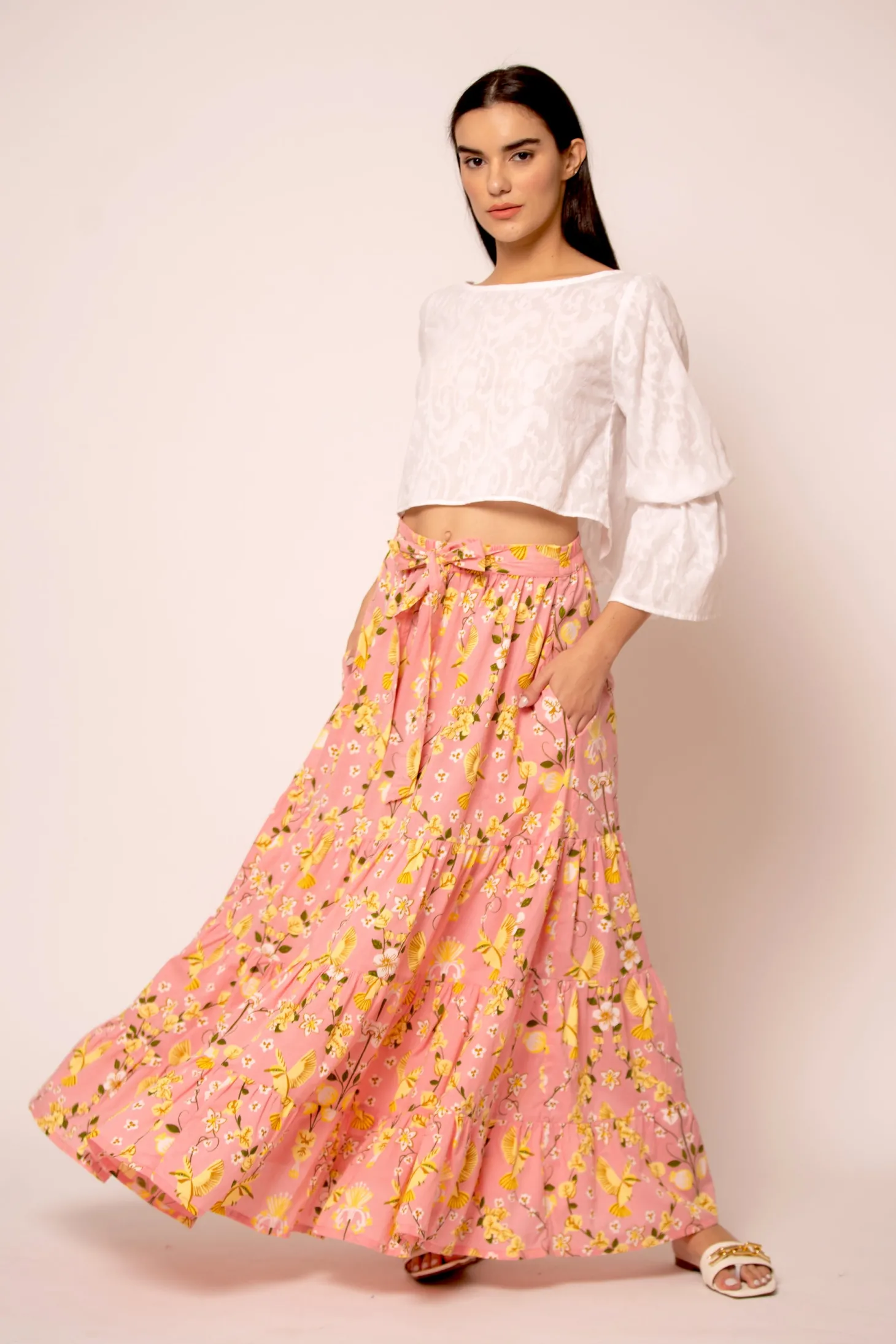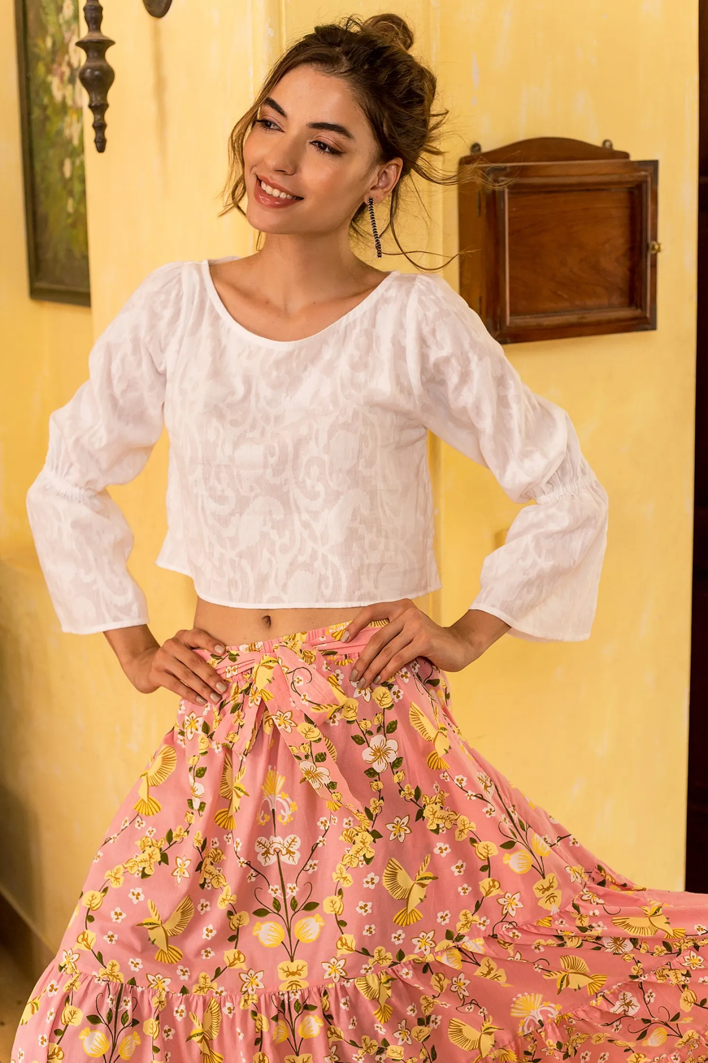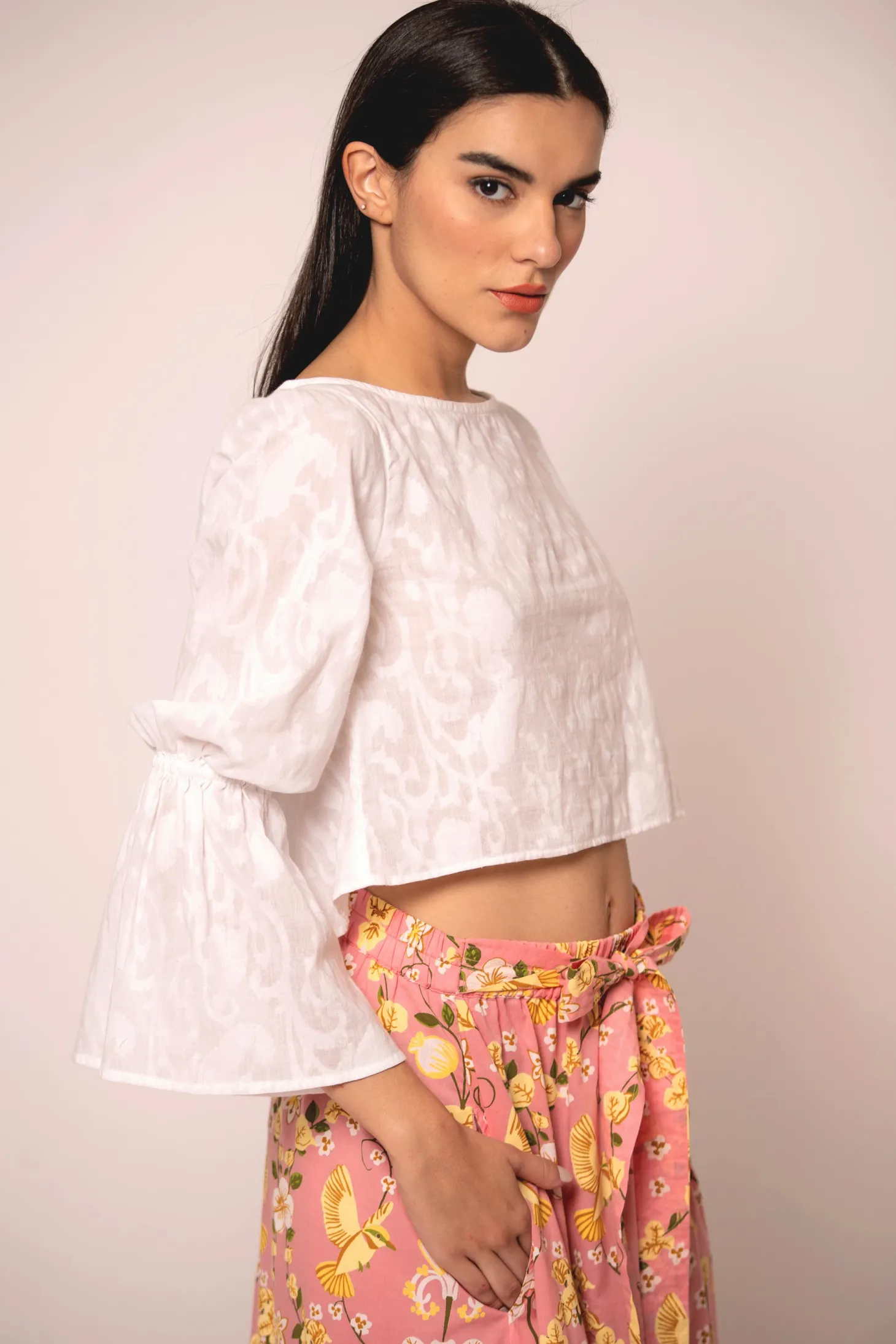The chic Blair features a classy boatneck, high-low A-line bodice and stunning bell sleeves. Complete the look with our fabulous Gia skirt. Blair is crafted from luxurious, lightweight cotton jacquard fabric showcasing an intricate floral pattern. The Jacquard weave references the antique French décor of Pondicherry’s historic mansions.