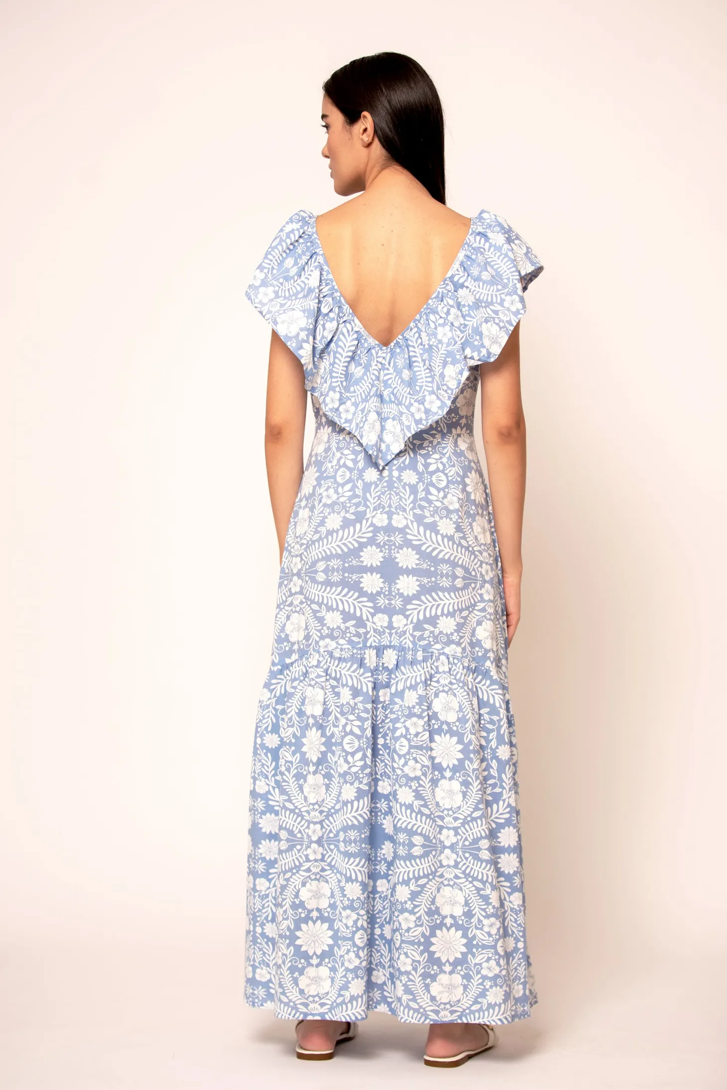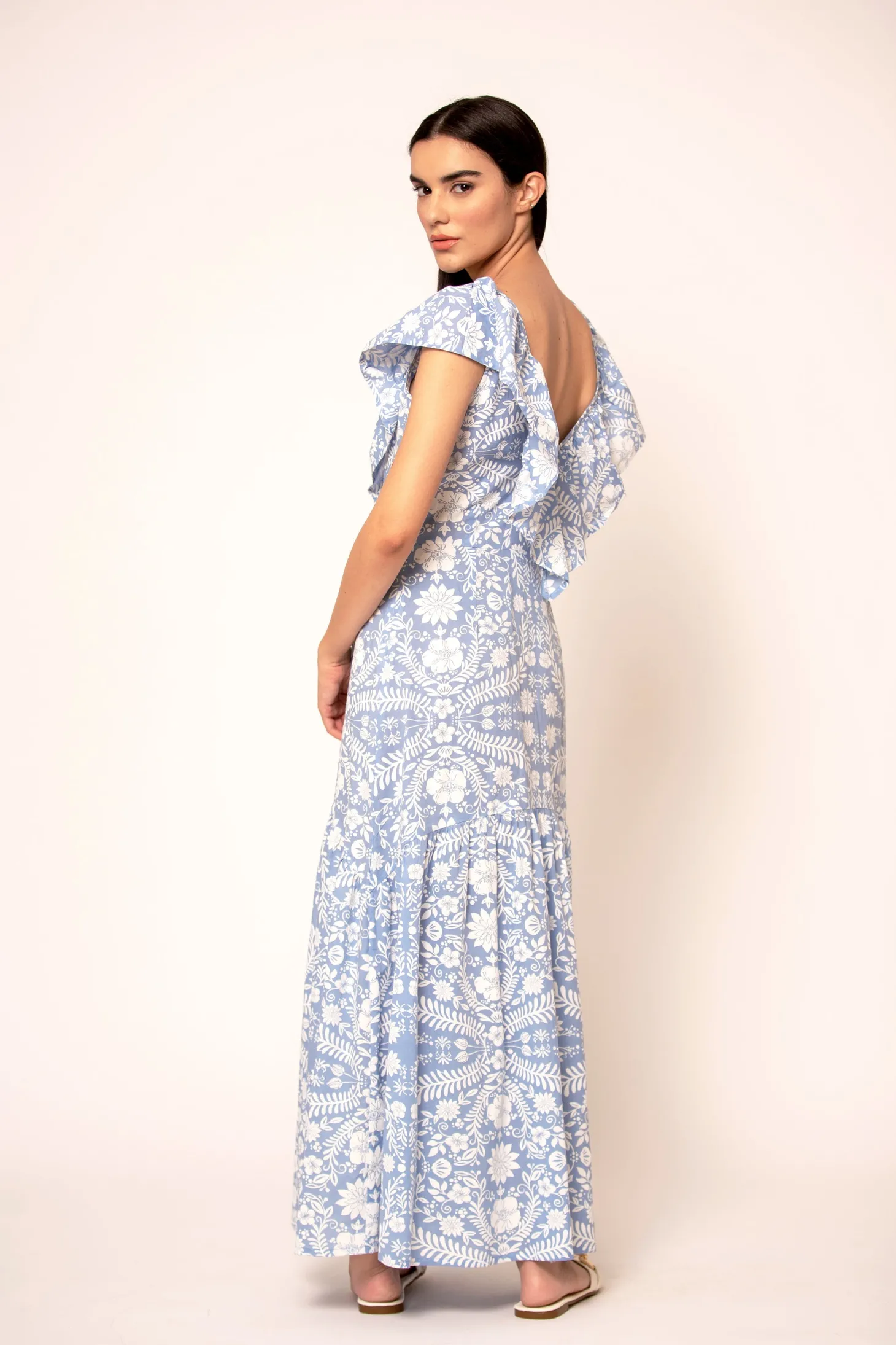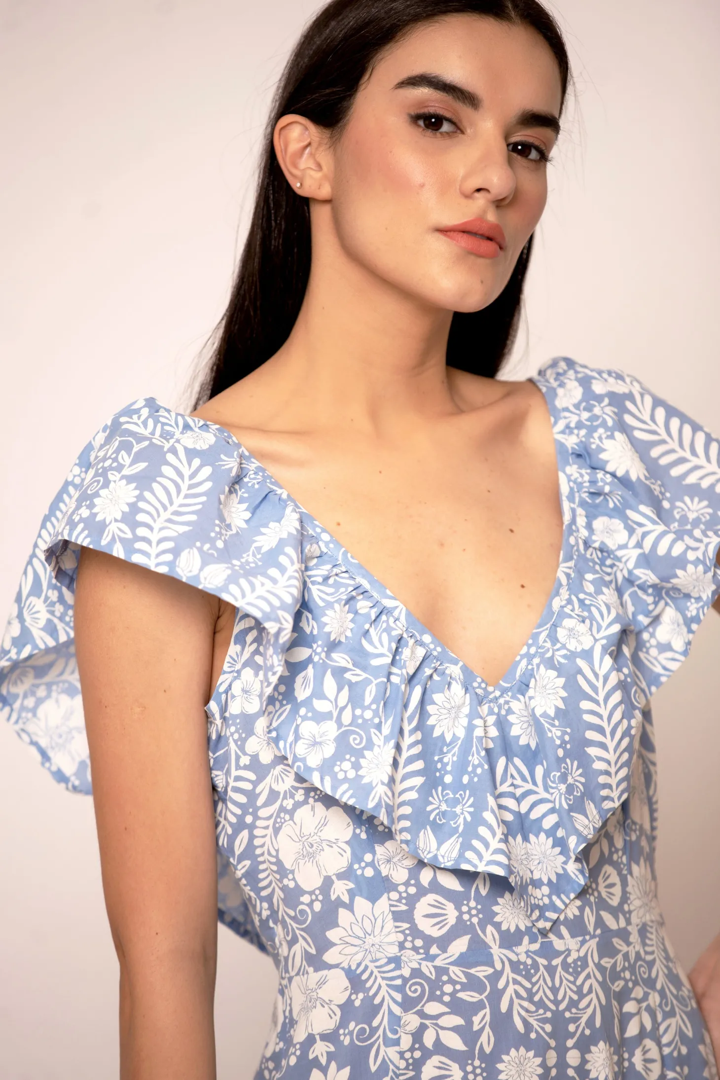 The Ella features a feminine silhouette with an exaggerated flutter V-neck and a fitted waist. The intriguing ruffle placements on the skirt bottom give the look a contemporary edge. Ella is made from a soft, breathable cotton cambric fabric that will keep you cool on a hot summer day. “Paradiso” is inspired by the serenity and lush nature of Pondicherry’s backwaters that are lined with dense palm trees.