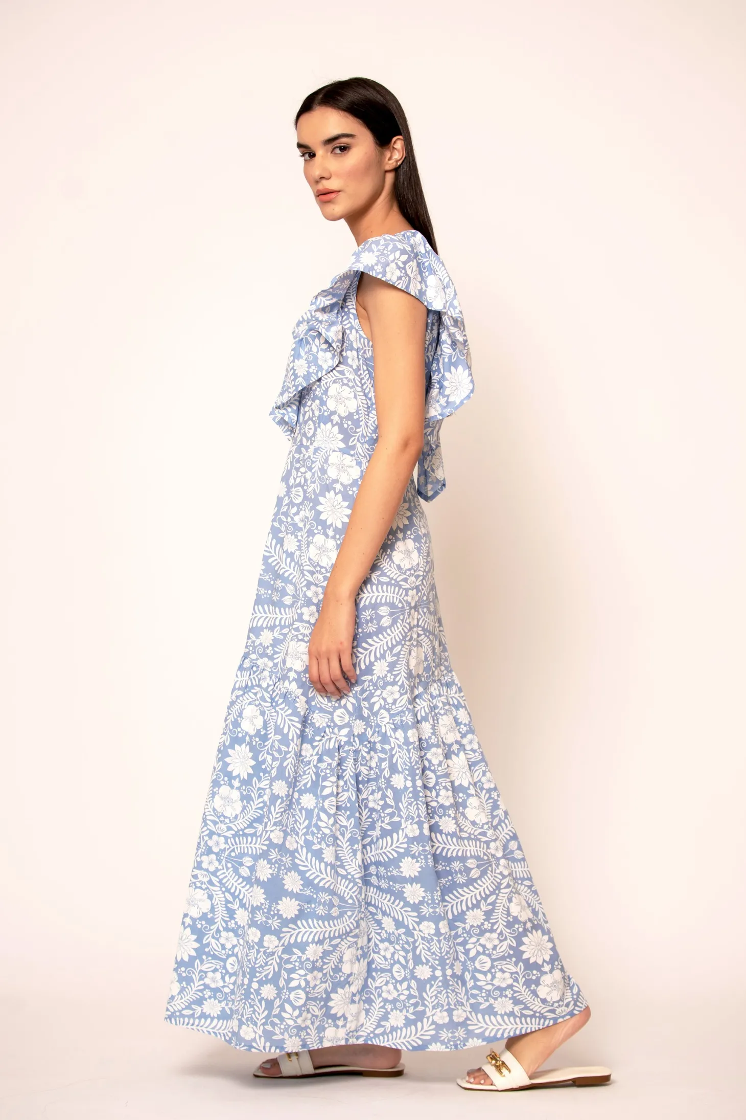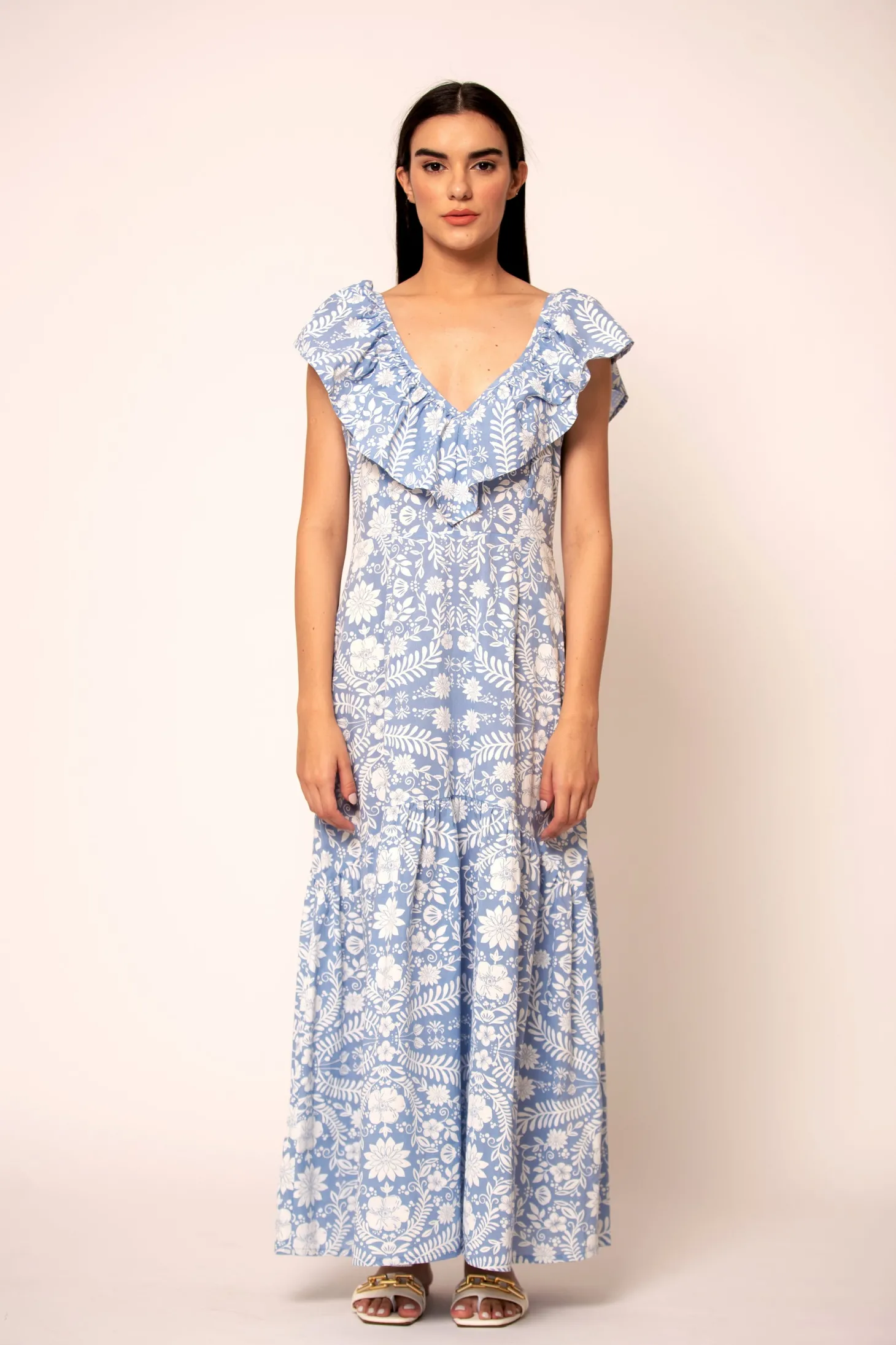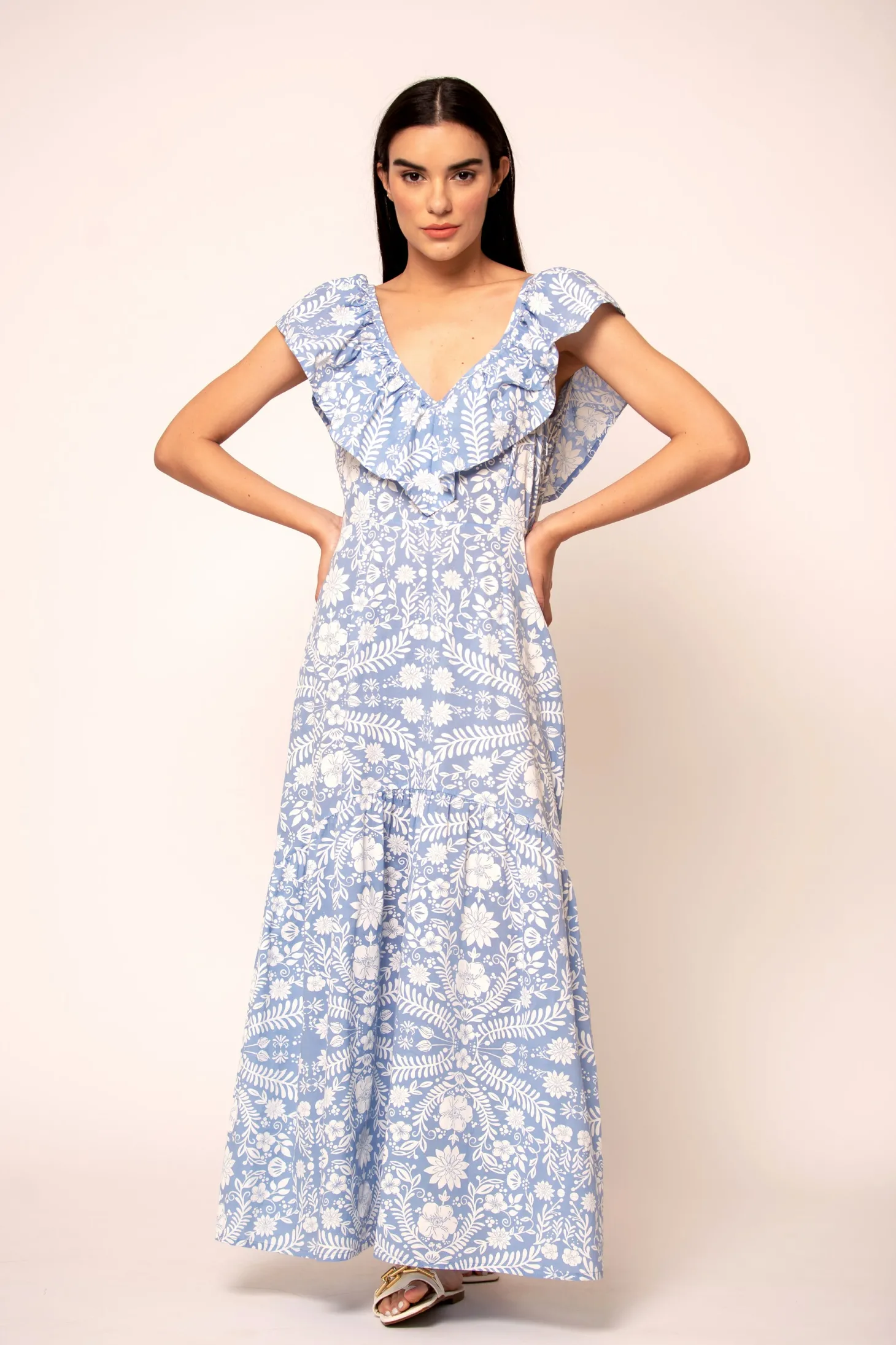 The Ella features a feminine silhouette with an exaggerated flutter V-neck and a fitted waist. The intriguing ruffle placements on the skirt bottom give the look a contemporary edge. Ella is made from a soft, breathable cotton cambric fabric that will keep you cool on a hot summer day. “Paradiso” is inspired by the serenity and lush nature of Pondicherry’s backwaters that are lined with dense palm trees.