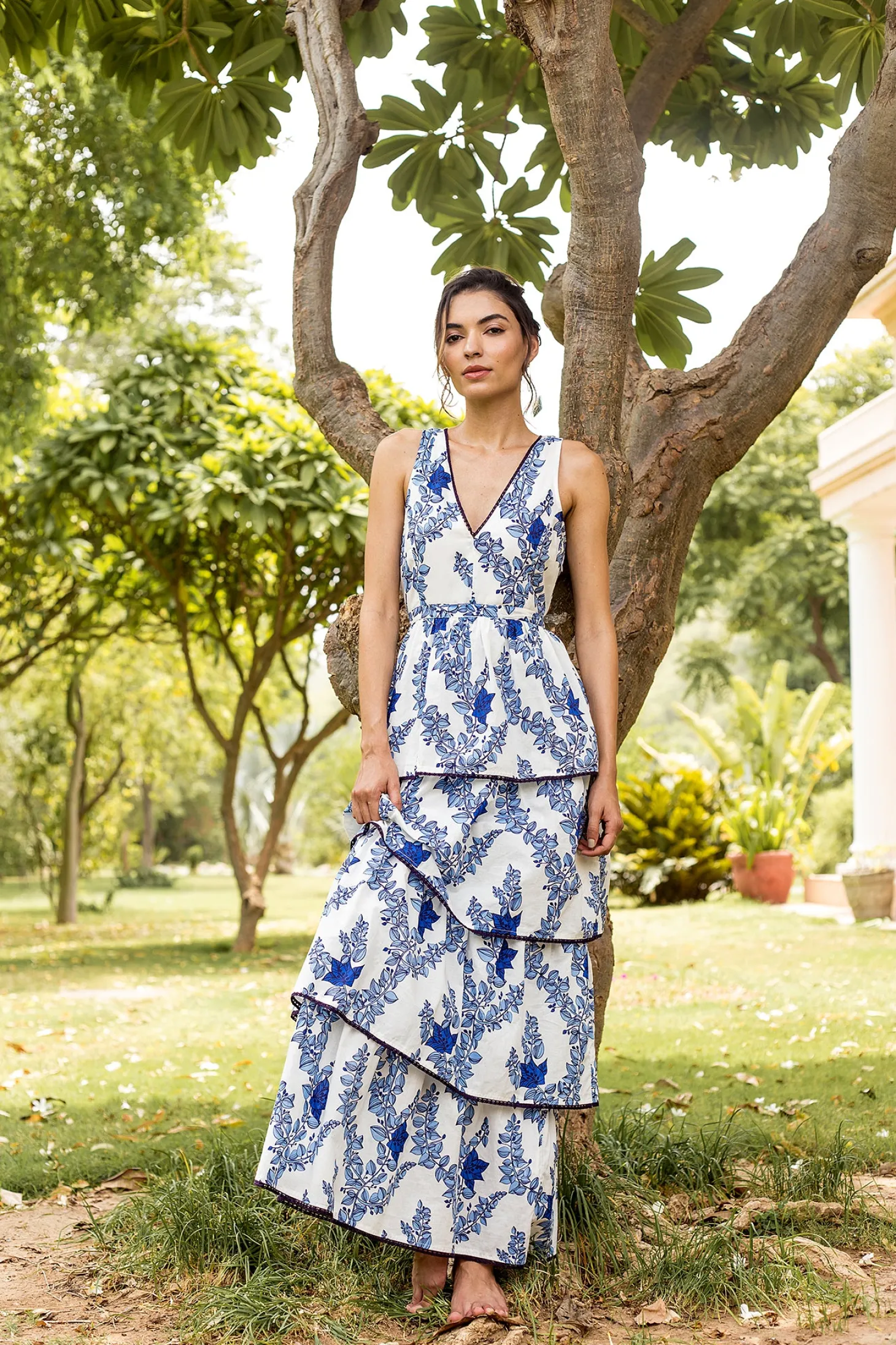 The Cecile is what summer dreams are made of. Featuring an enticing V-neck, layered skirt and delicate lace trims, this stunning dress easily sways from garden parties to moonlit nights. Cecil is made from a soft, breathable cotton cambric fabric that will keep you cool on a hot summer day. The floral artwork is inspired by the bright-hued bougainvilleas lining almost every street in Pondicherry’s French Quarter.