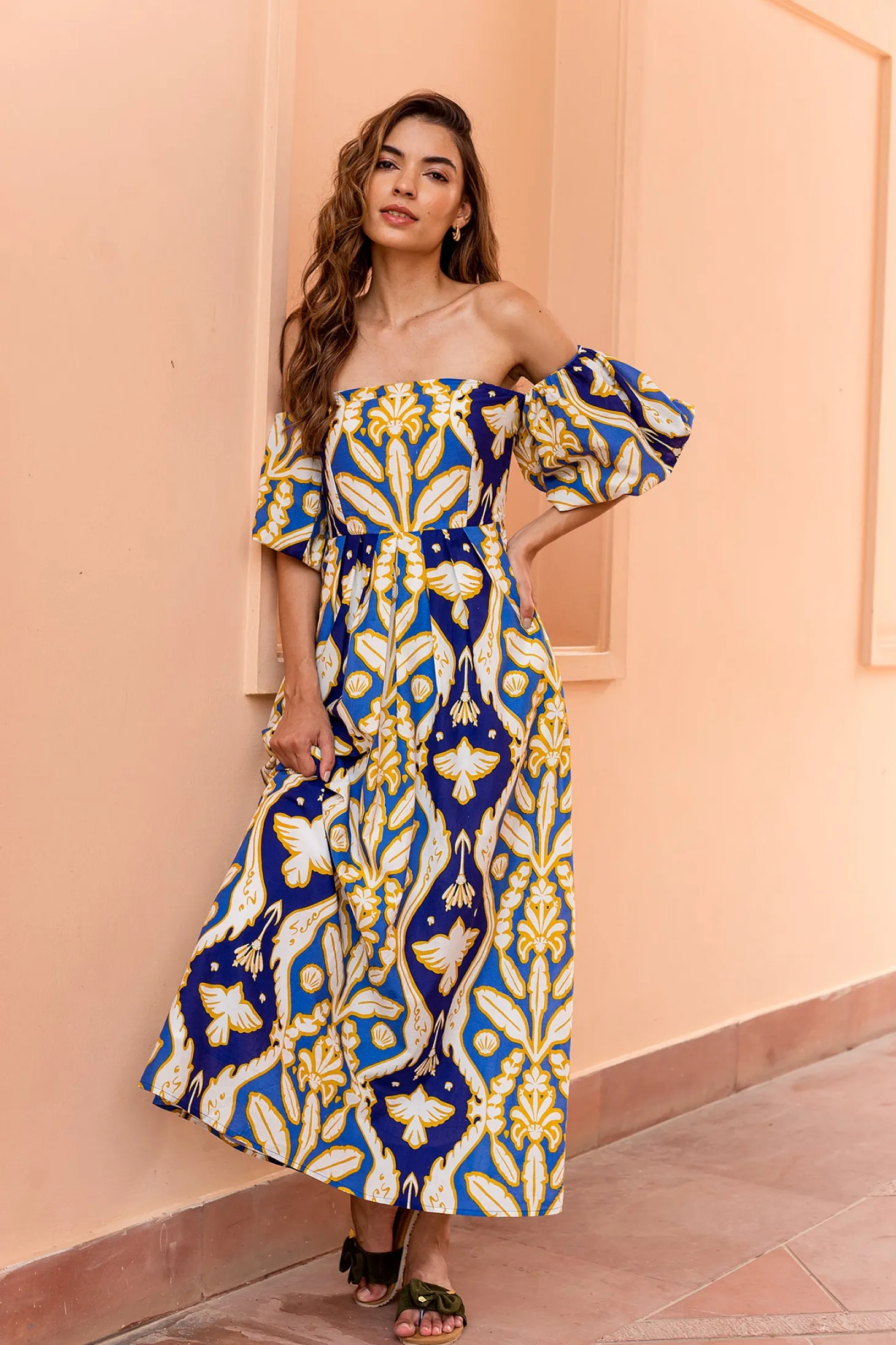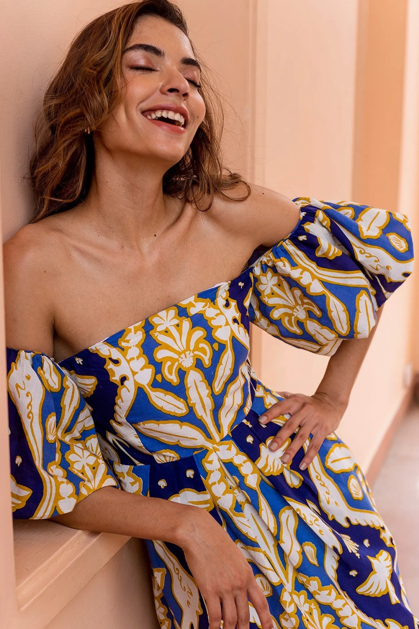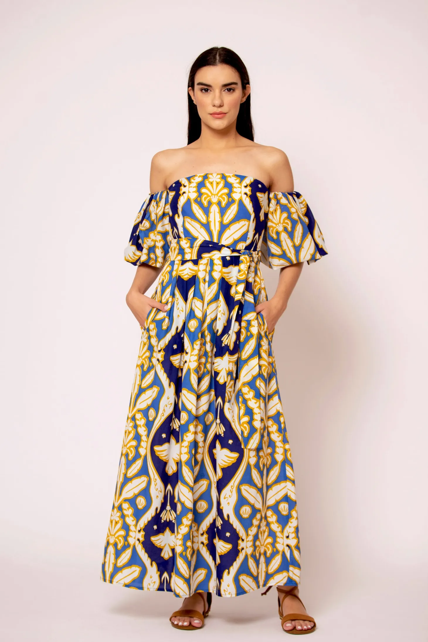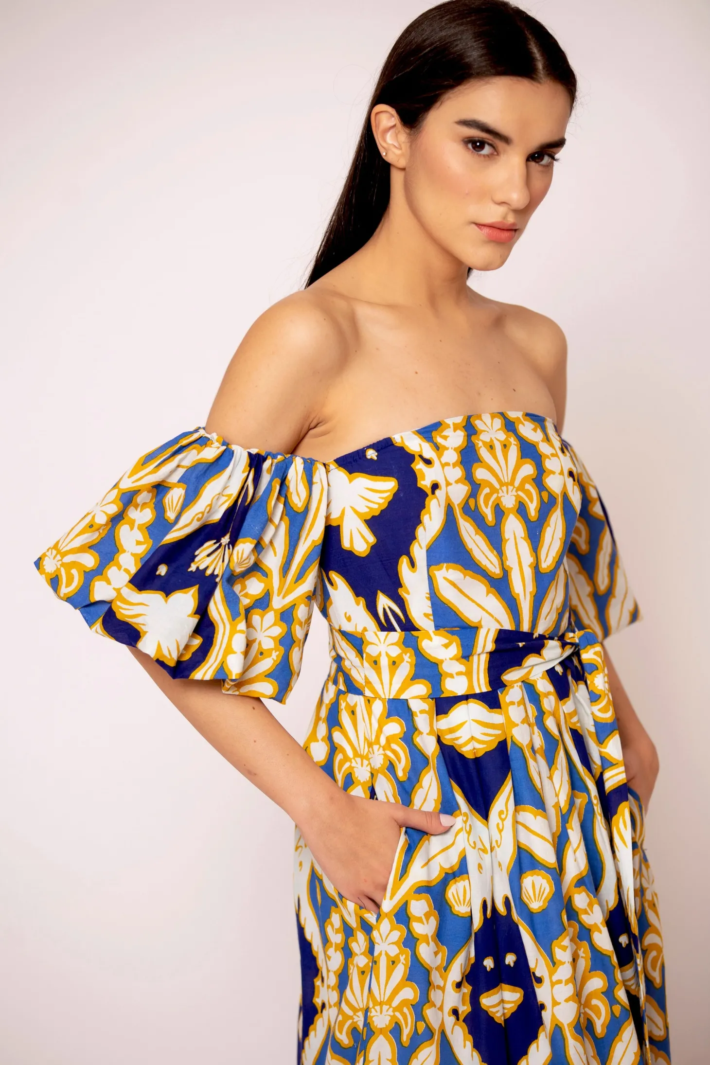 The flirty and glamourous Leah dress features romantic off the shoulder bubble sleeves, a fitted waist and a flattering A-line skirt. Leah is made from a soft, breathable cotton cambric fabric that will keep you cool on a hot summer day. The print echoes Pondicherry’s wildlife with motives of elephant trunks, shells, banana leaves and birds.