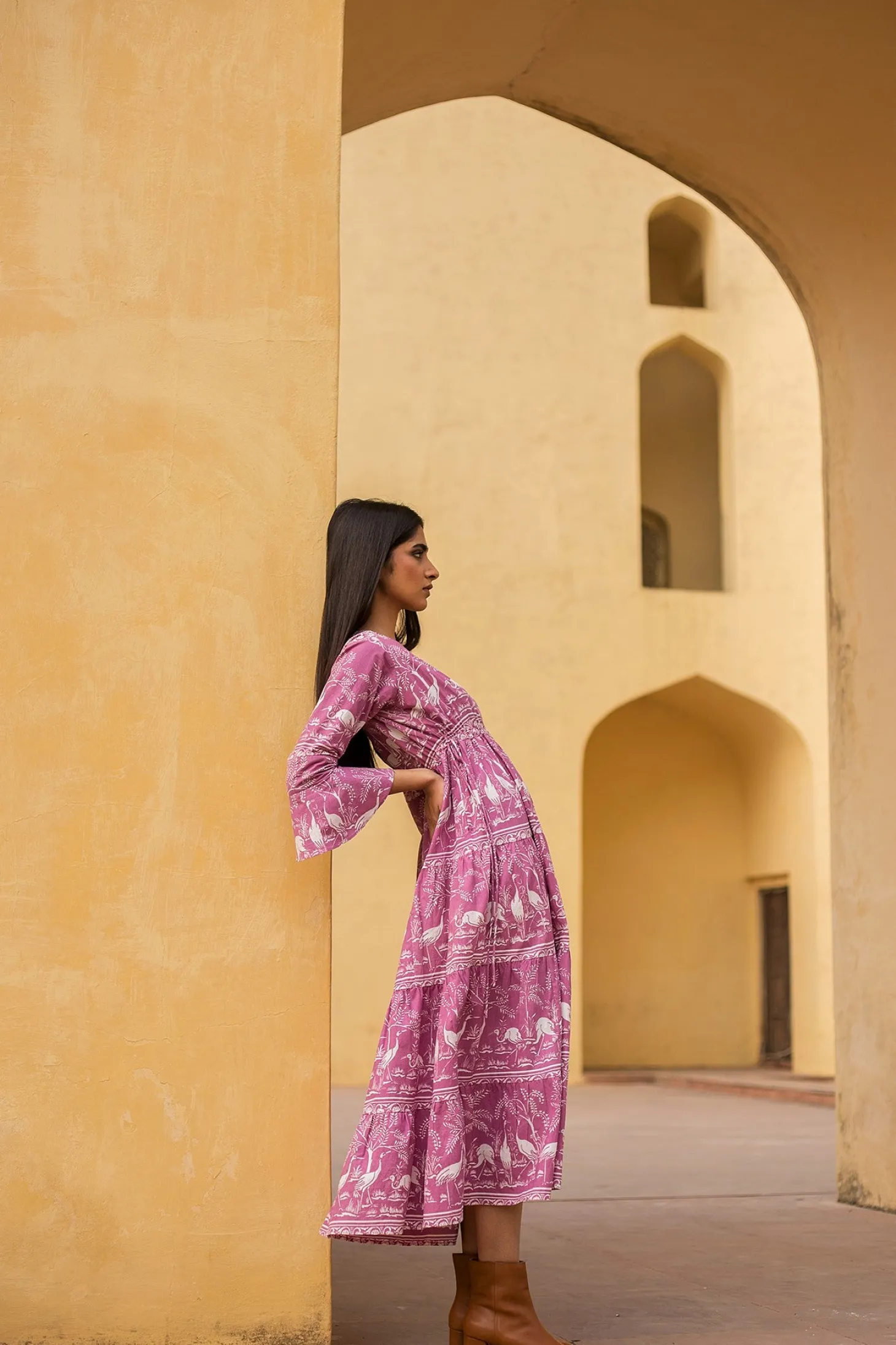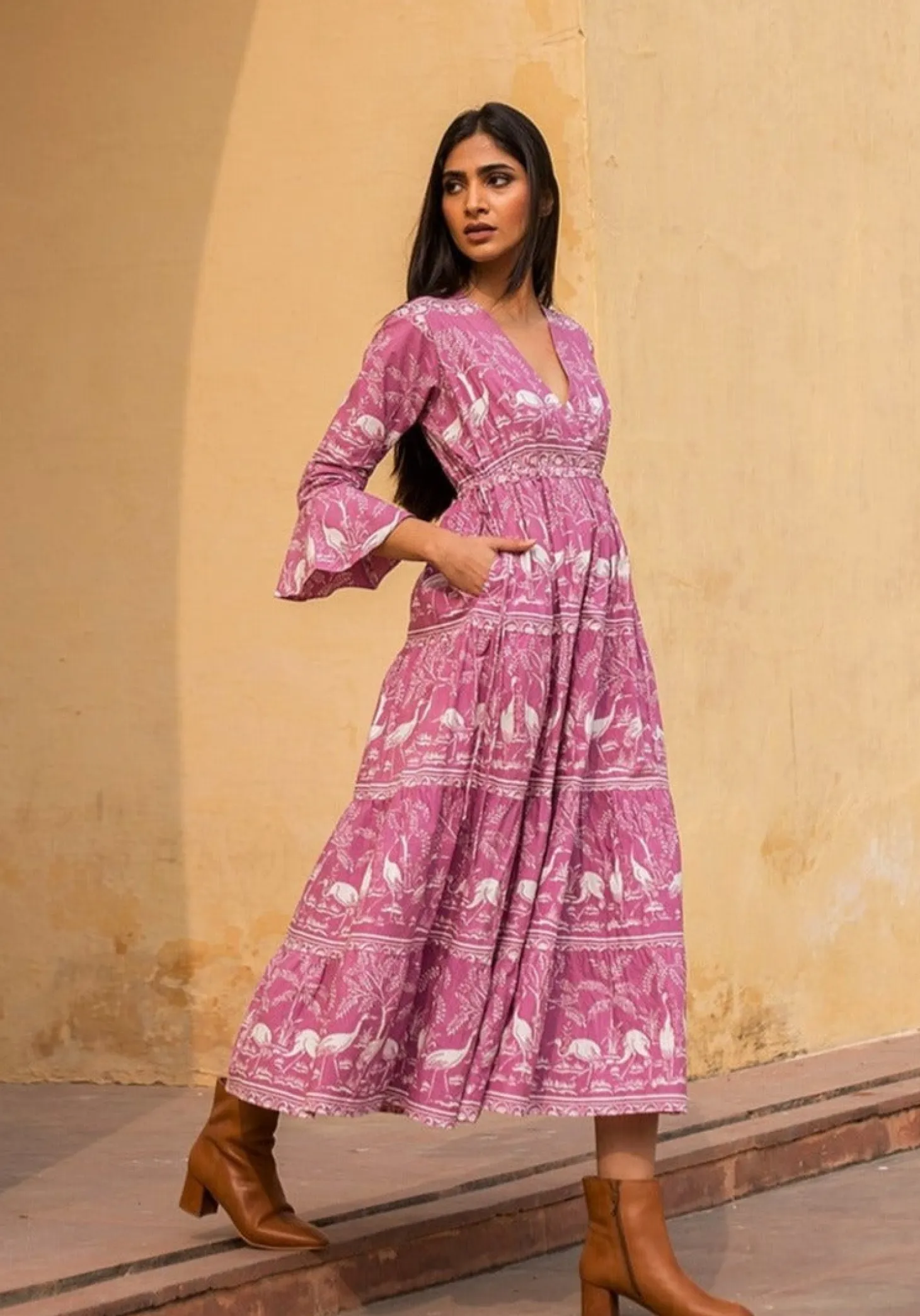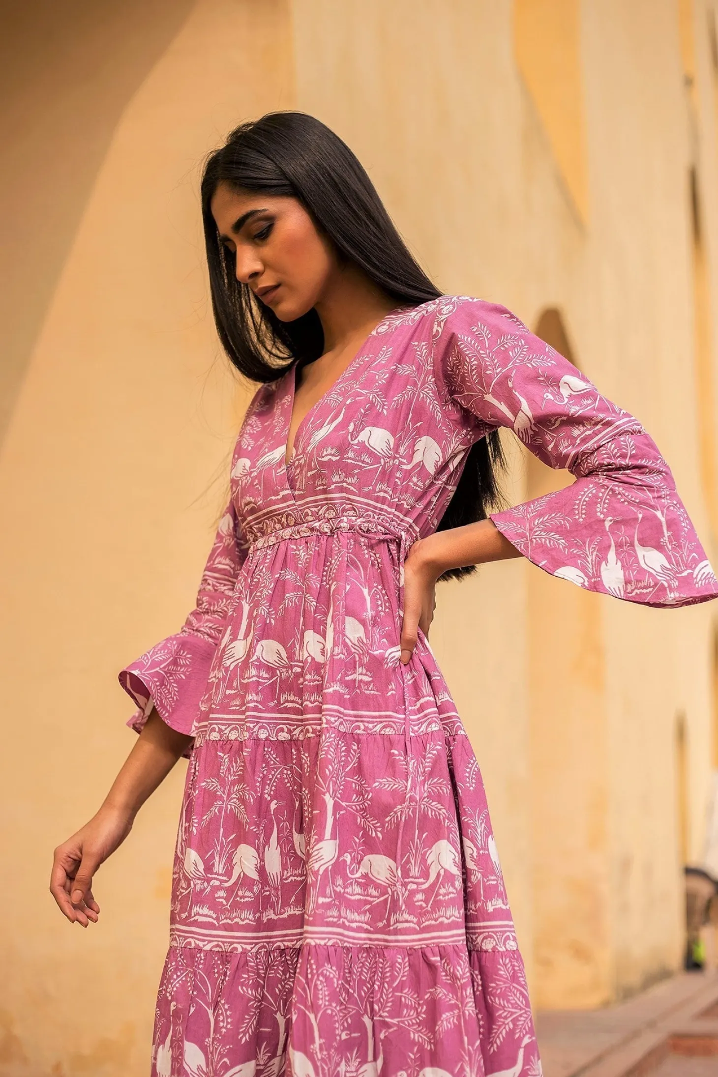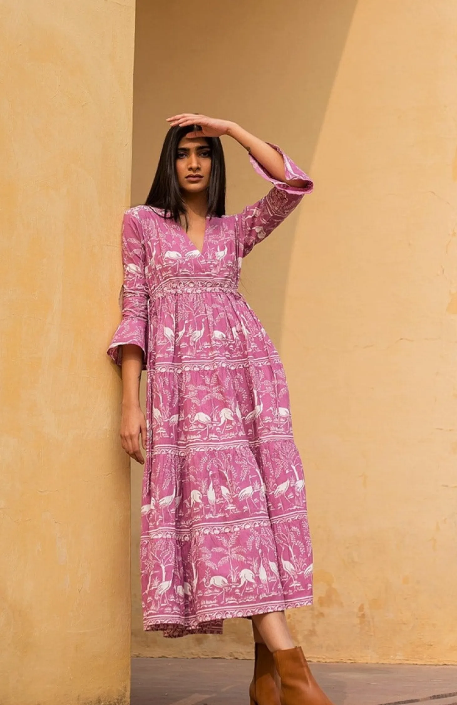 The Riley is a chic and easy-to-wear Midi with an adjustable waist and tiered A-line skirt. The dress is made from wrinkle-resistant cotton poplin with a subtle sheen that adds drape and beauty to the garment. The featured print references the harmony of nature within the concept of the Garden of Eden.