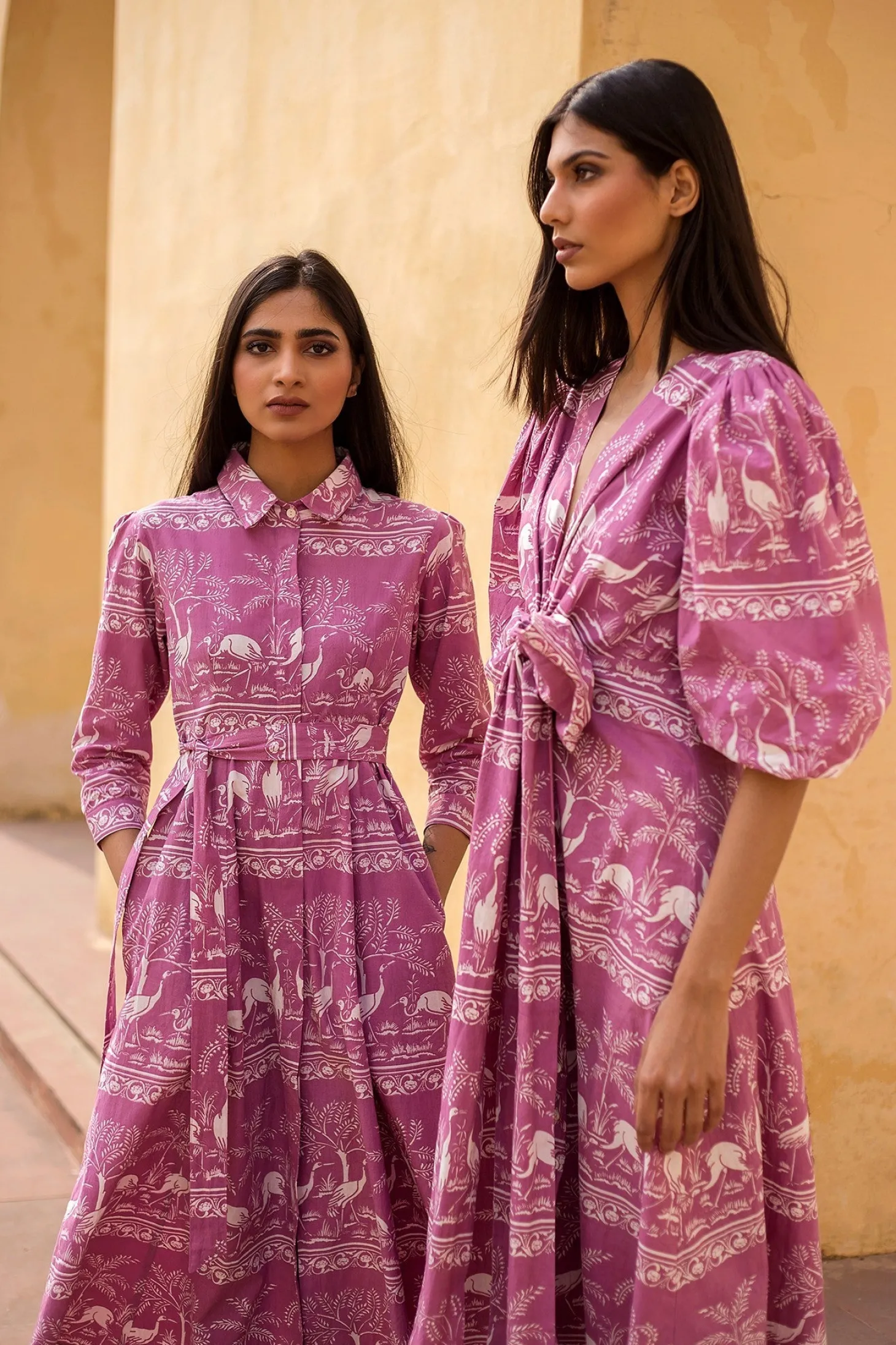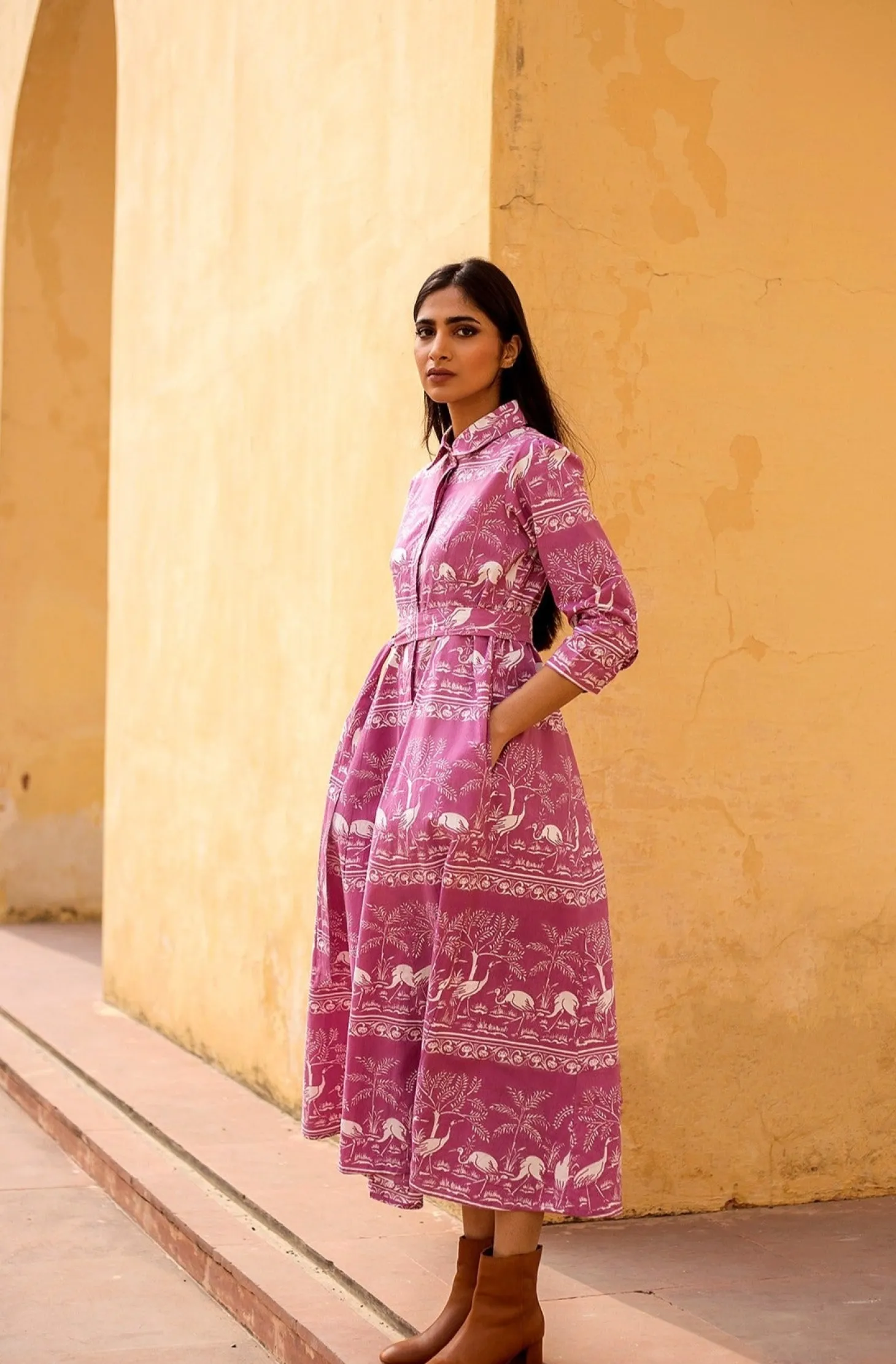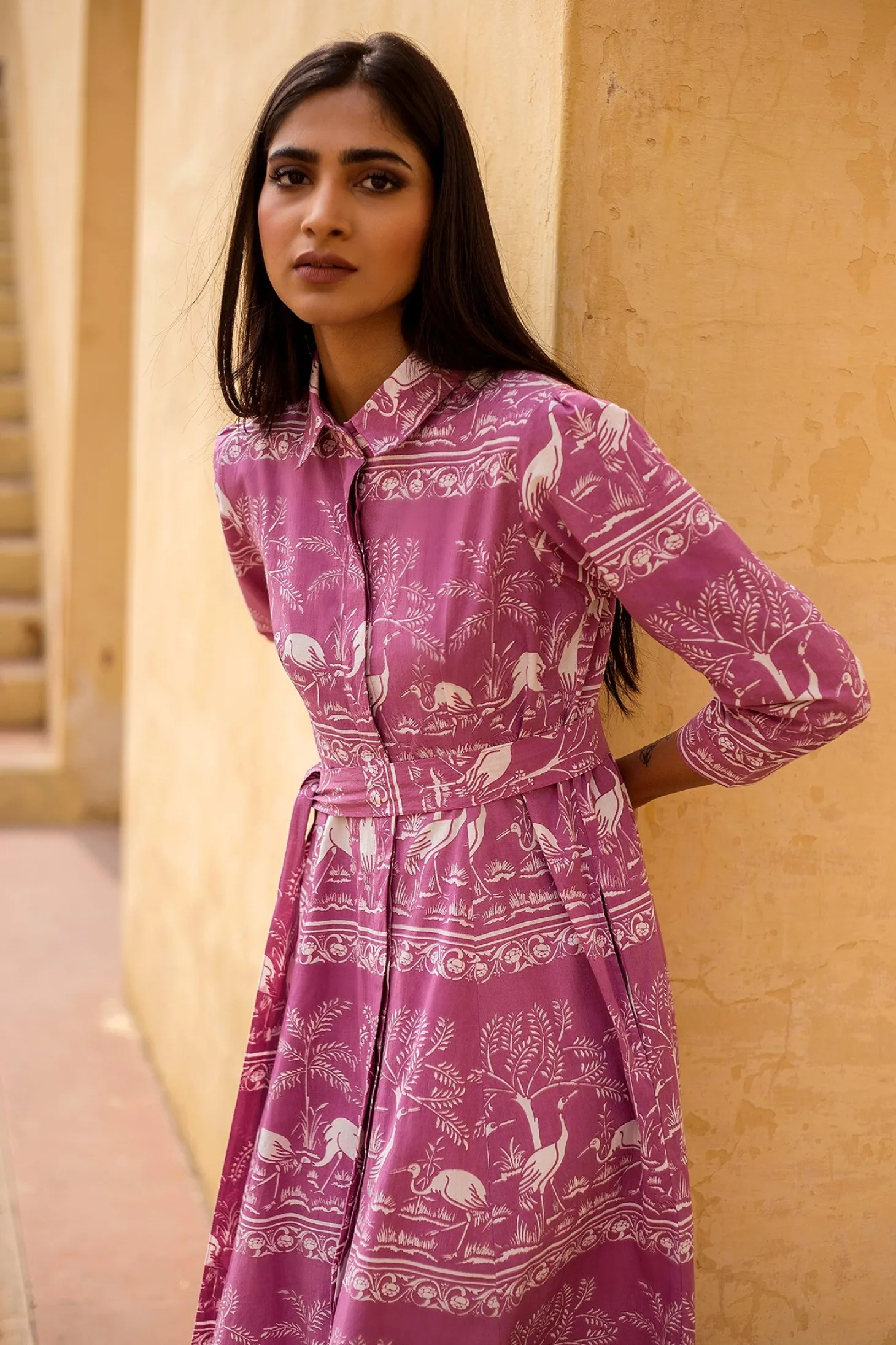 Emily is a classic shirt dress with an elegant ease and a comfortable silhouette. The buttoned-down dress is made from wrinkle-resistant cotton poplin with a subtle sheen that adds drape and beauty to the garment. The featured print references the harmony of nature within the concept of the Garden of Eden.