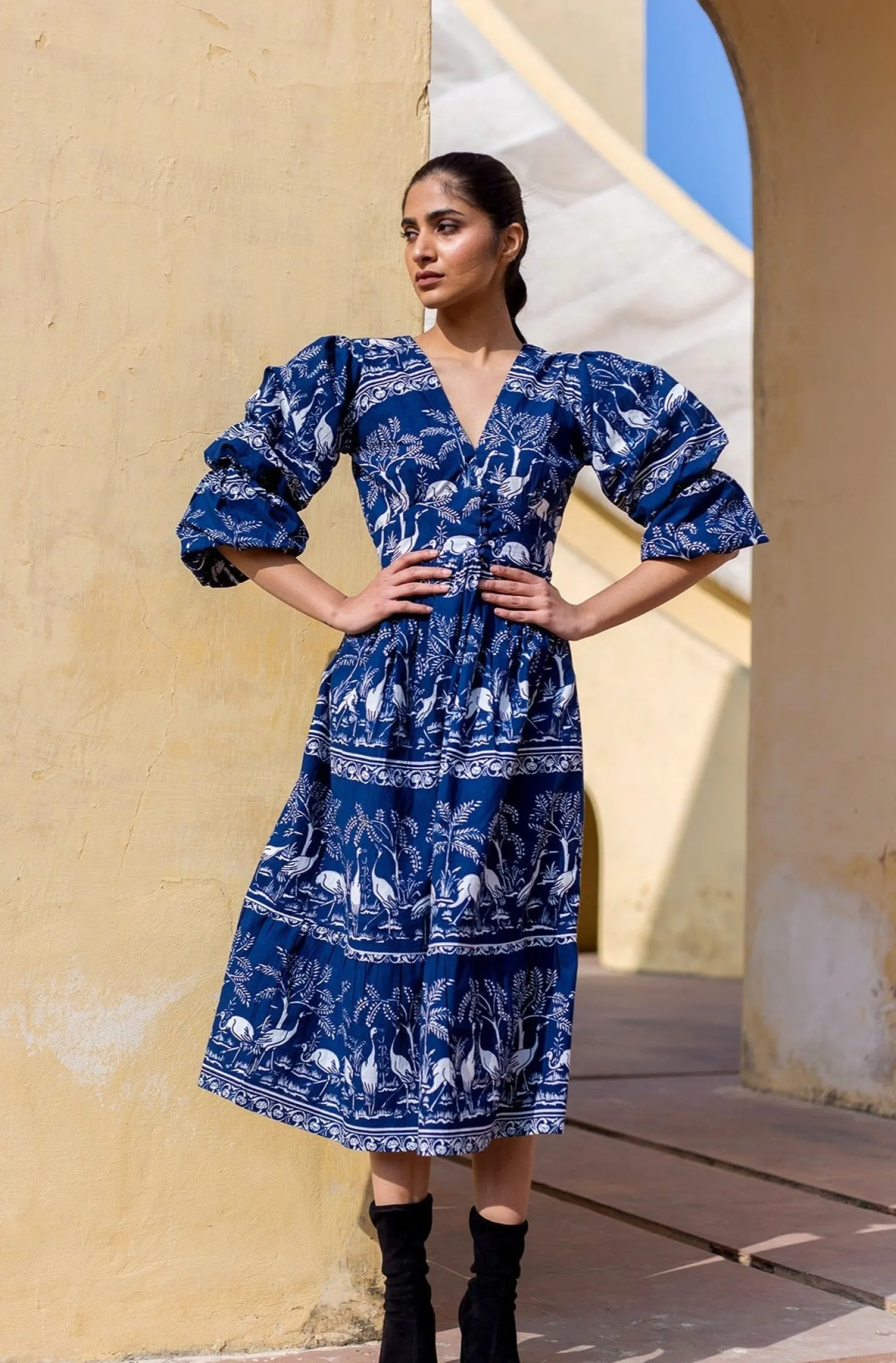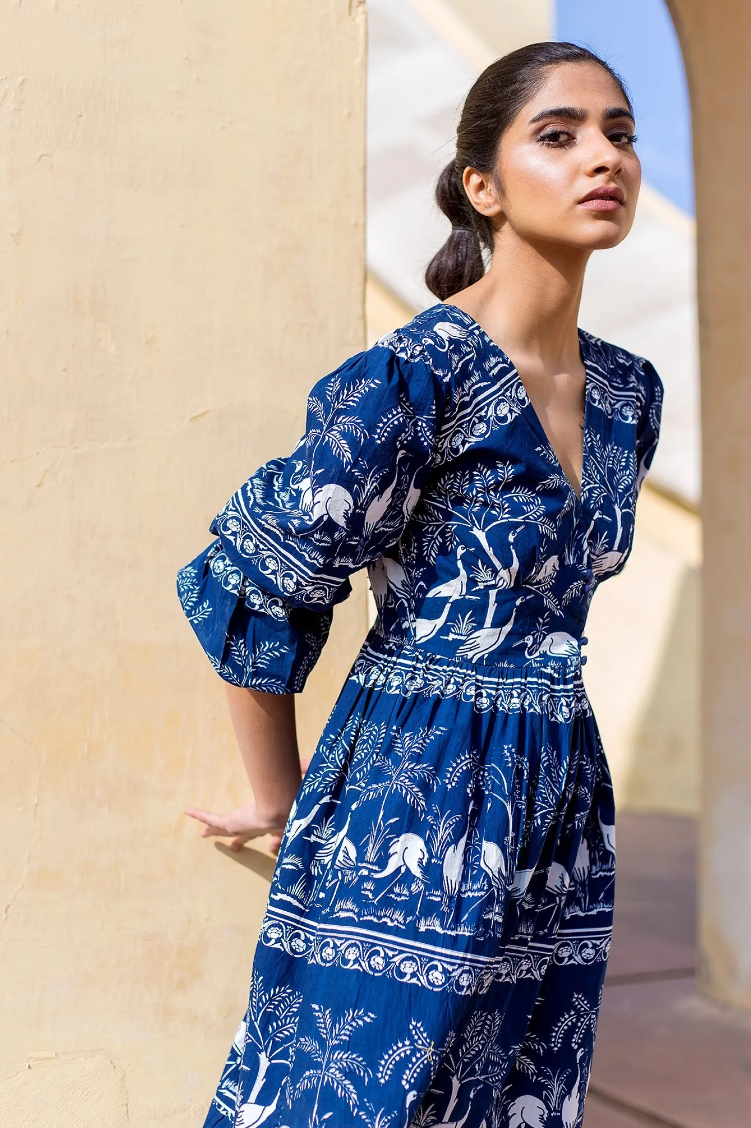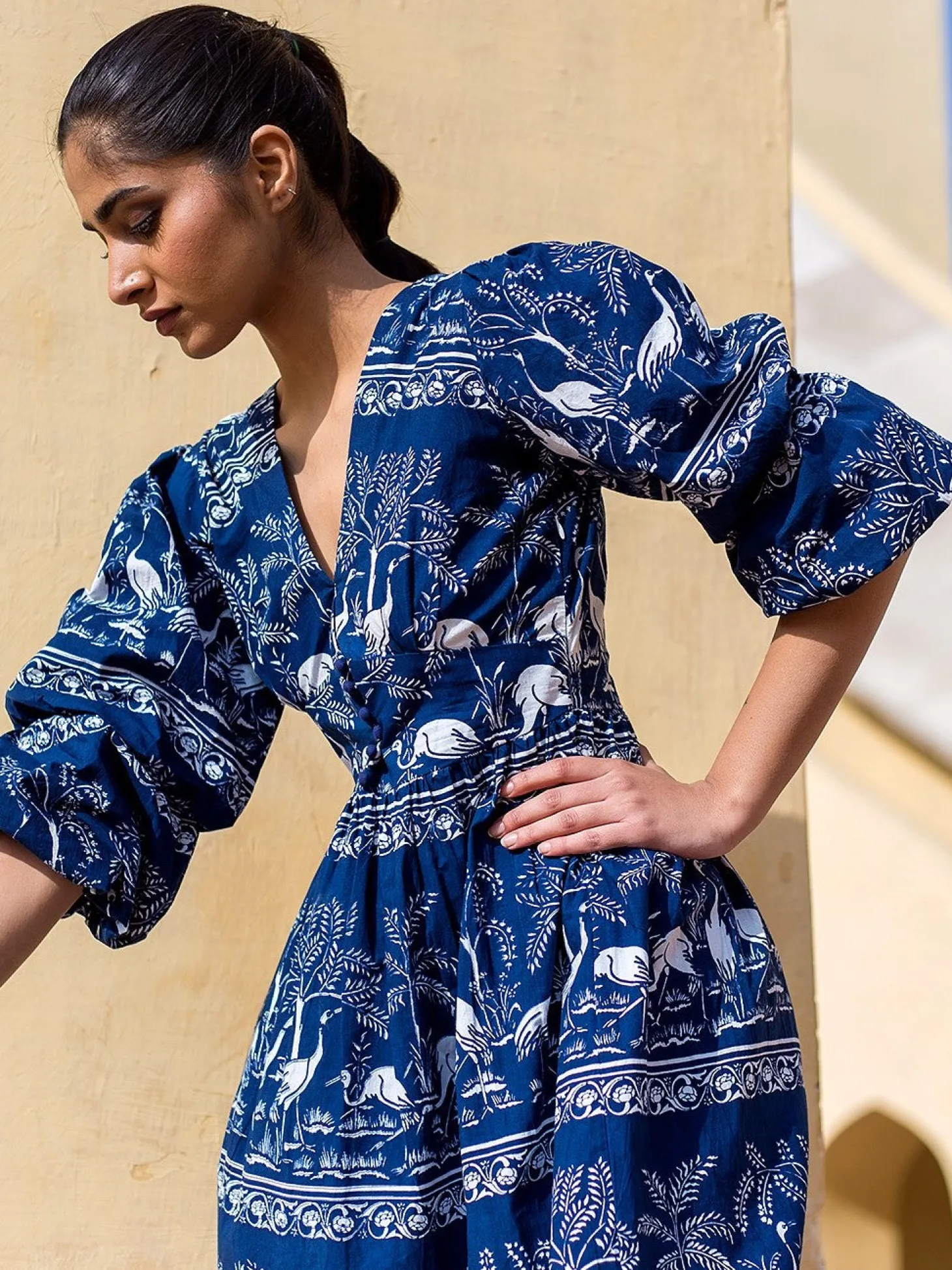 Bianca features double puff sleeves, an enticing V-neck, a fitted waist and A-line skirt creating a look of empowering femininity. Bianca is made from wrinkle-resistant cotton poplin with a subtle sheen that adds drape and beauty to the garment. The featured print references the harmony of nature within the concept of the Garden of Eden.