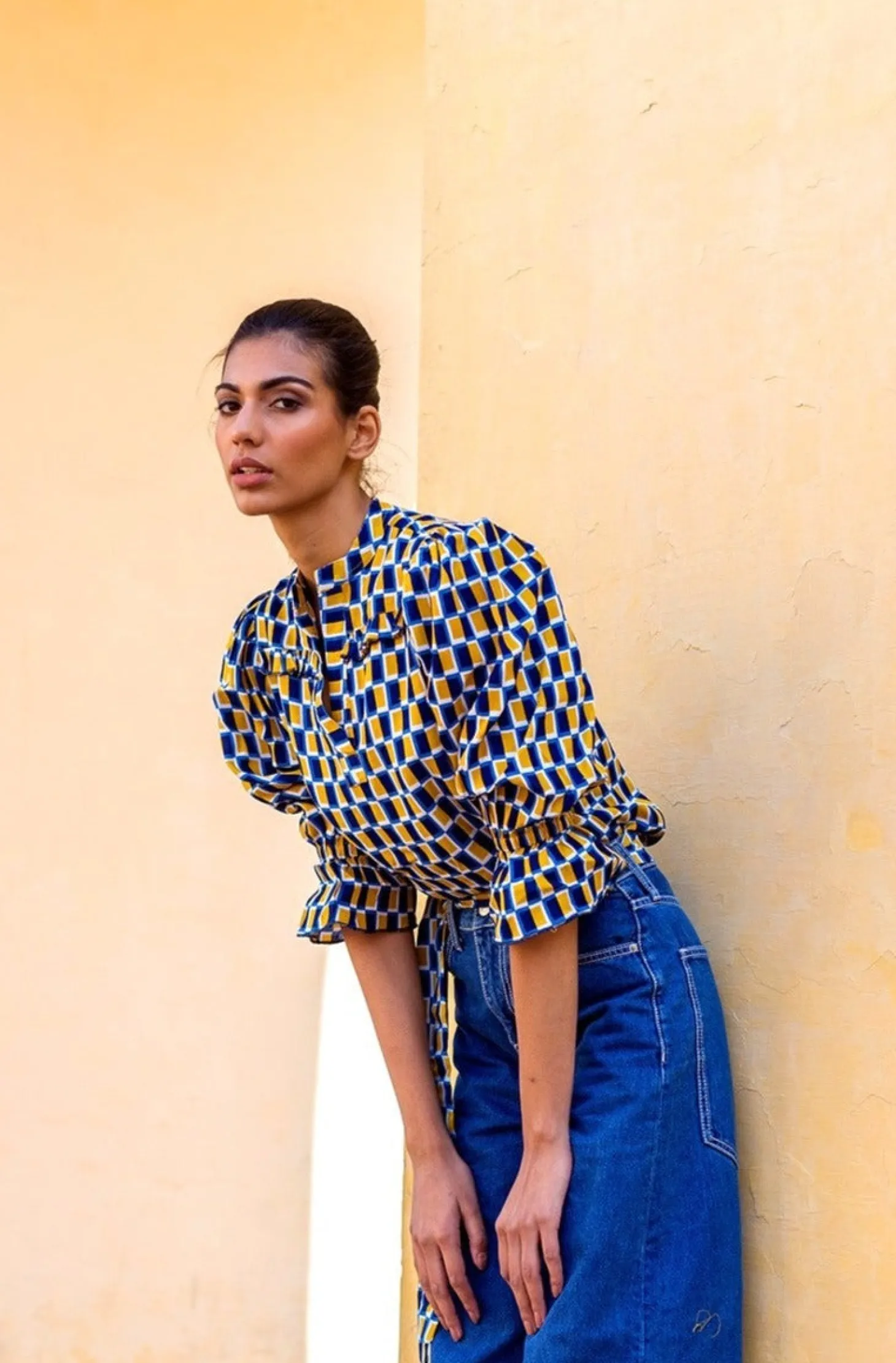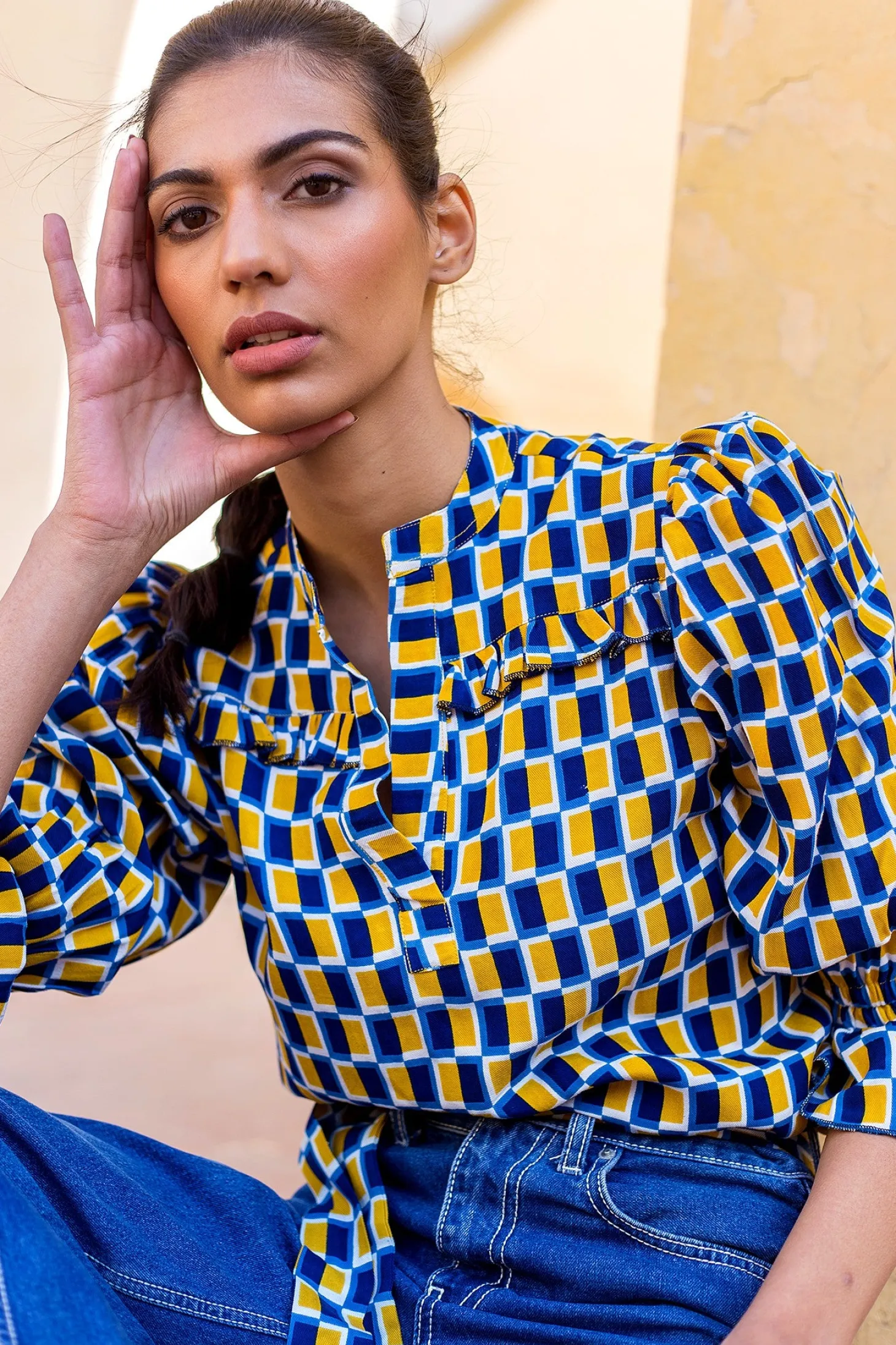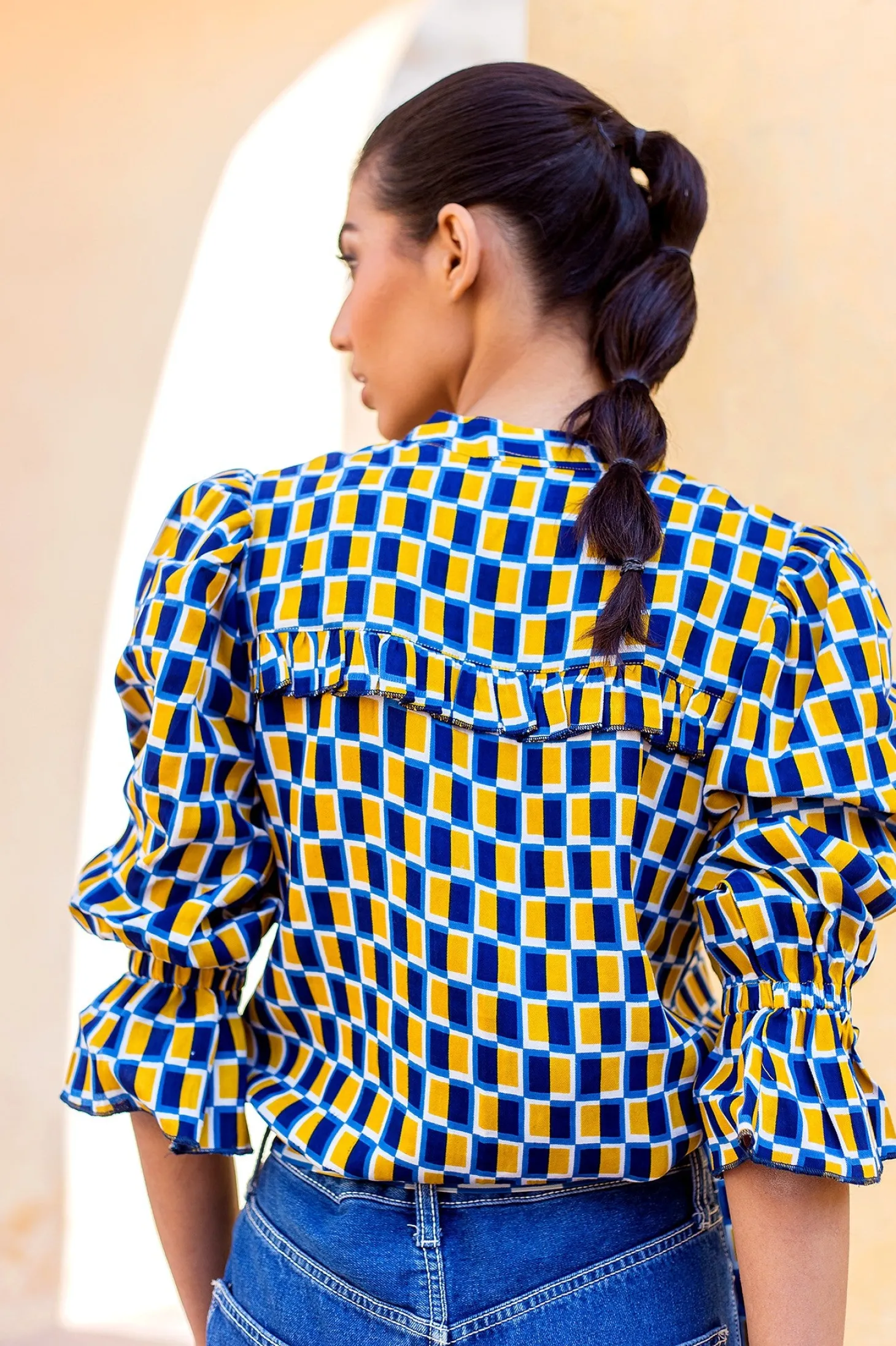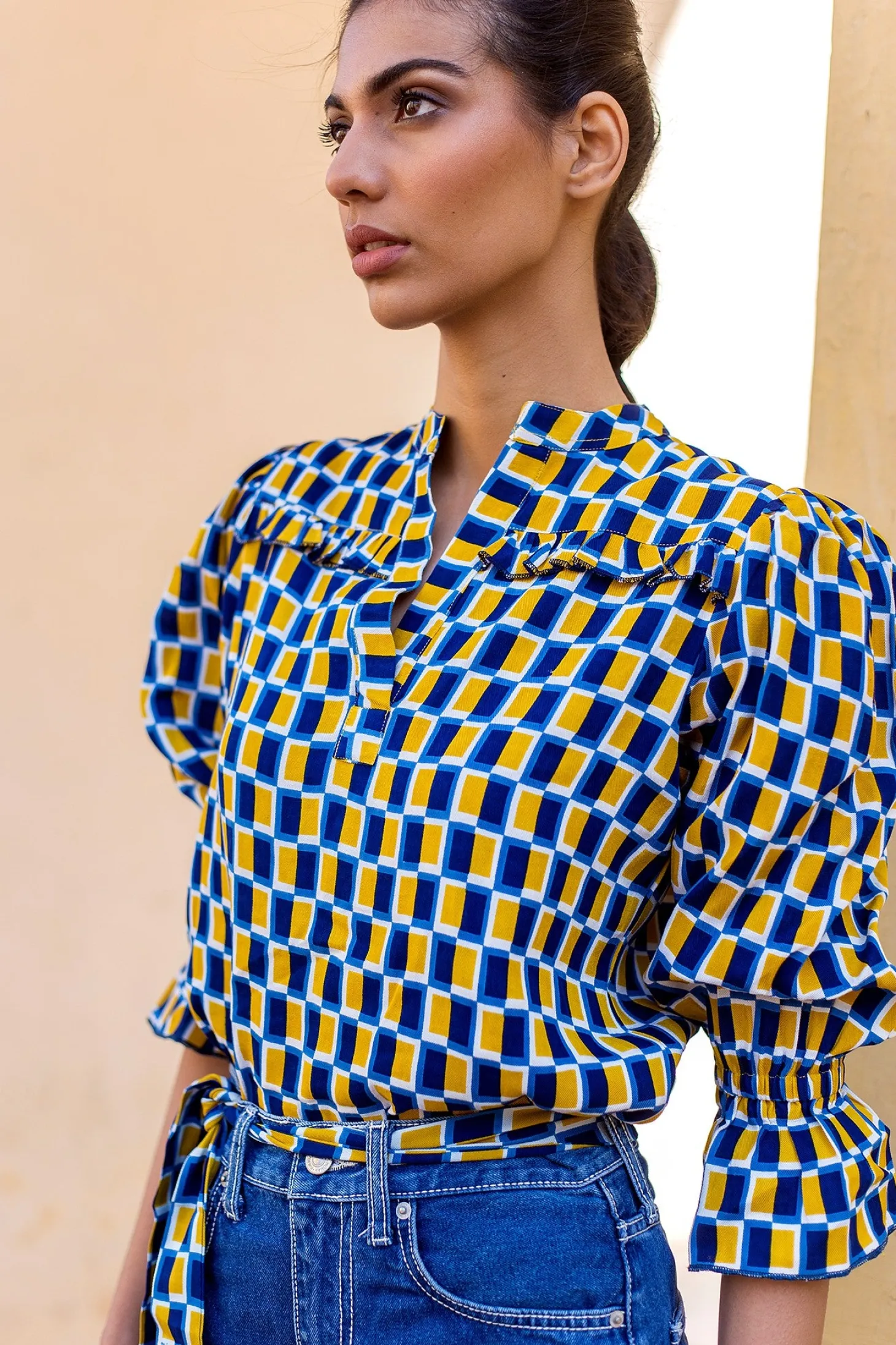 The elegant Stella blouse showcases delicate ruffle details on the front and back. Crafted from plant-based Modal that drapes like silk and has an incredible soft touch, the Stella blouse will instantly upgrade your outfit. Stella features a geometric print that is inspired by the Mughal garden’s water pools that are laid out in perfect symmetry.