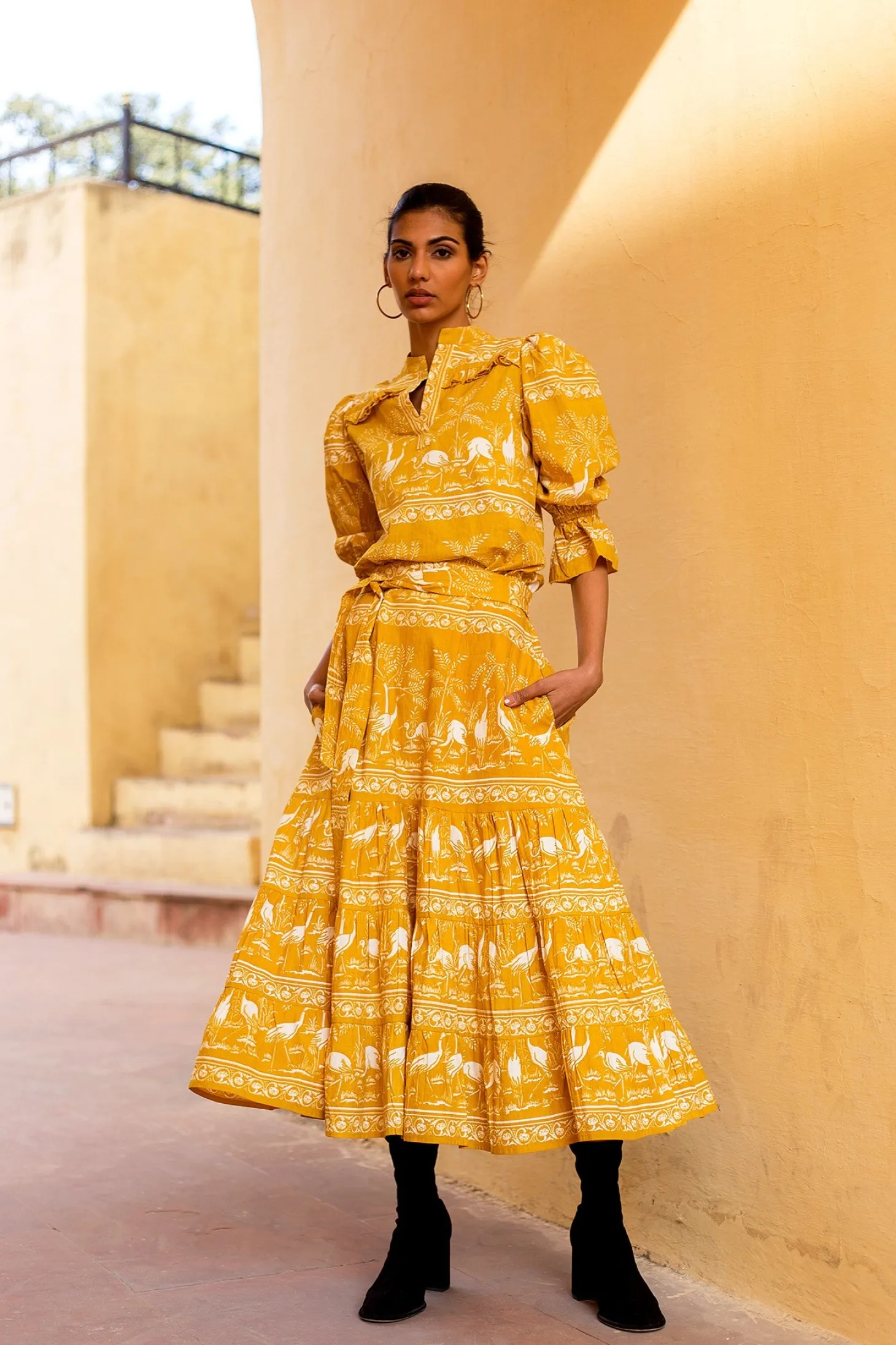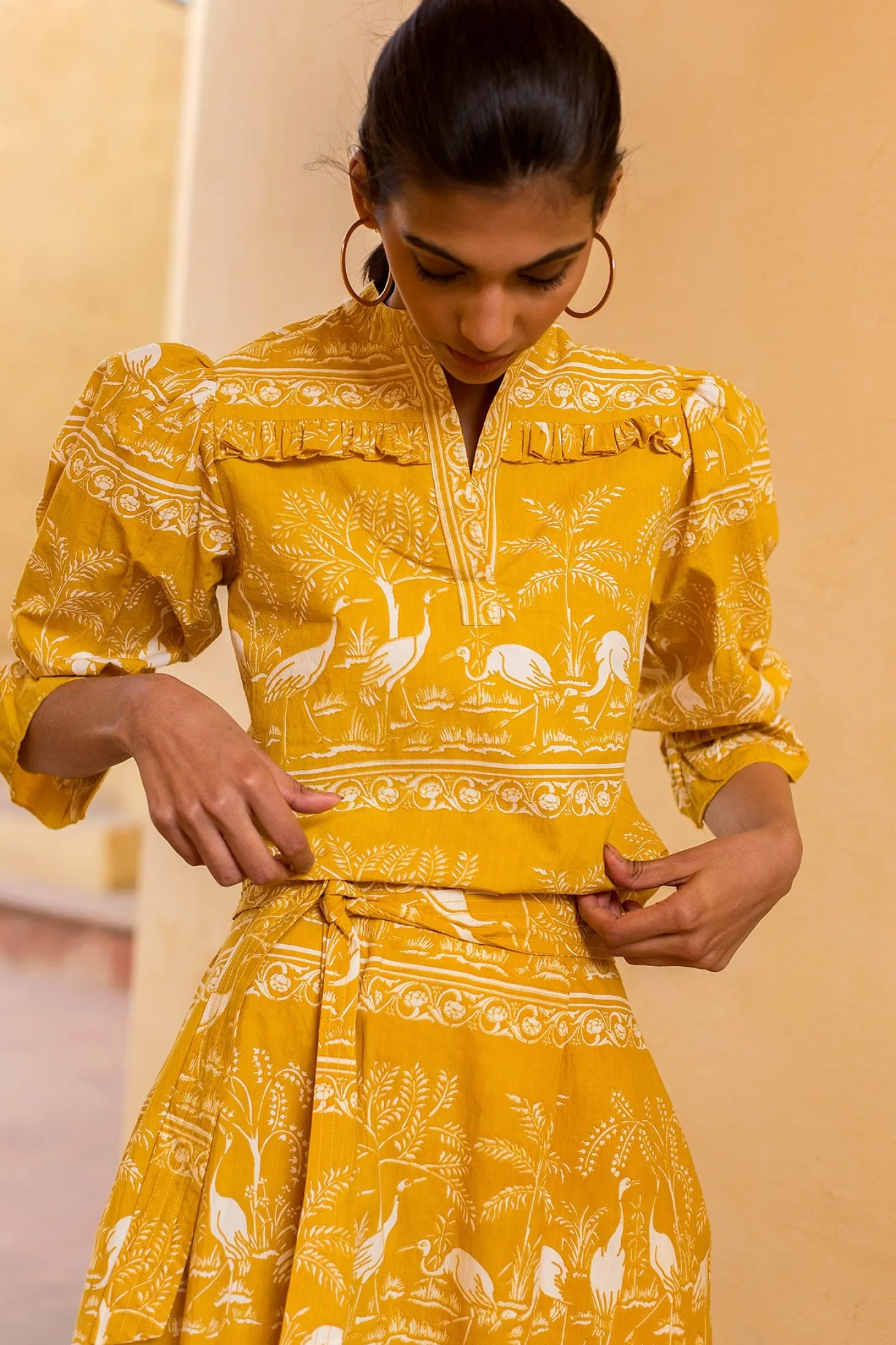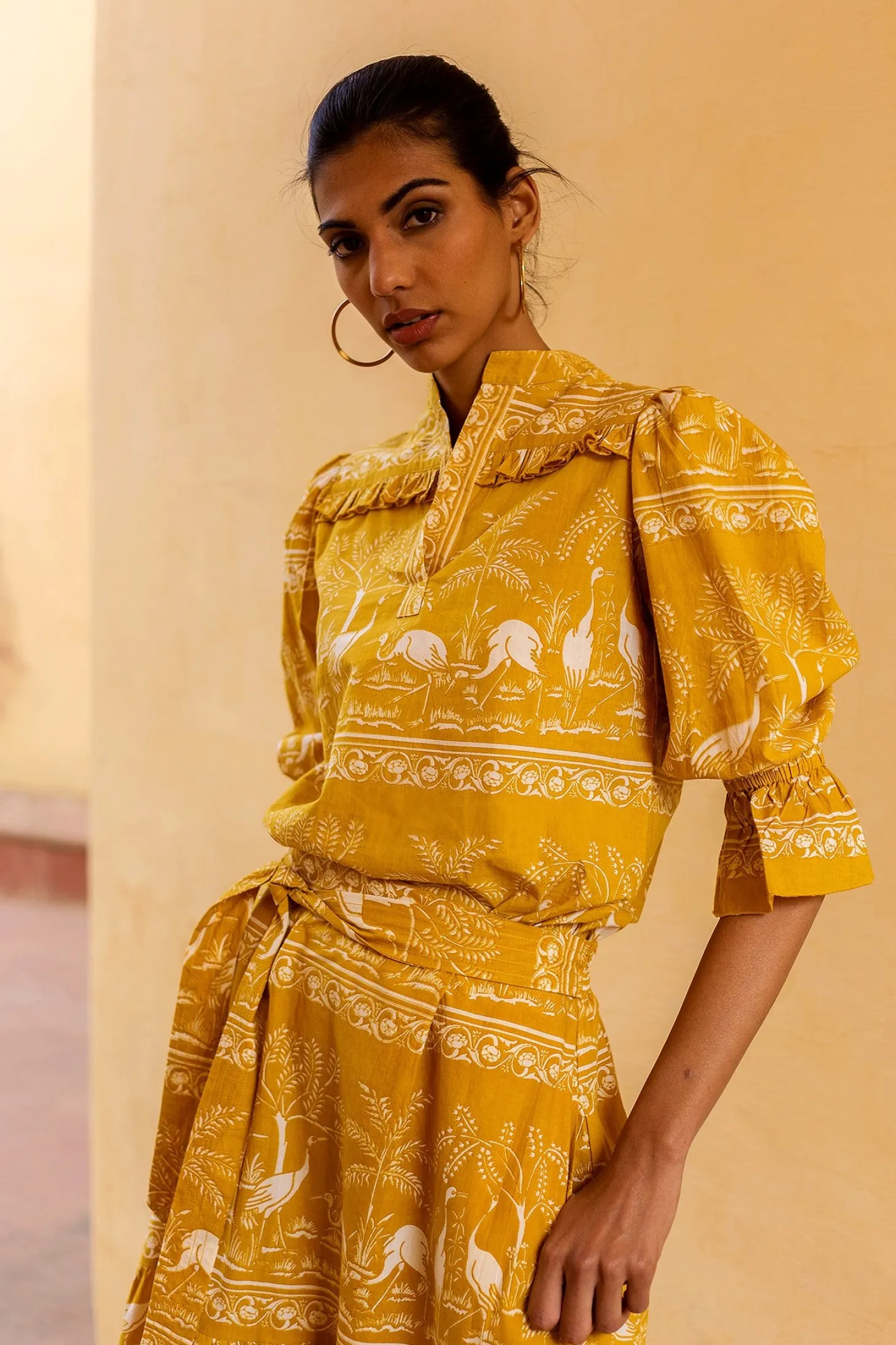 With its delicate ruffle details and intriguing print, the Stella blouse will instantly upgrade your outfit. Stella is made from wrinkle-resistant cotton poplin with a subtle sheen that adds drape and beauty to the garment. The featured print references the harmony of nature within the concept of the Garden of Eden.