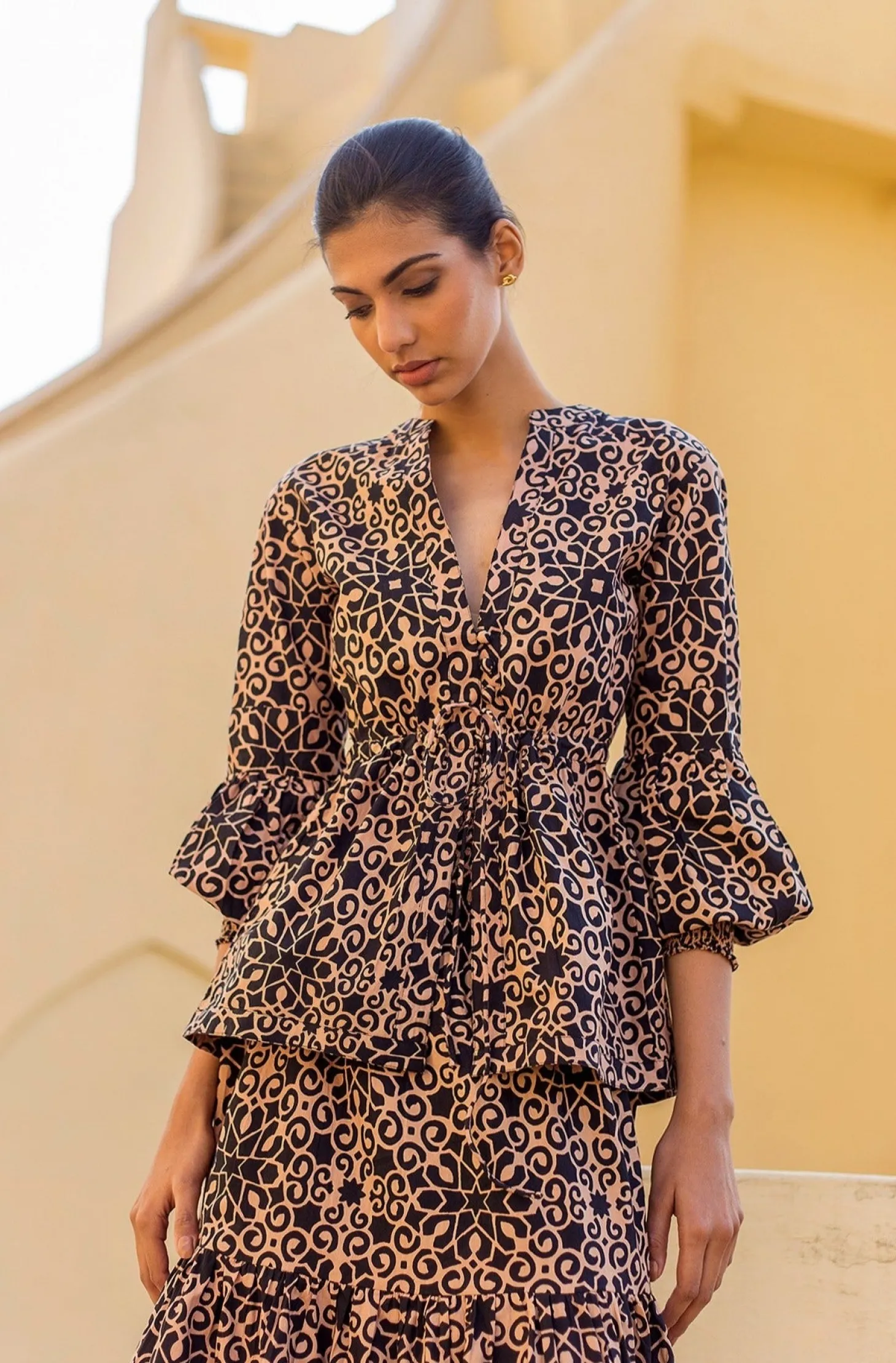 The Elena top is the definition of chic and bold elegance – a blouse that elevates your entire outfit. The blouse is made from wrinkle-resis- tant cotton poplin with a subtle sheen that adds drape and beauty to the garment. The featured print is inspired by ornamental stone works (“Pietra Dura”) decorating Delhi’s Mughal Garden.