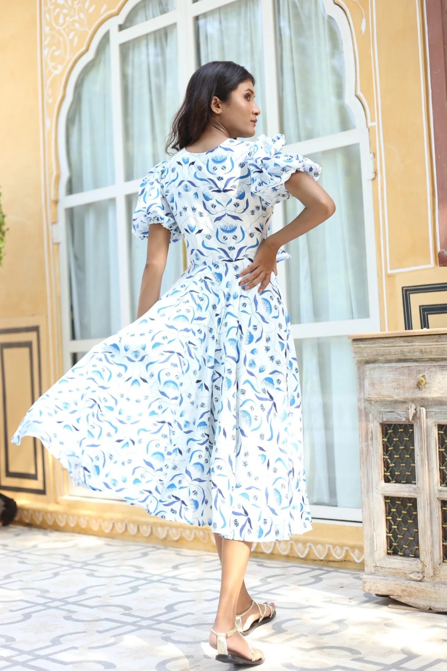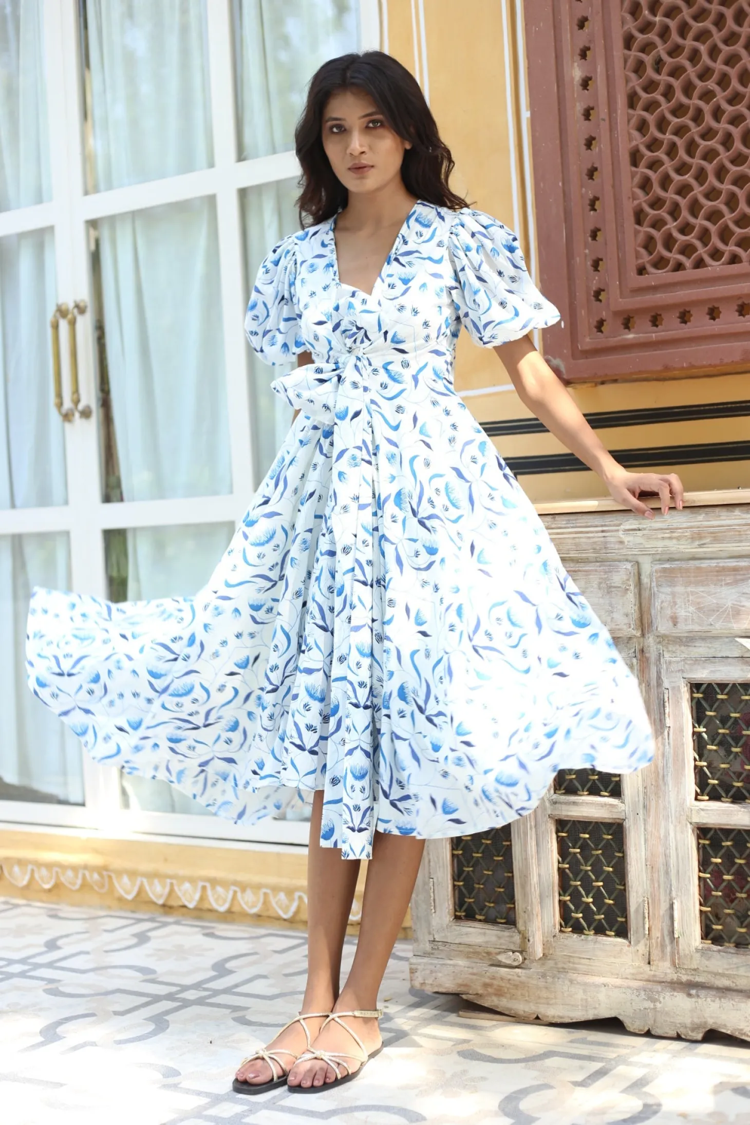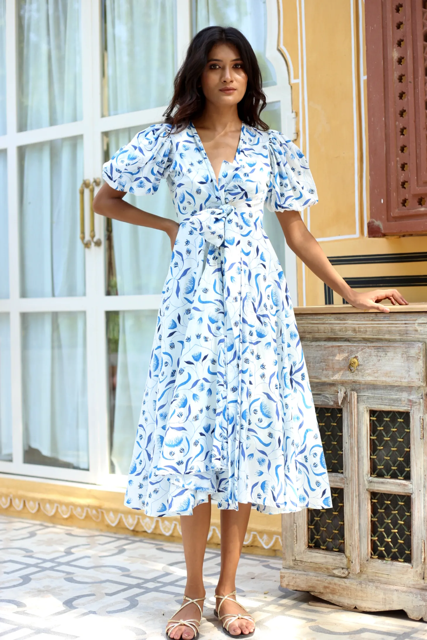 The easy-to-wear Lola wrap dress fits every body shape beautifully. The dress can be wrapped with an oversized bow in the front or with a simple knot in the back. Lola showcases a floral print pattern which inspired by the lush Mangroves growing along Goa’s Mandovi river. The artwork is hand-screen-printed.