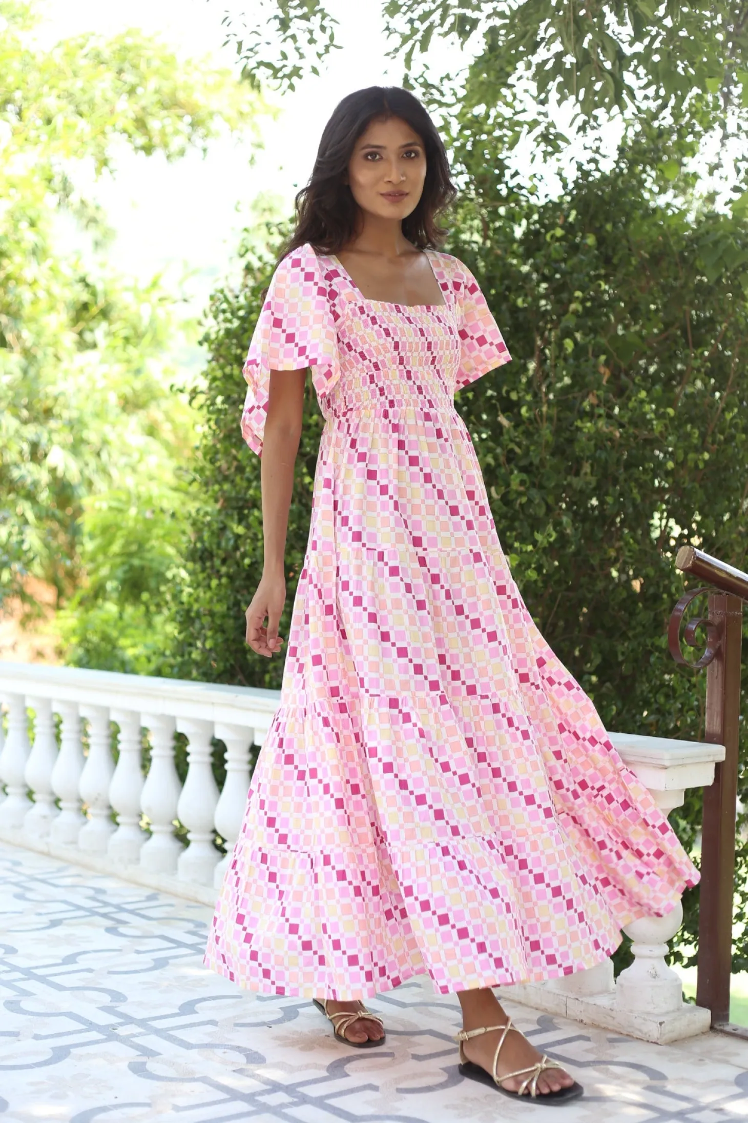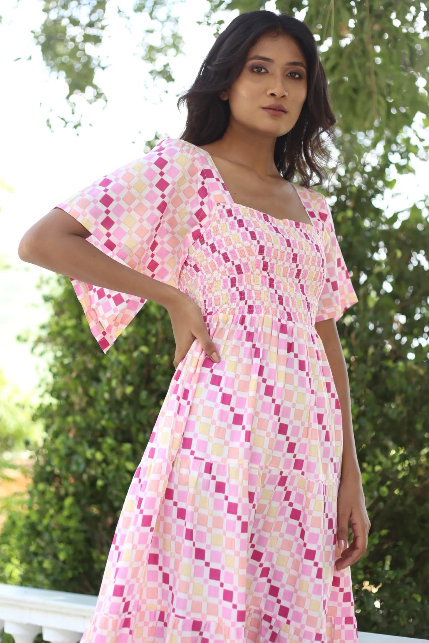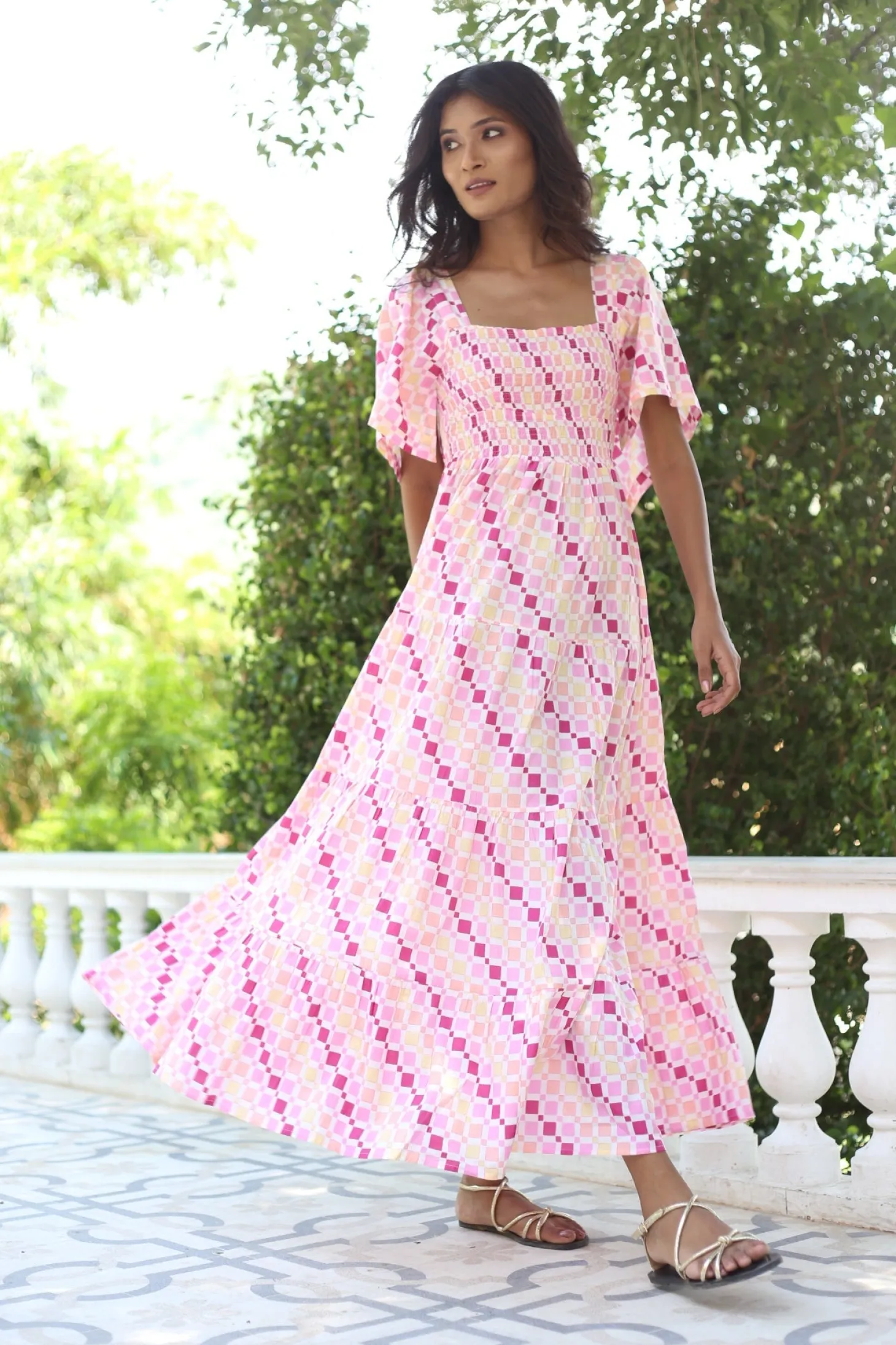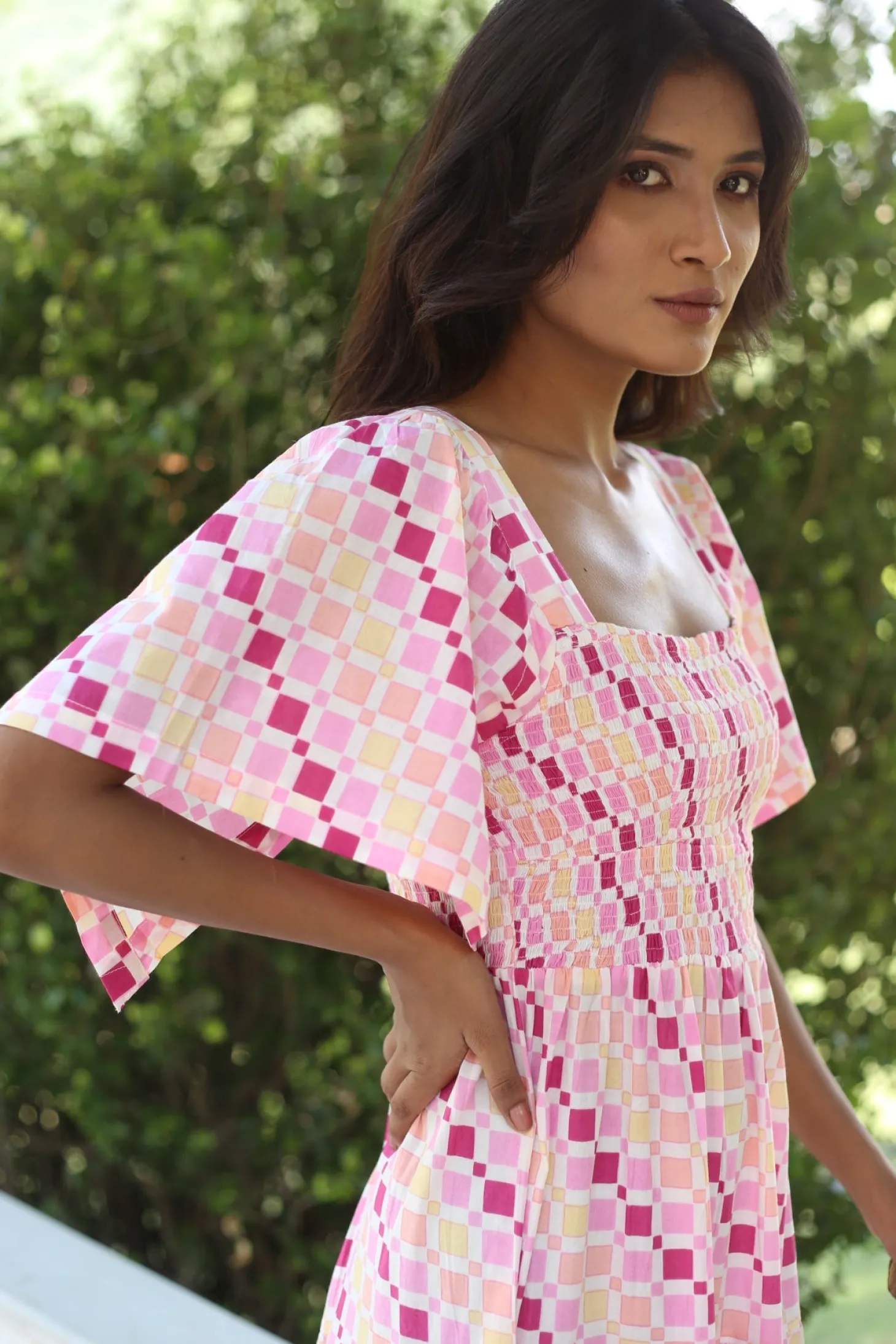 The Rosie dress is crafted from 100% cotton. The geometric print pattern is a modern interpretation of the colorful houses of Fontainhas, Goa’s Portuguese-influenced Latin Quarter. The artwork is hand-screen-printed.