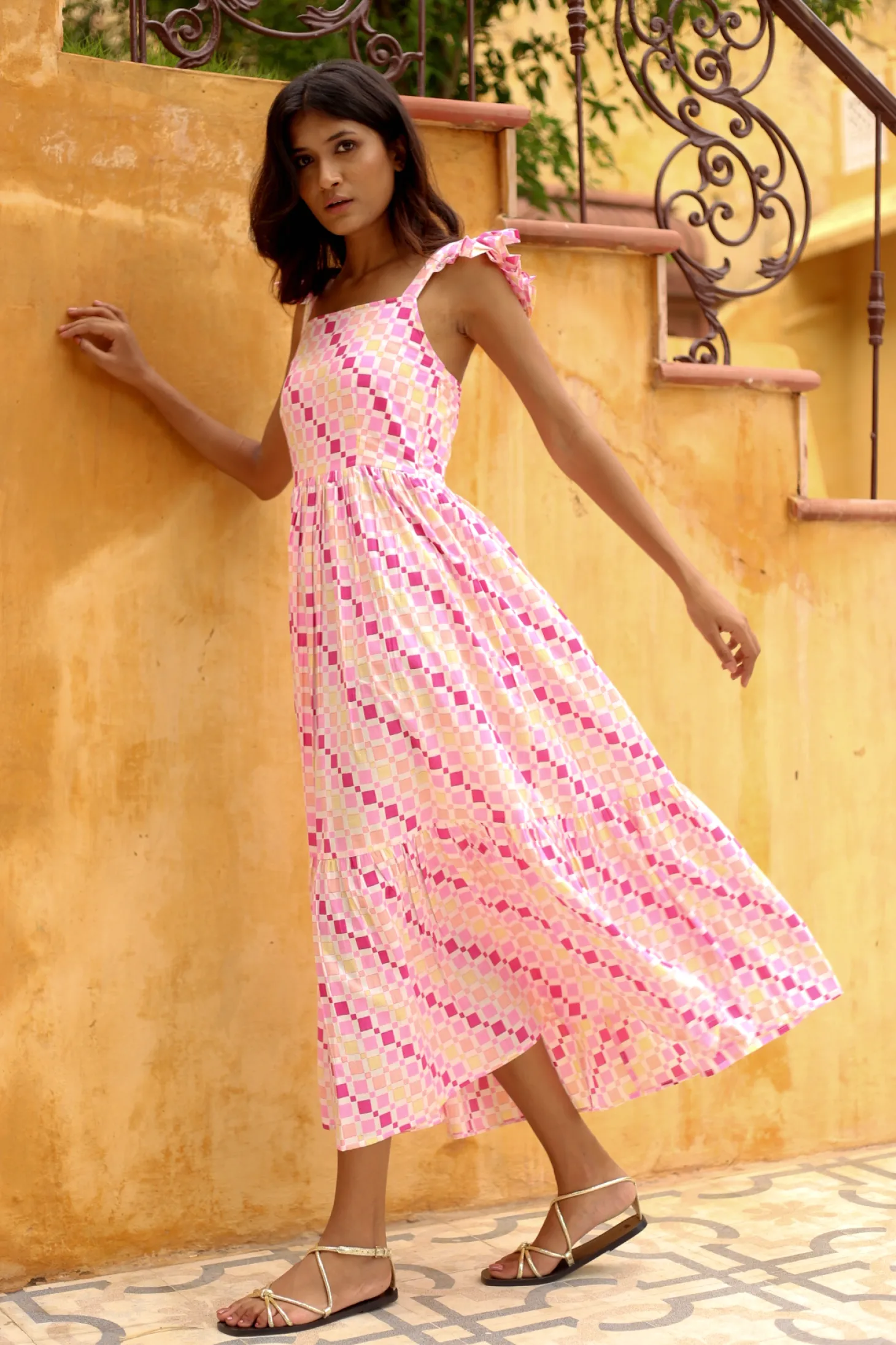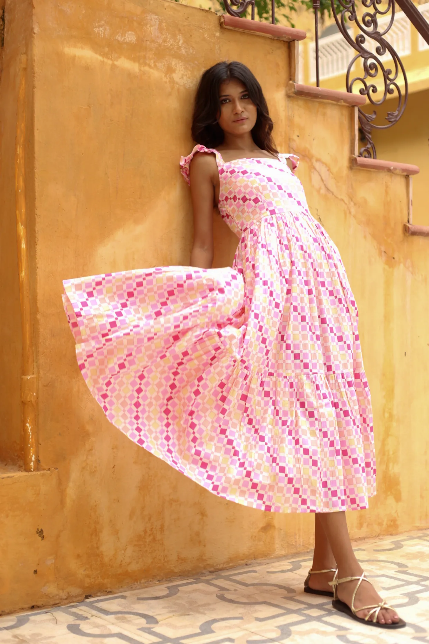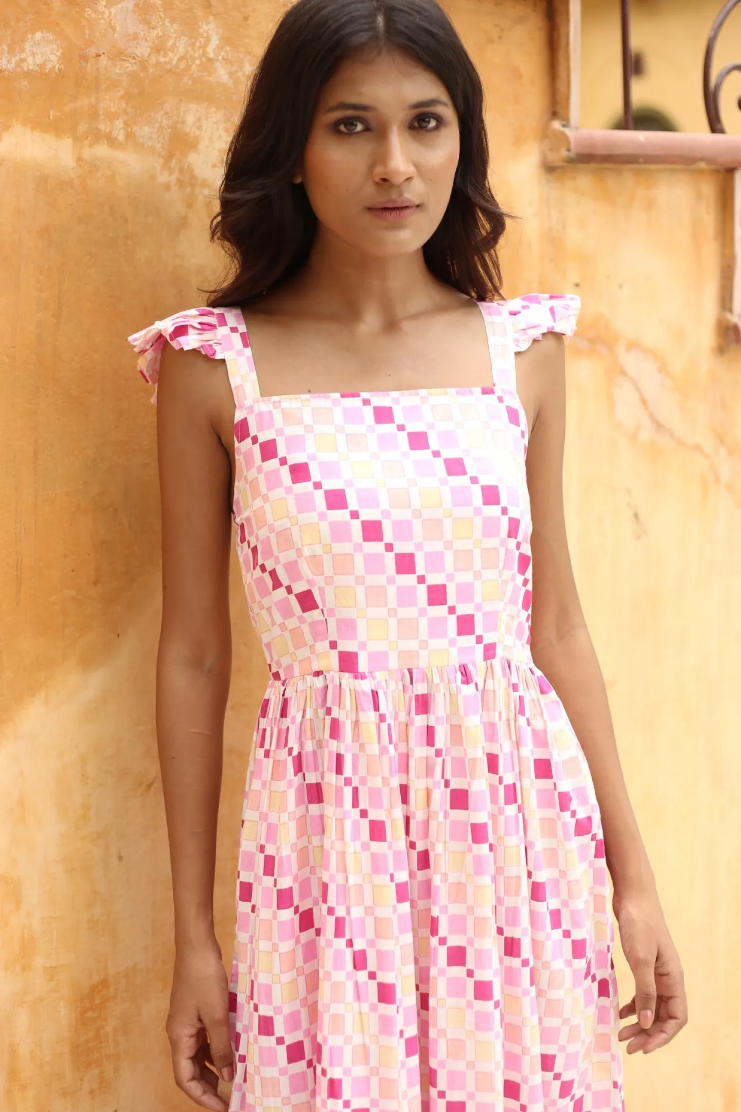 cotton. The geometric print patternis a modern interpretation of the colorful houses of Fontainhas, Goa’s Portuguese-influenced Latin Quarter. The artwork is hand-screen-printed.