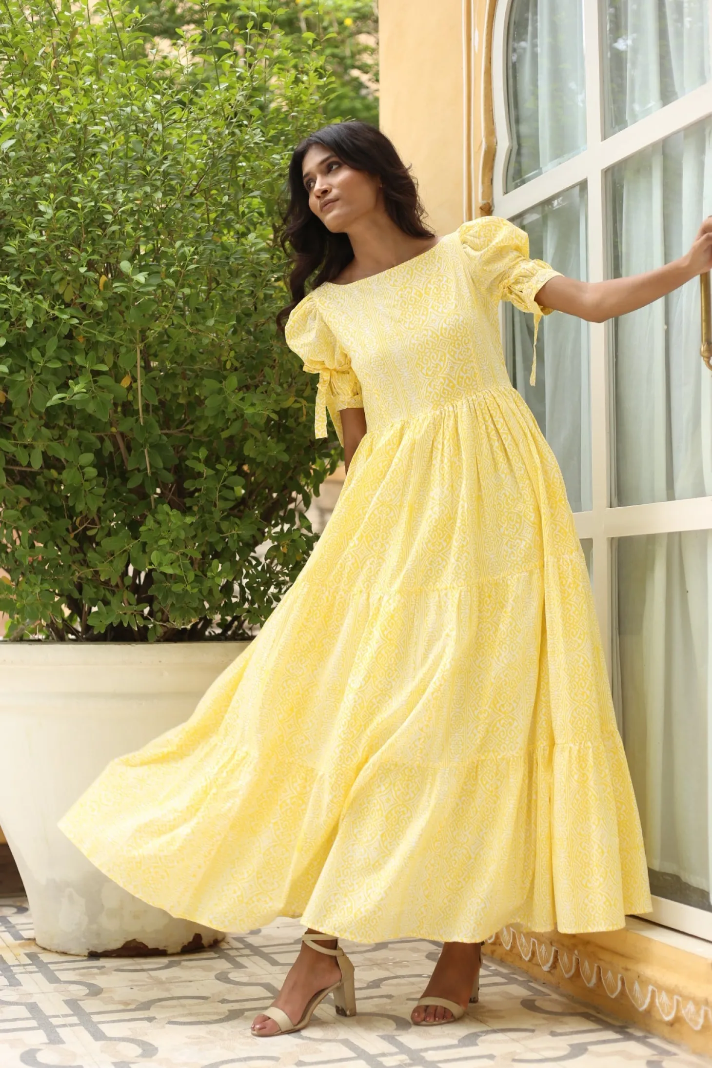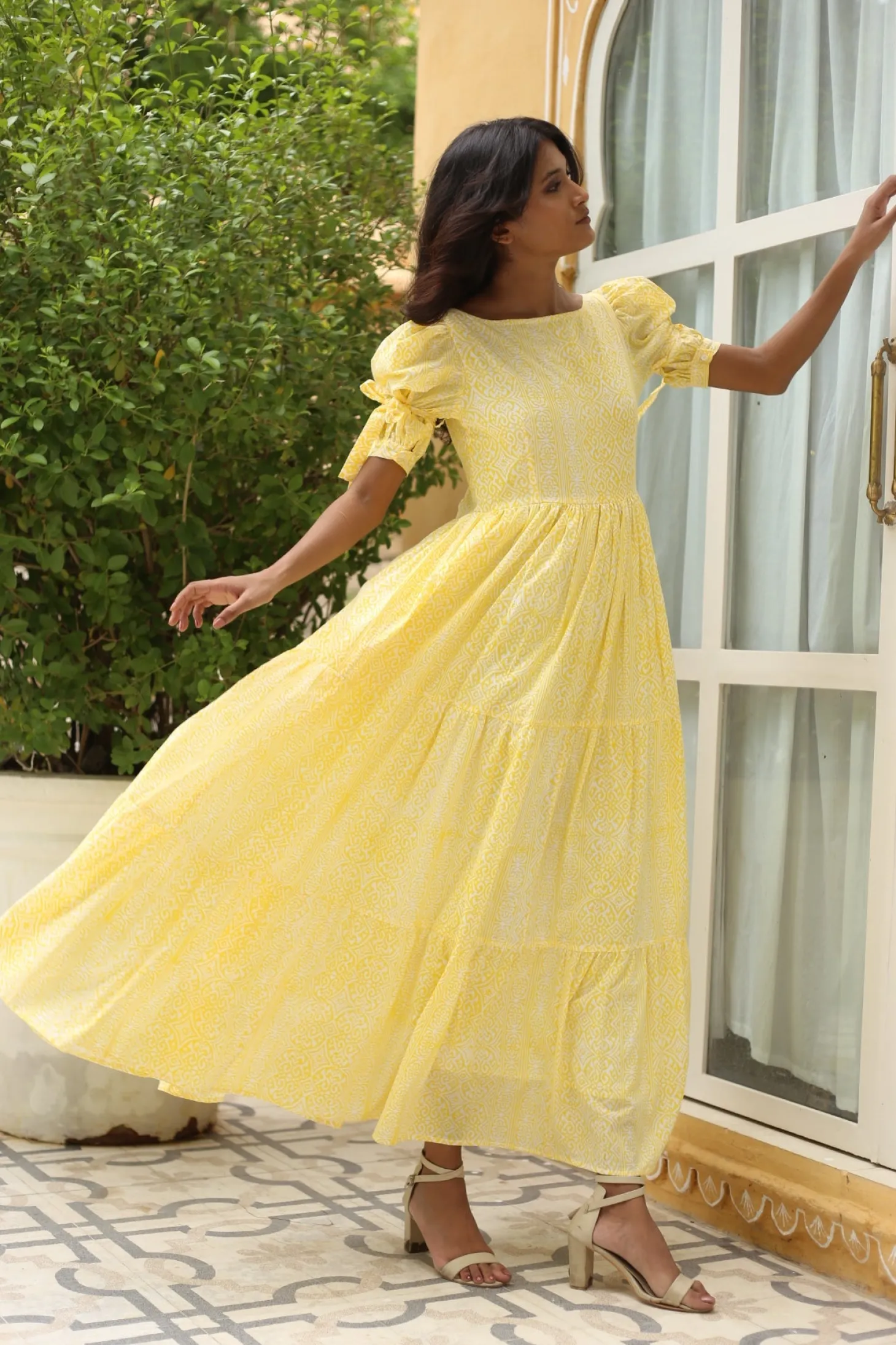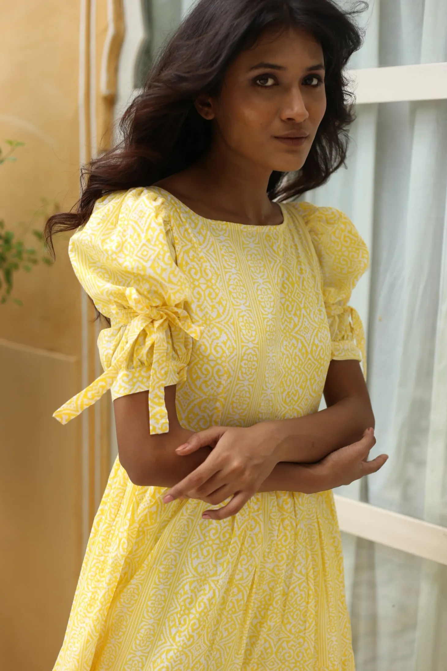 The Gigi is a dress to impress with its alluring oval cut out and bow at the back, its wide A-line and puff sleeves. Gigi is crafted from 100% cotton. The dress showcases a geometric print pattern which is inspired by the bright yellow Goan-Portuguese mansion known as “Mateus”. The artwork is handprinted according to the ancient art of block printing.