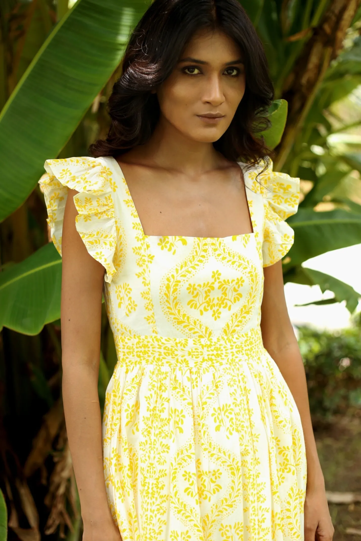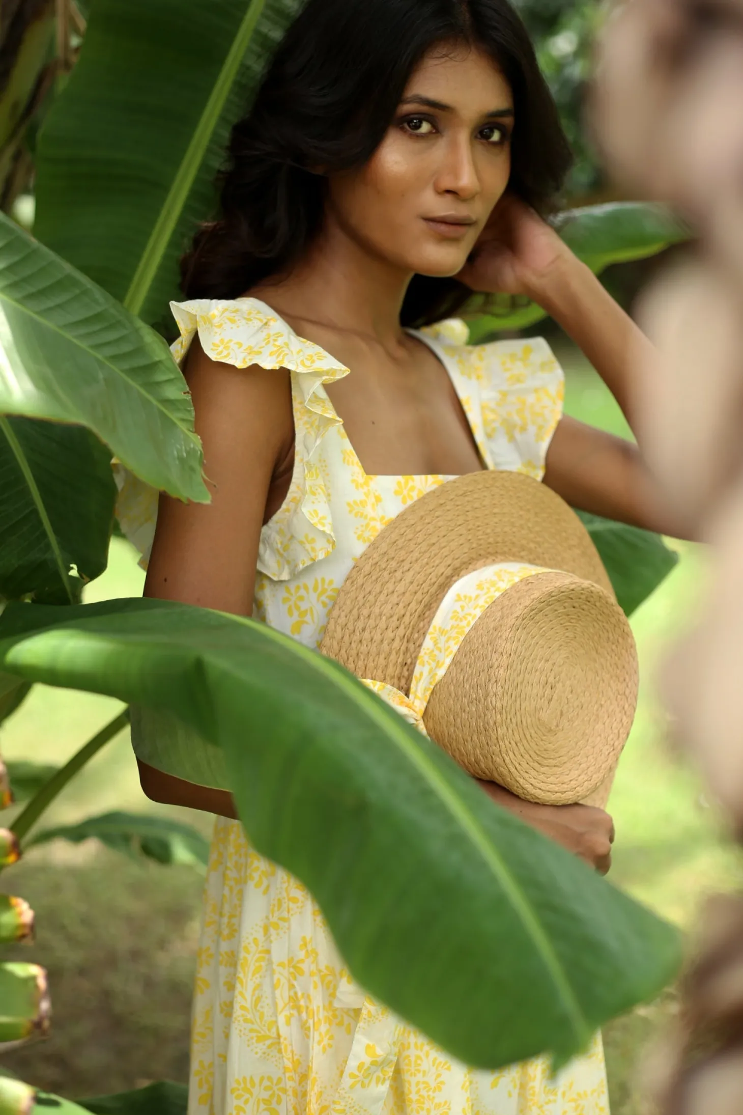 The flirty Sofia dress has a feminine silhouette with delicate ruffles on the shoulders and an enticing back. The dress, crafted from 100% cotton, showcases adelicate print pattern inspired by Goa’s state flower – the Frangipani. The flower has a wonderful tropical essence and is highly scented during nights. The artwork is hand-screen-printed.