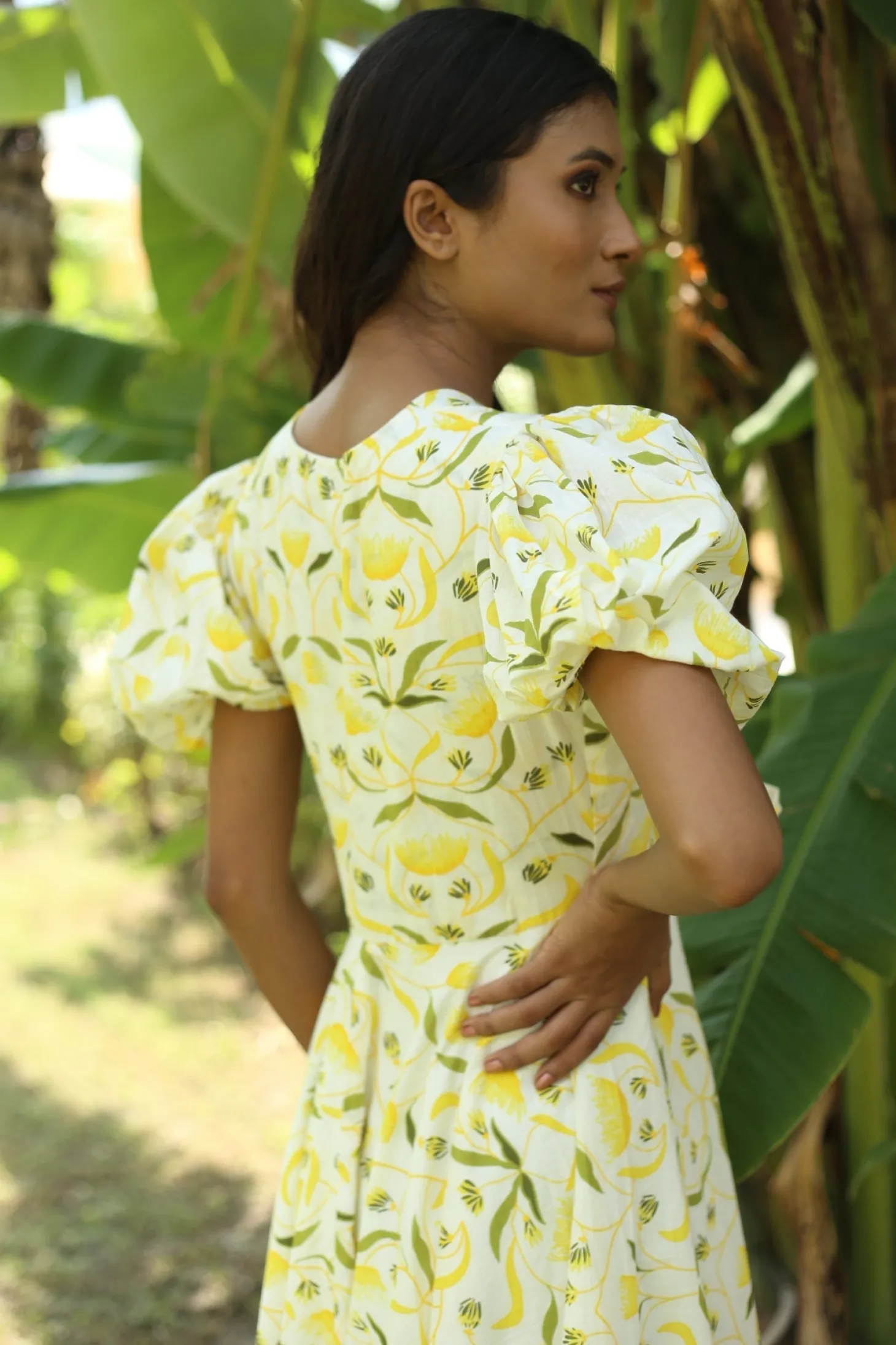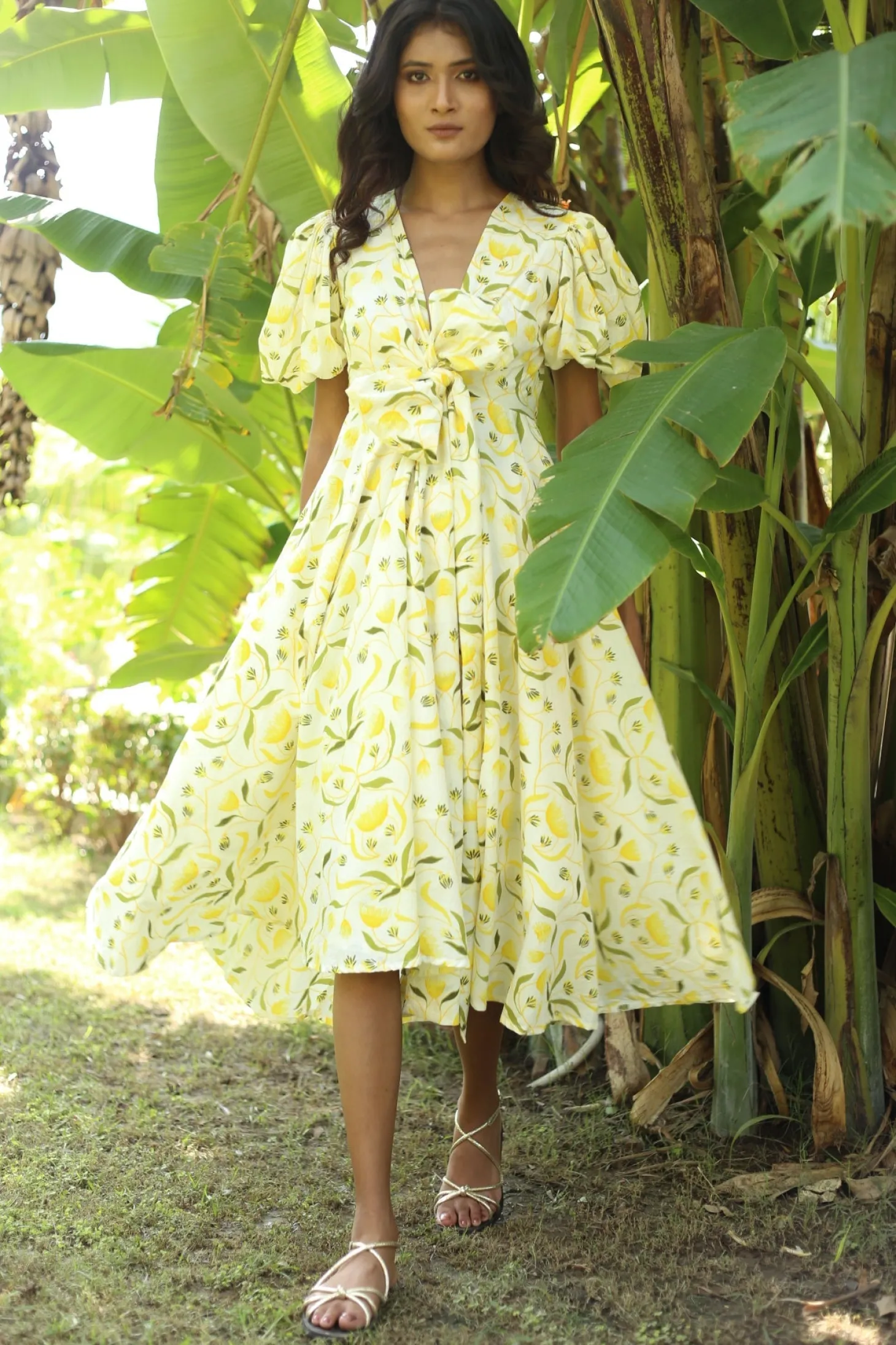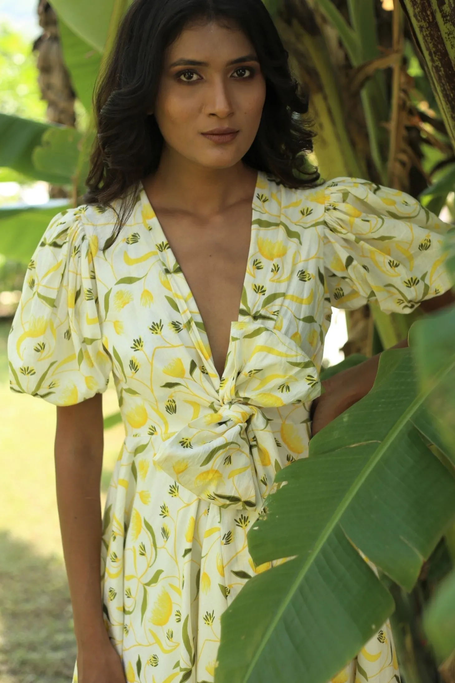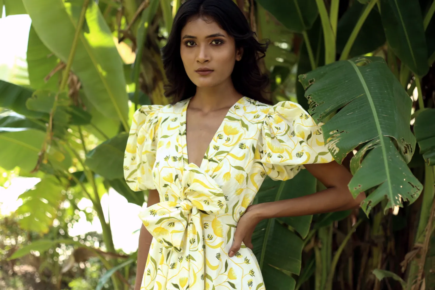 The easy-to-wear Lola wrap dress fits every body shape beautifully. The dress can be wrapped with an oversized bow in the front or with a simple knot in the back. Lola showcases a floral print pattern which inspired by the lush Mangroves growing along Goa’s Mandovi river. The artwork is hand-screen-printed.