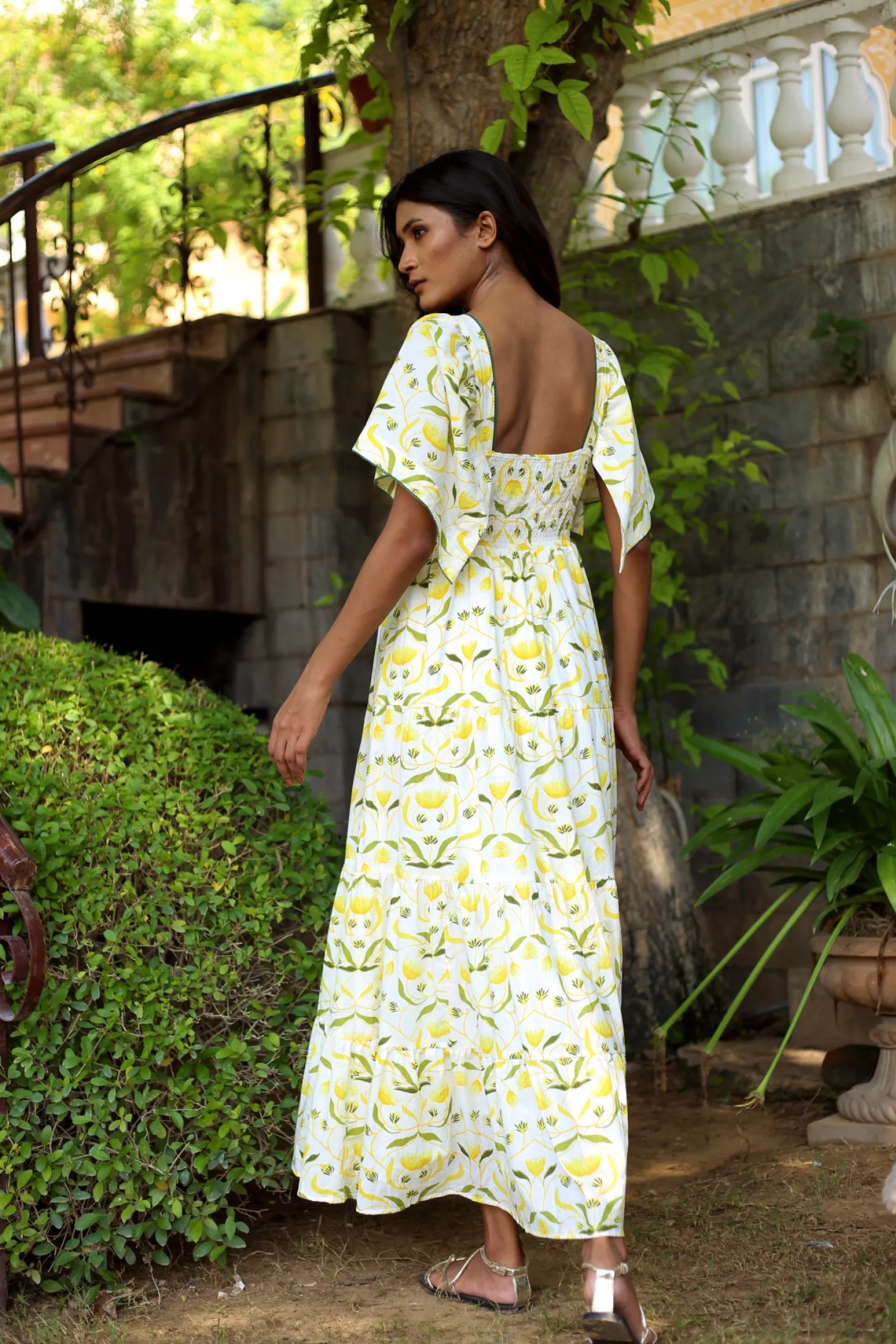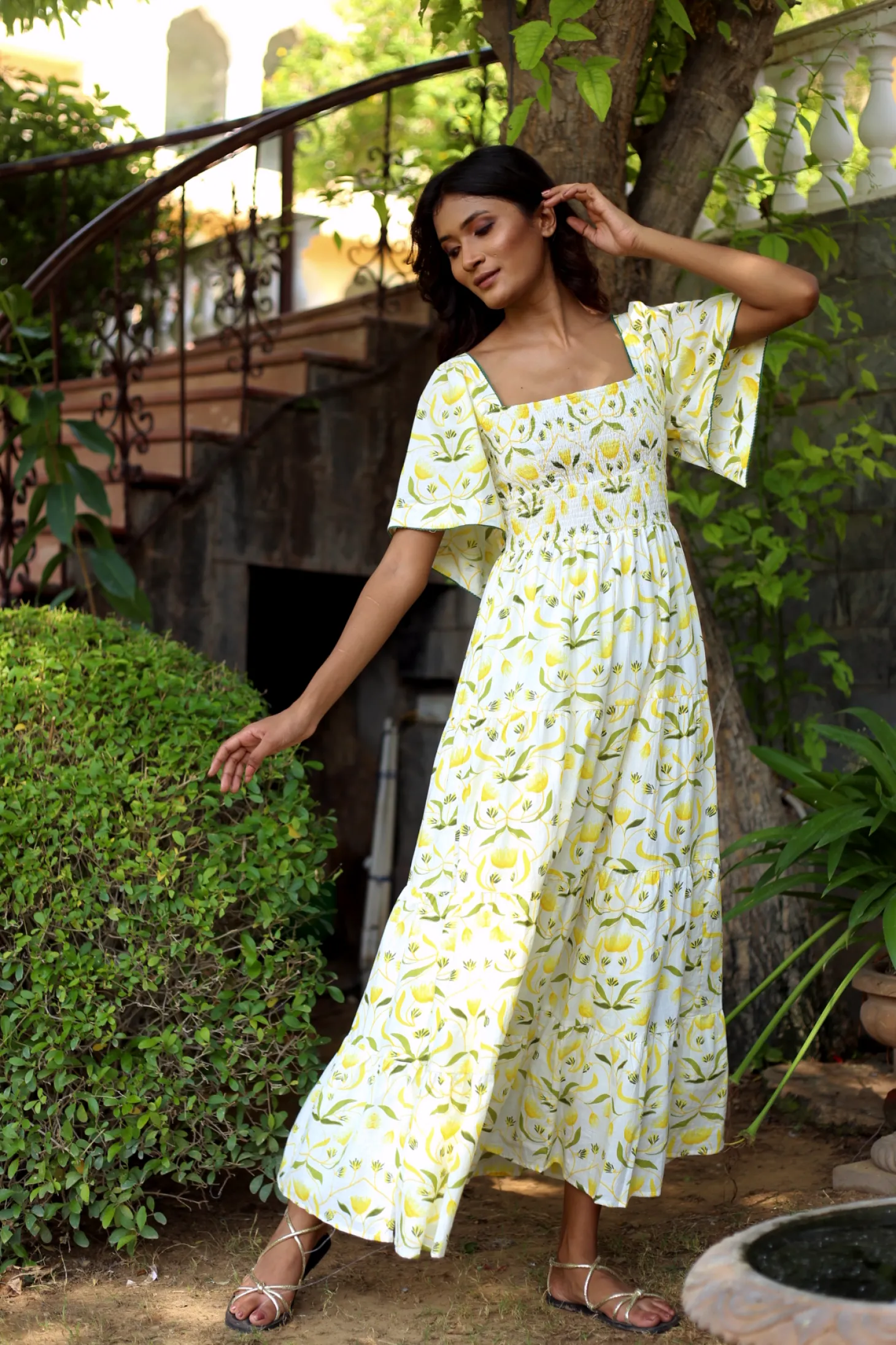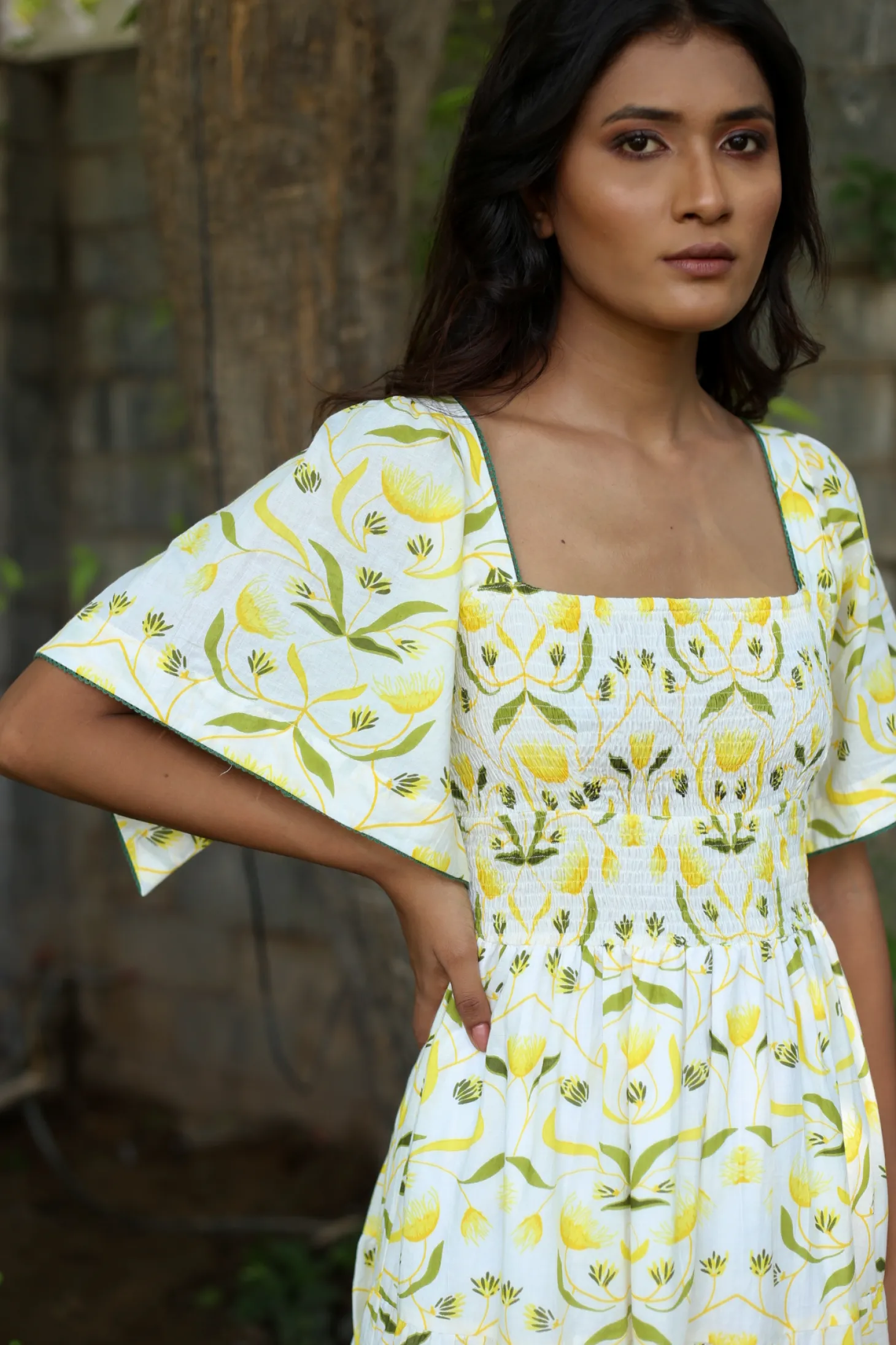 The Rosie dress is crafted from 100% cotton and showcases delicate lace details on the shoulders. The floral print pattern is inspired by the lush Mangroves growing along Goa’s Mandovi river. The artwork is hand-screen printed.